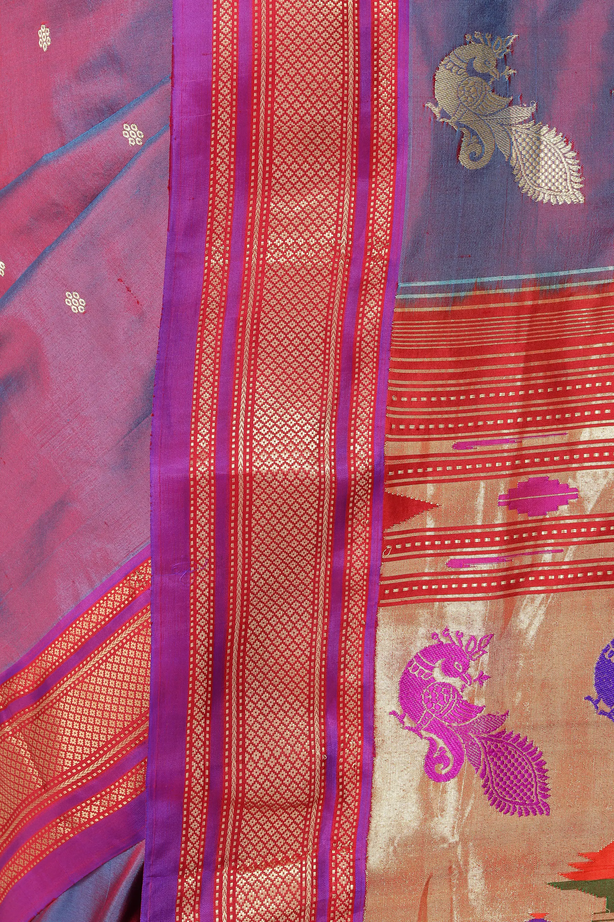 Lilac-Rose and Purple Paithani Sari with Hand-Woven Border and Peacocks on Pallu