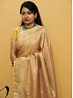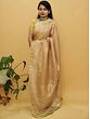 The soft and regal shimmer of Tanchui silk becomes queenly in this Lily-Green Silk Banarasi Saree which is ornamented with exquisite Mughal Meenakari done with glimmering silk and Zari threads. The muted tone of the saree's field becomes lively with the floral patterns blossoming all over it.