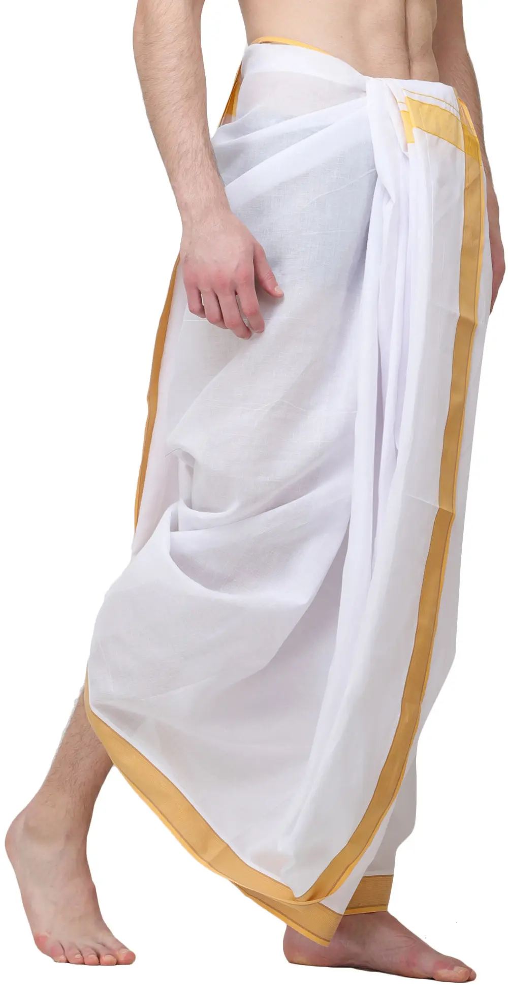 Experience the epitome of traditional Indian attire with this exquisite dhoti, crafted from the finest pure cotton. Designed for comfort and style, this garment embodies a rich cultural heritage, perfect for a range of occasions, from religious ceremonies and cultural festivals to casual gatherings. The breathable pure cotton fabric ensures a light and airy feel, keeping you comfortable throughout the day, even in warmer climates. Its natural fibers offer a soft touch against the skin, making it a pleasure to wear. ––––––––––