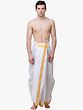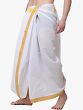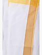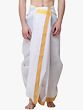What sets this dhoti apart is its sophisticated detailing. The pristine lily-white fabric serves as a canvas for a beautifully woven yellow striped border. This vibrant yet tasteful border adds a touch of regality and visual interest, elevating the classic dhoti silhouette. The golden yellow hue of the stripes complements the white fabric, creating a harmonious and elegant contrast. This thoughtful design element makes the dhoti suitable for more formal events while maintaining its traditional charm. The meticulous weaving of the border speaks to the quality craftsmanship and attention to detail that has gone into creating this piece. ––––––––––
