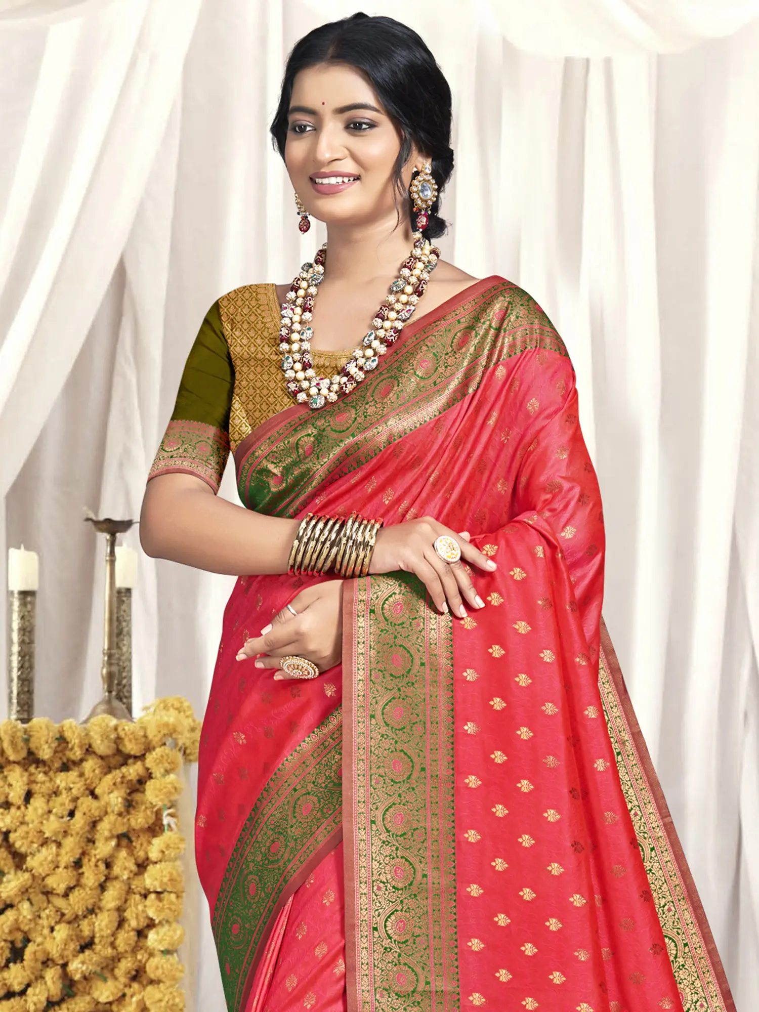 This saree is more than just an outfit; it’s an embodiment of elegance, tradition, and sophistication. It's a garment that allows you to express your unique personality while celebrating your cultural heritage. This traditional saree is perfect for a bride, a wedding guest, or anyone looking to make a memorable fashion statement. Embrace the beauty of tradition with this stunning piece. Order yours today and experience the unparalleled beauty and quality.