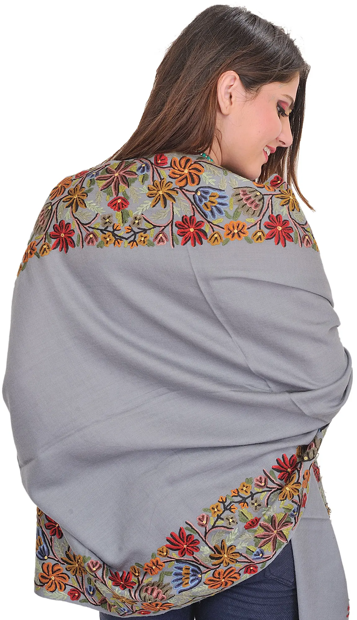 Limestone-Gray Stole from Kashmir with Aari Hand-Embroidered Flowers on Border
