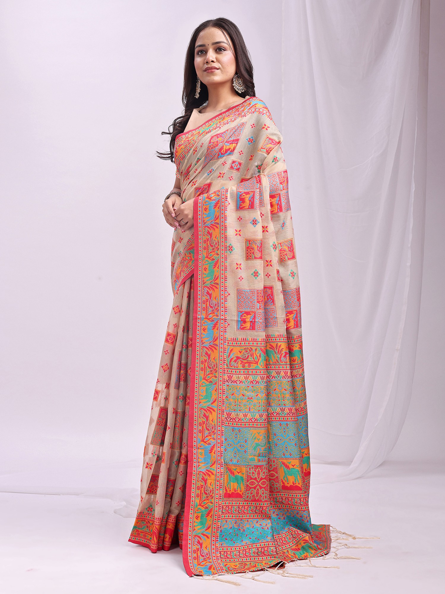 Discover the beauty of handcrafted elegance with this saree, a fusion of classic techniques and contemporary style. This piece showcases the artistry of weaving, blending the breathability of linen with the comfort of cotton to create a garment that is both luxurious and easy to wear. The lightweight and airy fabric drapes gracefully, ensuring comfort throughout the day.