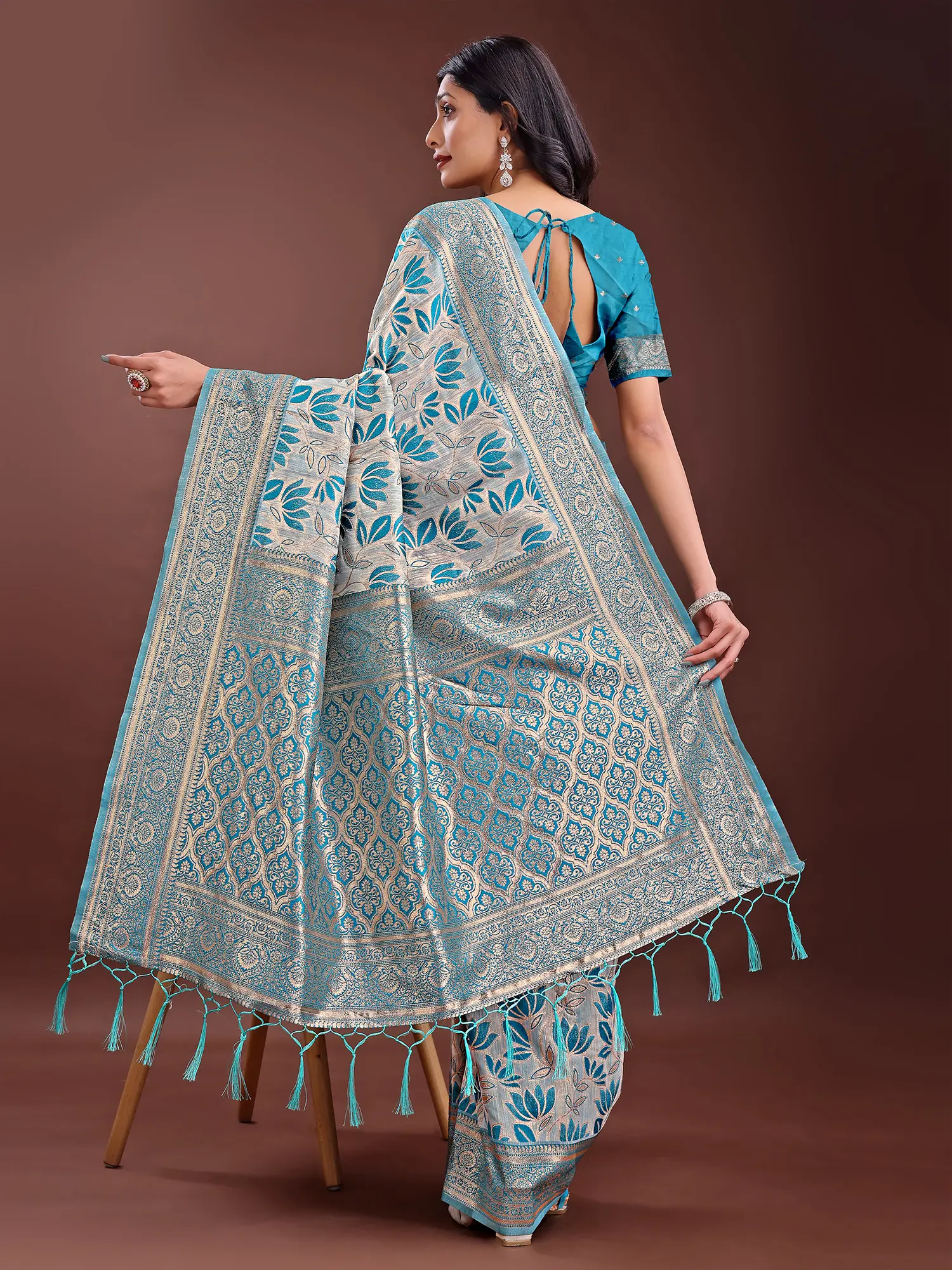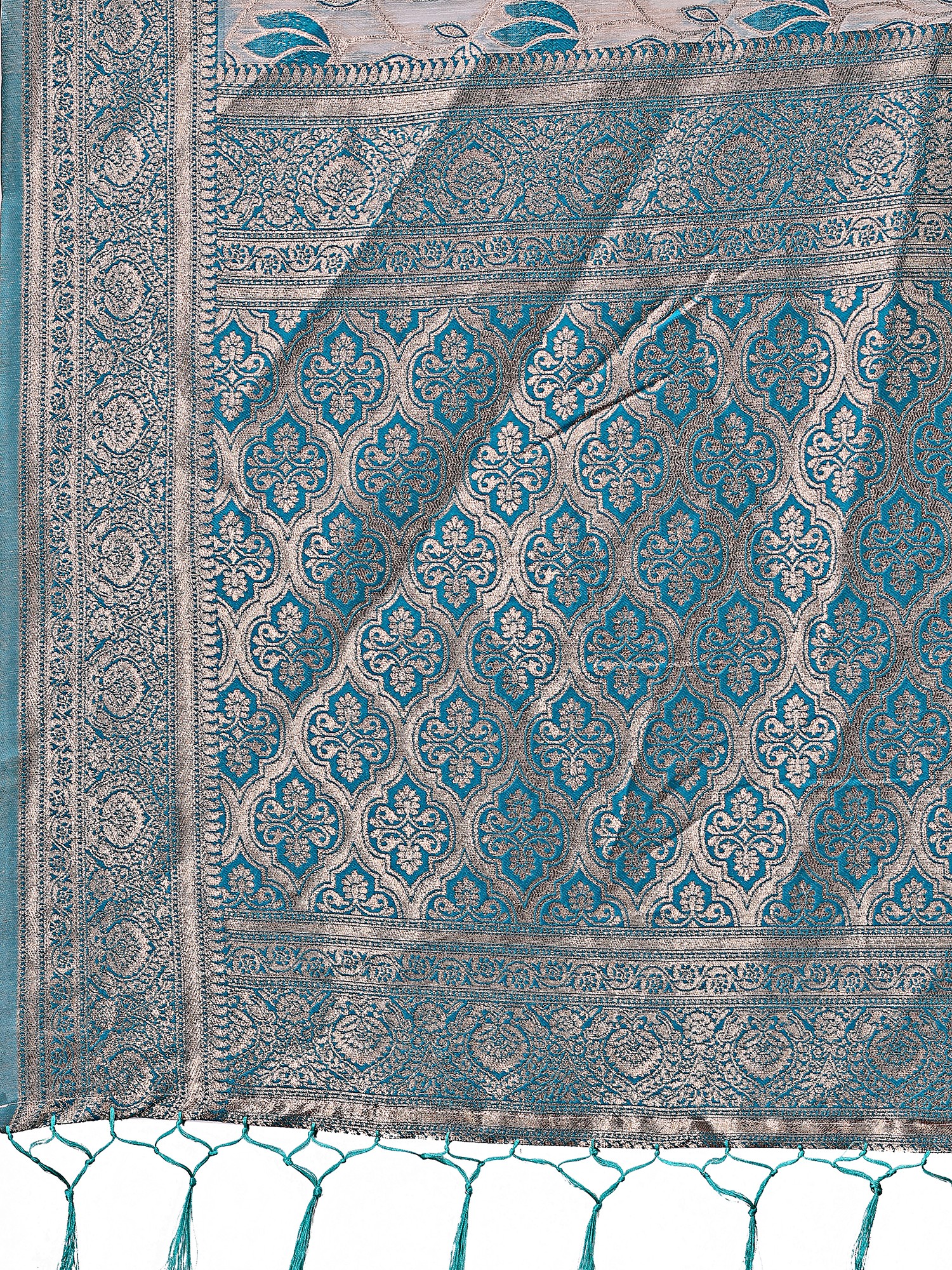 Kanji Cotton Sari from Tamil Nadu with Woven Peacock Feathers All-Over