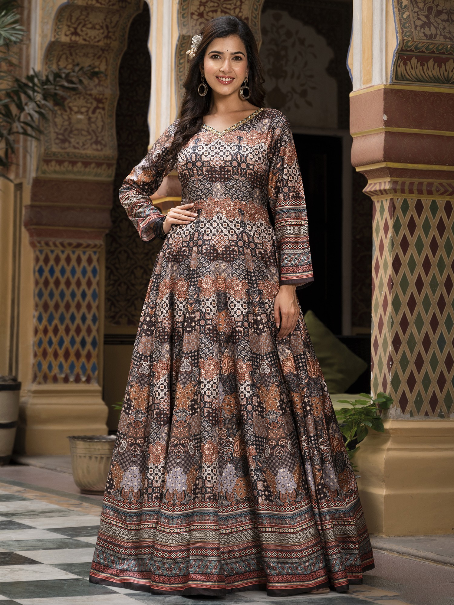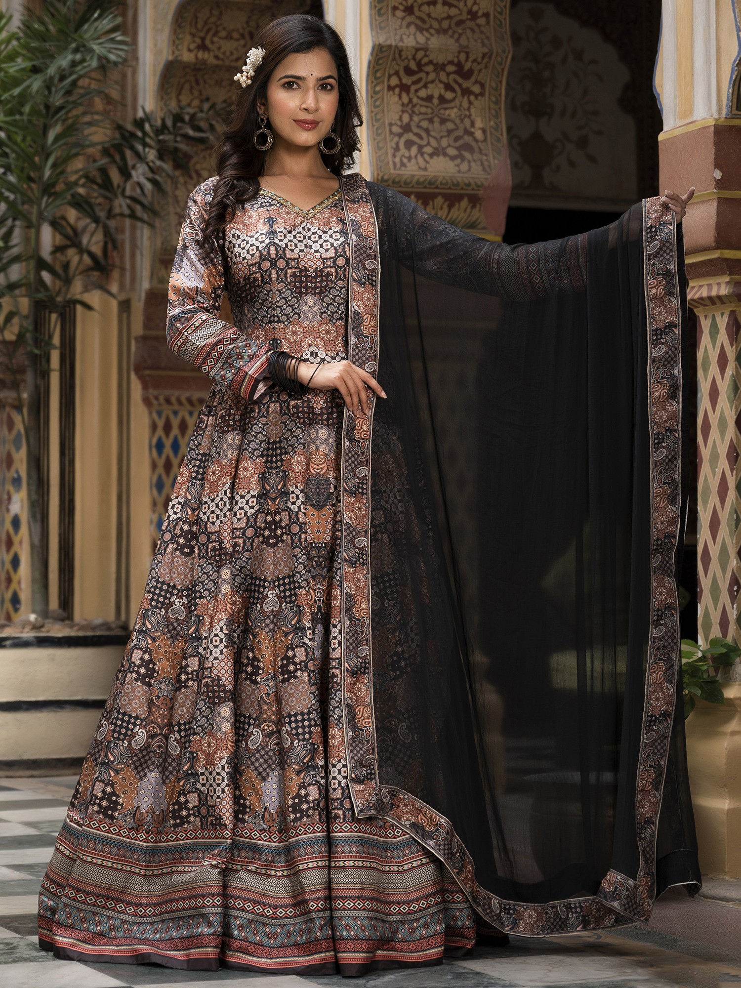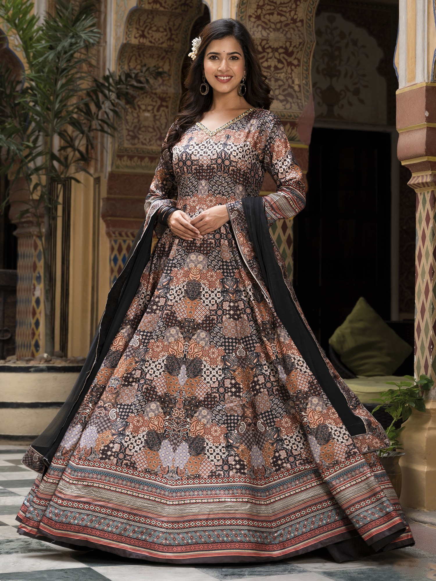 Step into a world of sophisticated charm with this gown designed to make you the star of any festive occasion. The exquisite digital print work adorning the Dola Silk fabric creates a mesmerizing visual tapestry, drawing the eye with its intricate details and rich color palette. This ensemble isn't just clothing; it's a statement of refined taste and cultural appreciation. The flared silhouette adds a touch of graceful movement, ensuring you'll turn heads with every step. The luxurious feel of the Dola Silk against your skin will make you feel as good as you look. This gown is perfectly suited for weddings, parties, and other special celebrations where you want to radiate confidence and style.