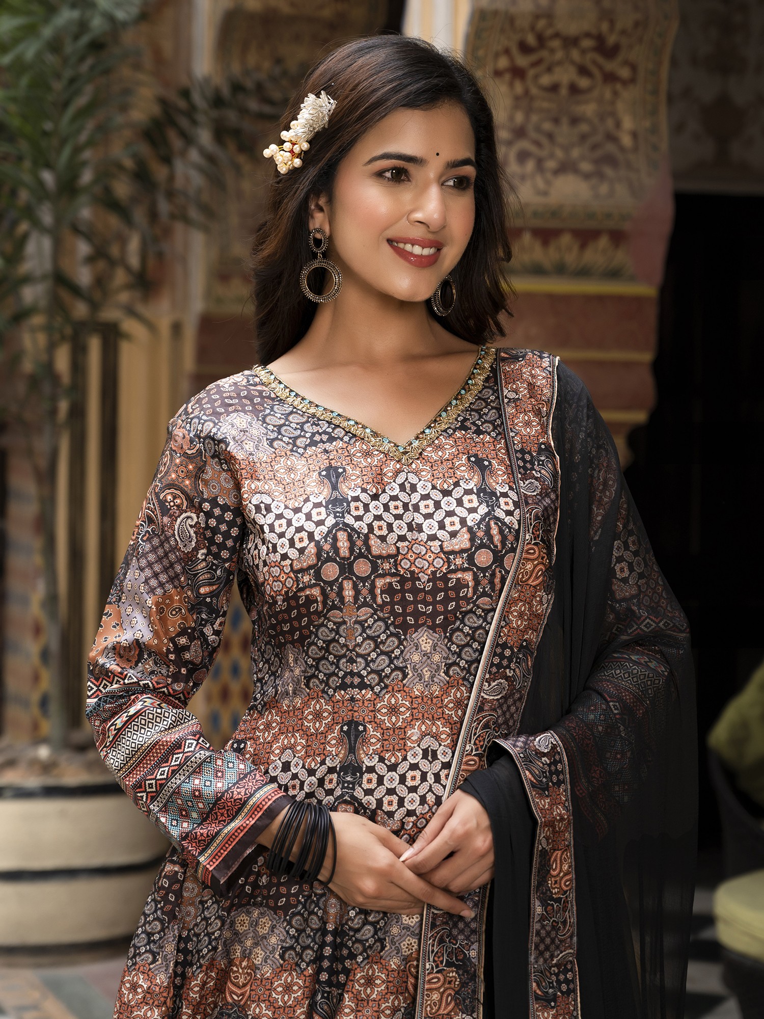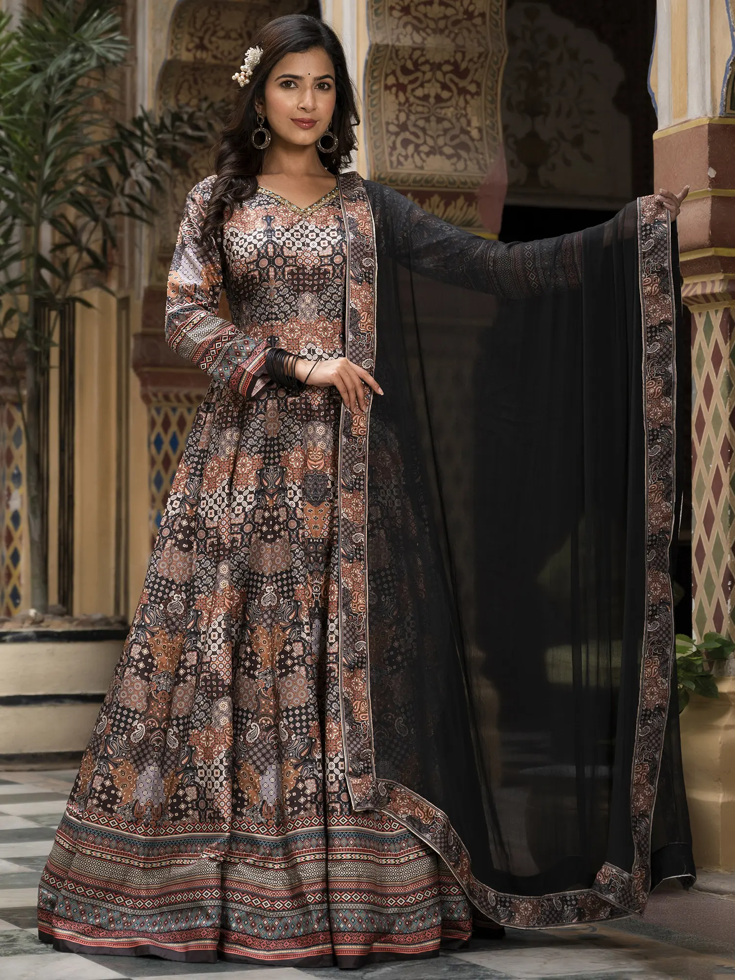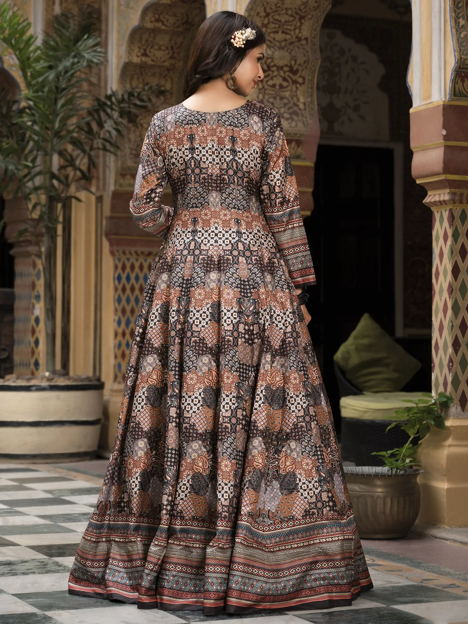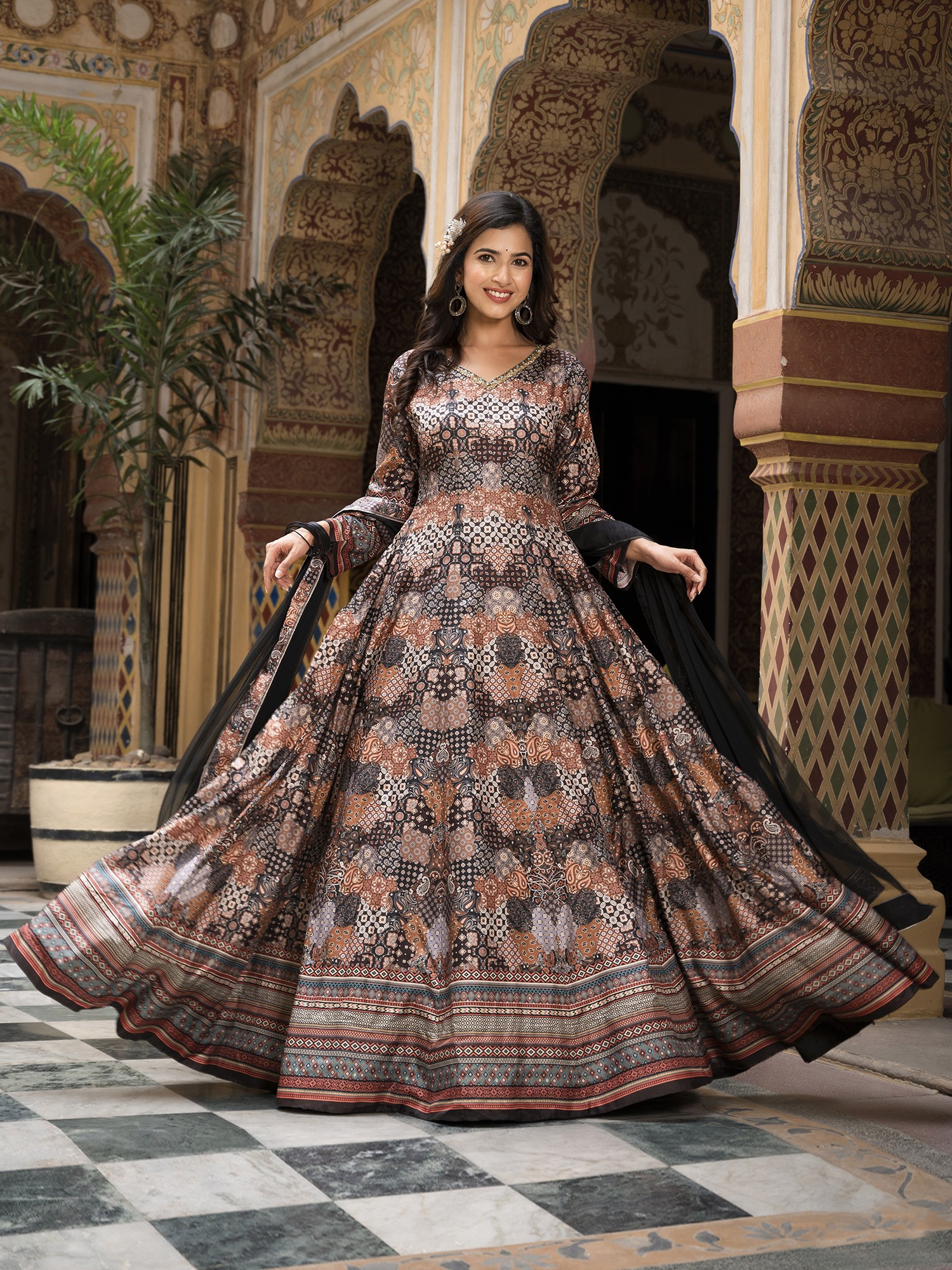 Step into a world of sophisticated charm with this gown designed to make you the star of any festive occasion. The exquisite digital print work adorning the Dola Silk fabric creates a mesmerizing visual tapestry, drawing the eye with its intricate details and rich color palette. This ensemble isn't just clothing; it's a statement of refined taste and cultural appreciation. The flared silhouette adds a touch of graceful movement, ensuring you'll turn heads with every step. The luxurious feel of the Dola Silk against your skin will make you feel as good as you look. This gown is perfectly suited for weddings, parties, and other special celebrations where you want to radiate confidence and style.
