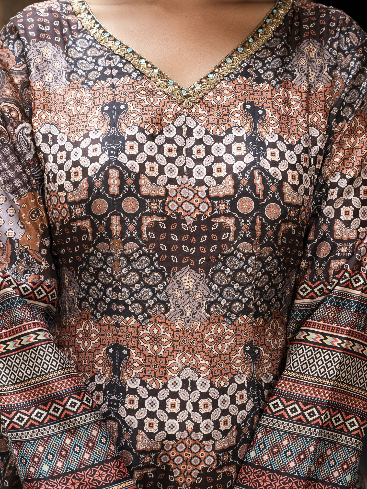 The beauty of this ethnic dress lies in the harmonious combination of texture, print, and silhouette. The digital print showcases a stunning array of motifs and patterns, lending a contemporary twist to traditional design. The V-neckline is carefully crafted, adding a touch of allure while maintaining an air of elegance. The full sleeves provide a comfortable and graceful look. This size #40 (Large) gown is designed to flatter, creating a flowing and flattering shape that will make you feel confident and poised.