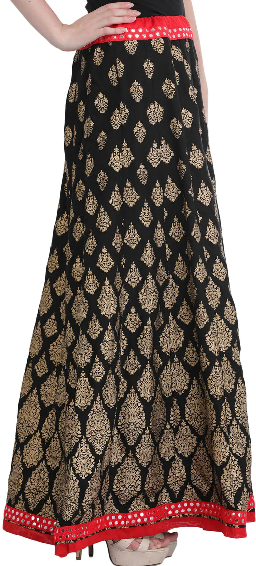 What truly elevates this ghagra is the playful interplay of textures and reflective elements. The deep black fabric is a perfect backdrop for the opulent gold print, creating a striking contrast that exudes sophistication. Adding a touch of playful charm, the hem of the skirt features a vibrant red border, intricately embellished with tiny mirrors. These mirrors, strategically placed, catch and reflect light with every movement, creating a dazzling effect that is both captivating and enchanting. This subtle yet impactful detailing transforms the skirt into a piece that truly sparkles.