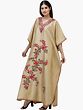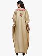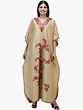 Kaftans are one of those traditional Indian wears, which have remained in fashion, all thanks to the unparalleled comfort they offer while remaining a luxurious attire. This art silk Kaftan, with its hushed and delicate fabric, has been perfectly used as the canvas for the colorful Aari work, by the craftsman of Kashmir, who have taken the bloom of spring from the lap of Kashmir valley and woven it into the soft fabric of this Kaftan. Beautiful floral vines on the neckline, floral branches blooming diagonally on the body and thin creepers on the hem make this Kaftan a remembrance of the natural beauty of Kashmir, which inspires the culture and fashion of the valley.