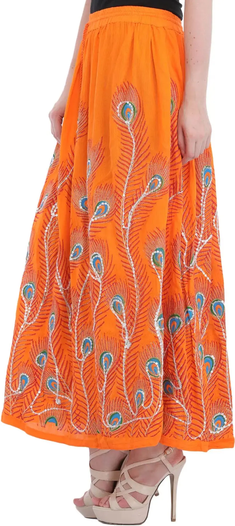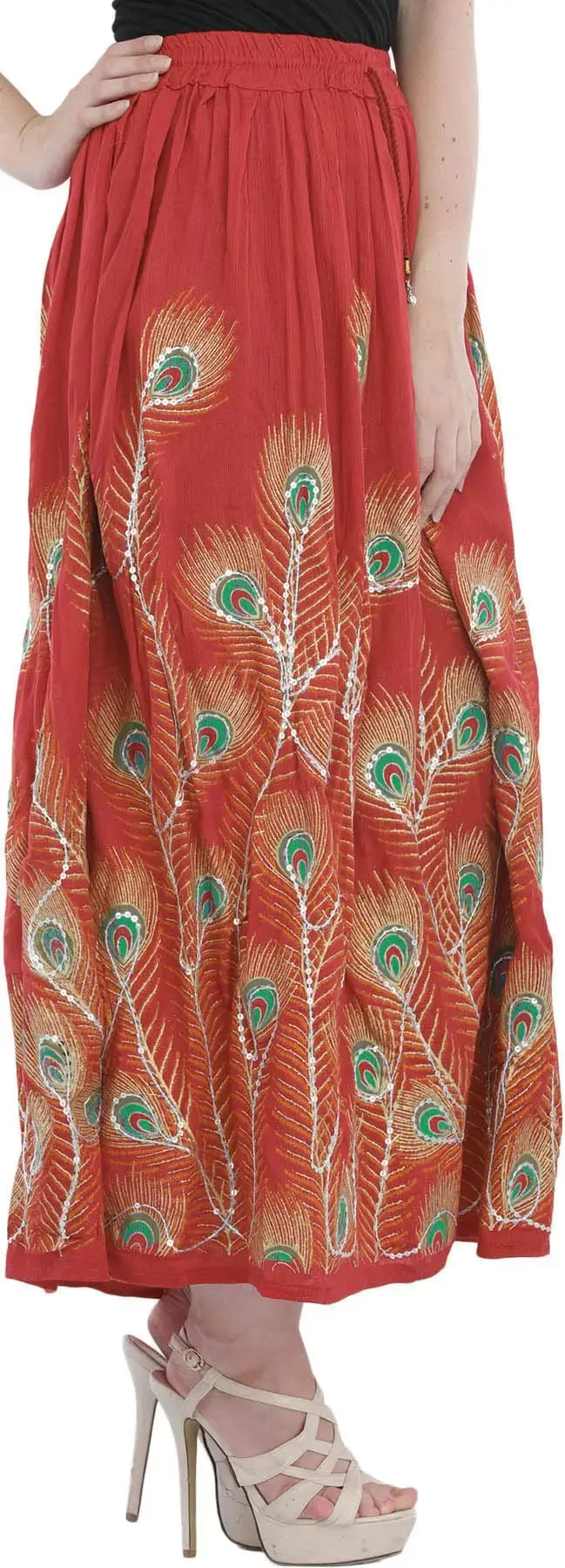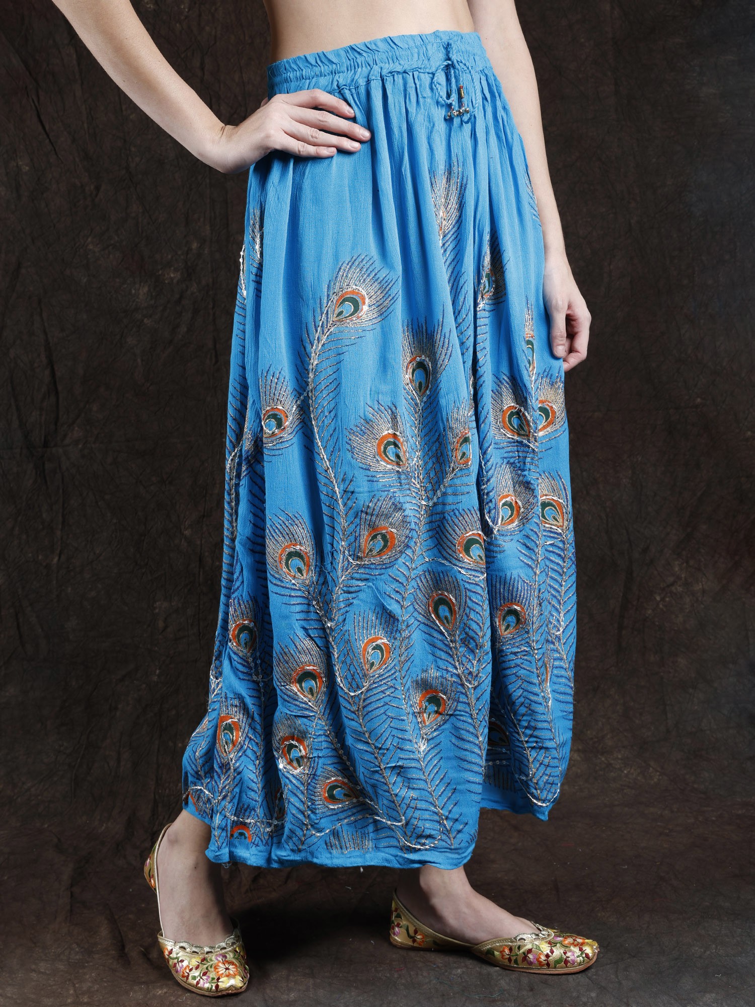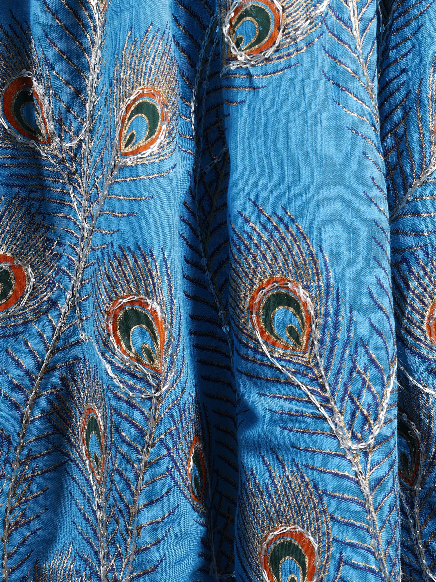 Elevate your style with a long skirt adorned with printed peacock feathers and delicately embroidered sequins. The peacock feathers and delicately embroidered sequins. The peacock feather prints add a touch of grace, while the embroidered sequins bring a subtle hint of glamour to the ensemble. Embrace the beauty of peacock feather prints and sequins for a look that captures attention with its unique and enchanting appeal.