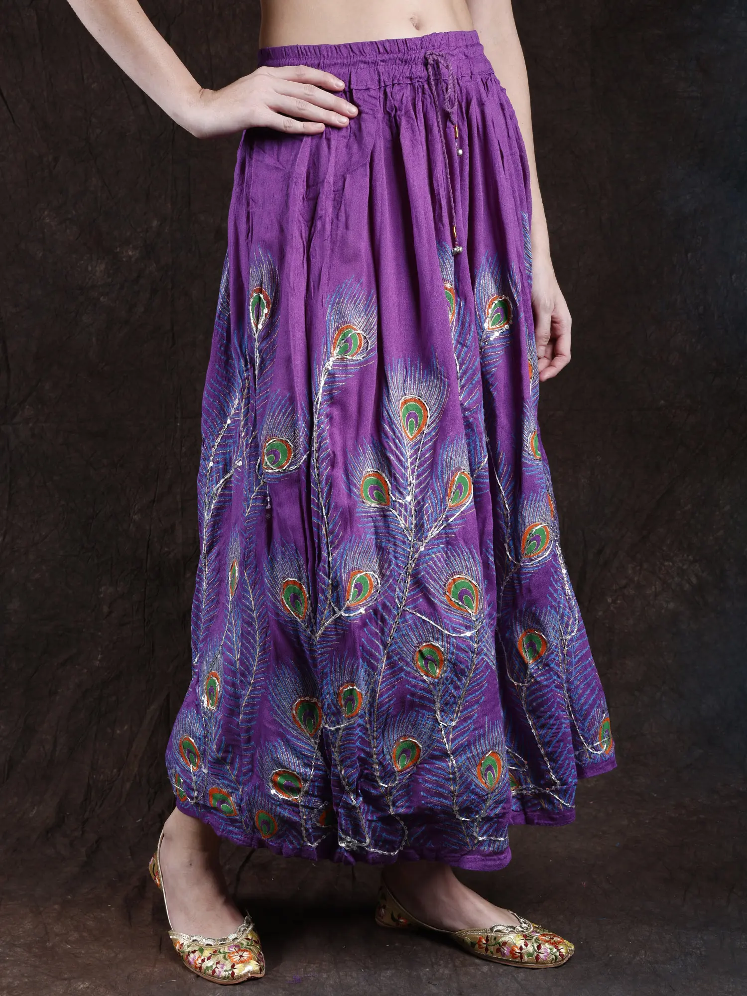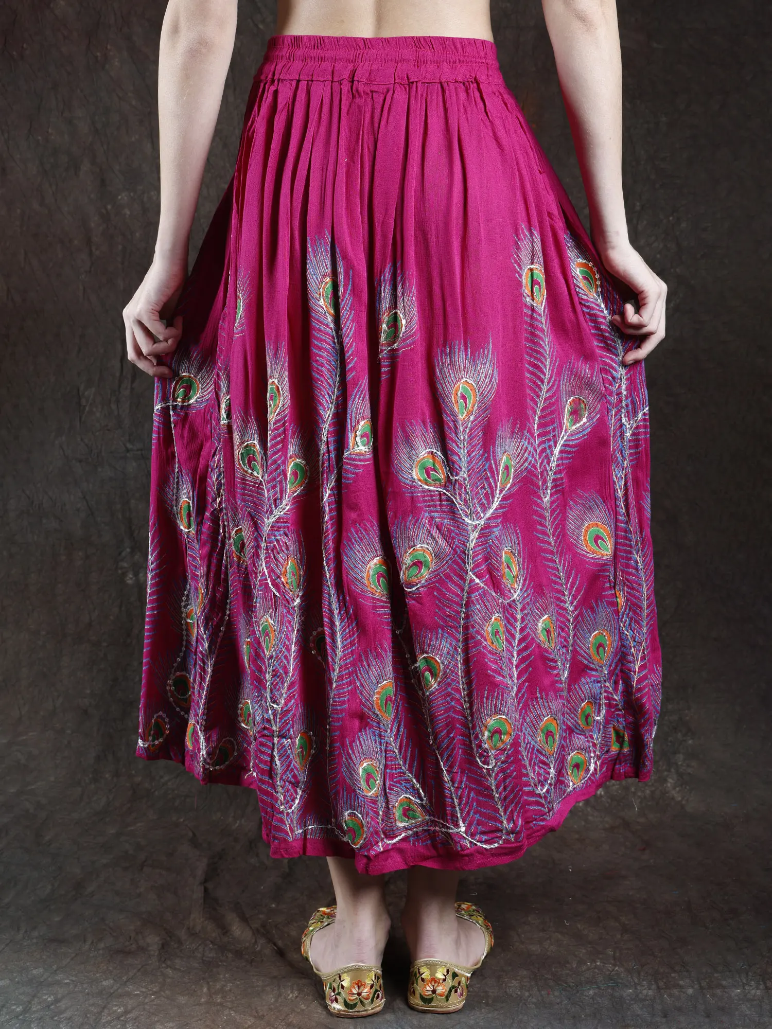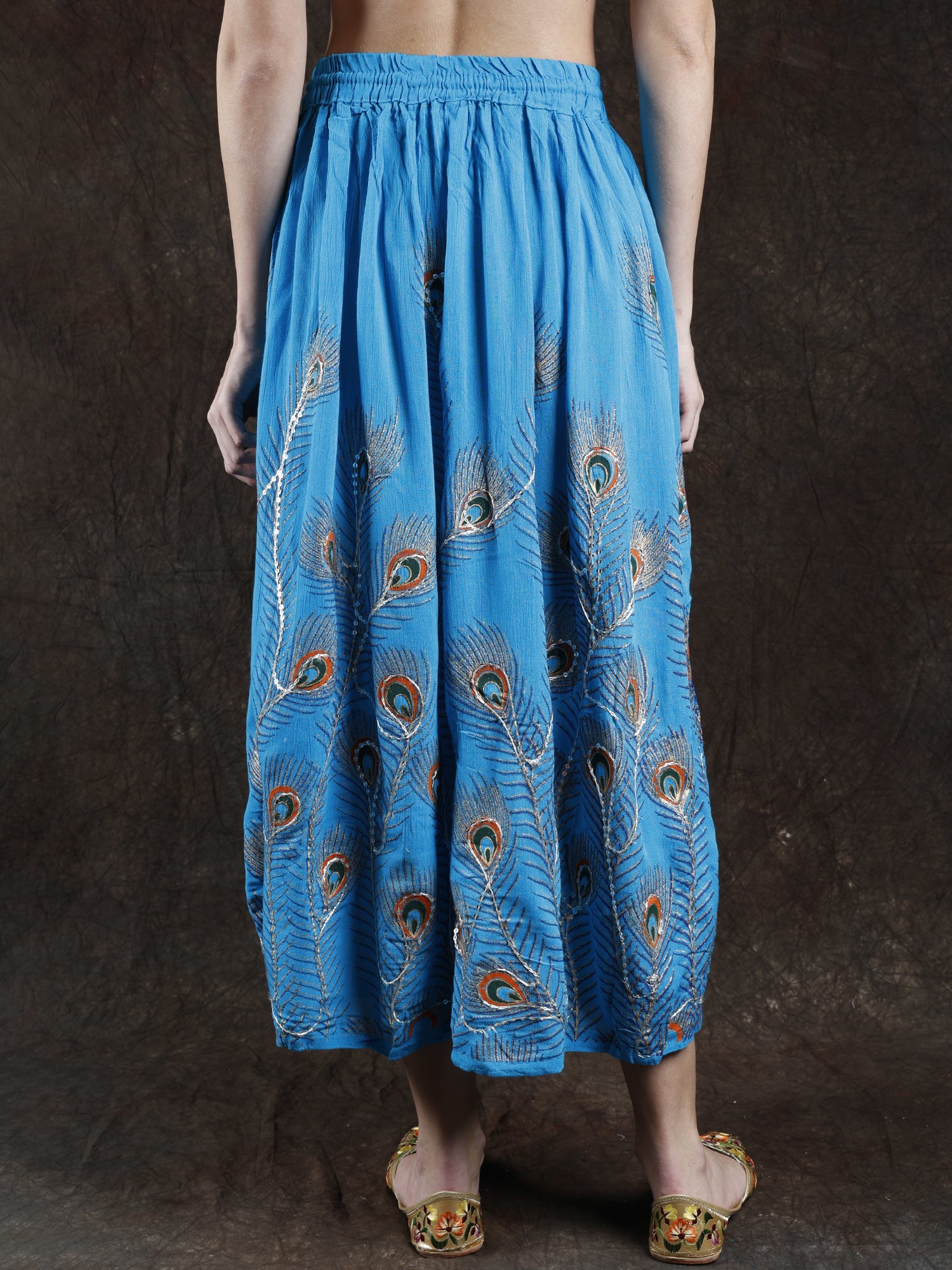 Elevate your style with a long skirt adorned with printed peacock feathers and delicately embroidered sequins. The peacock feathers and delicately embroidered sequins. The peacock feather prints add a touch of grace, while the embroidered sequins bring a subtle hint of glamour to the ensemble. Embrace the beauty of peacock feather prints and sequins for a look that captures attention with its unique and enchanting appeal.