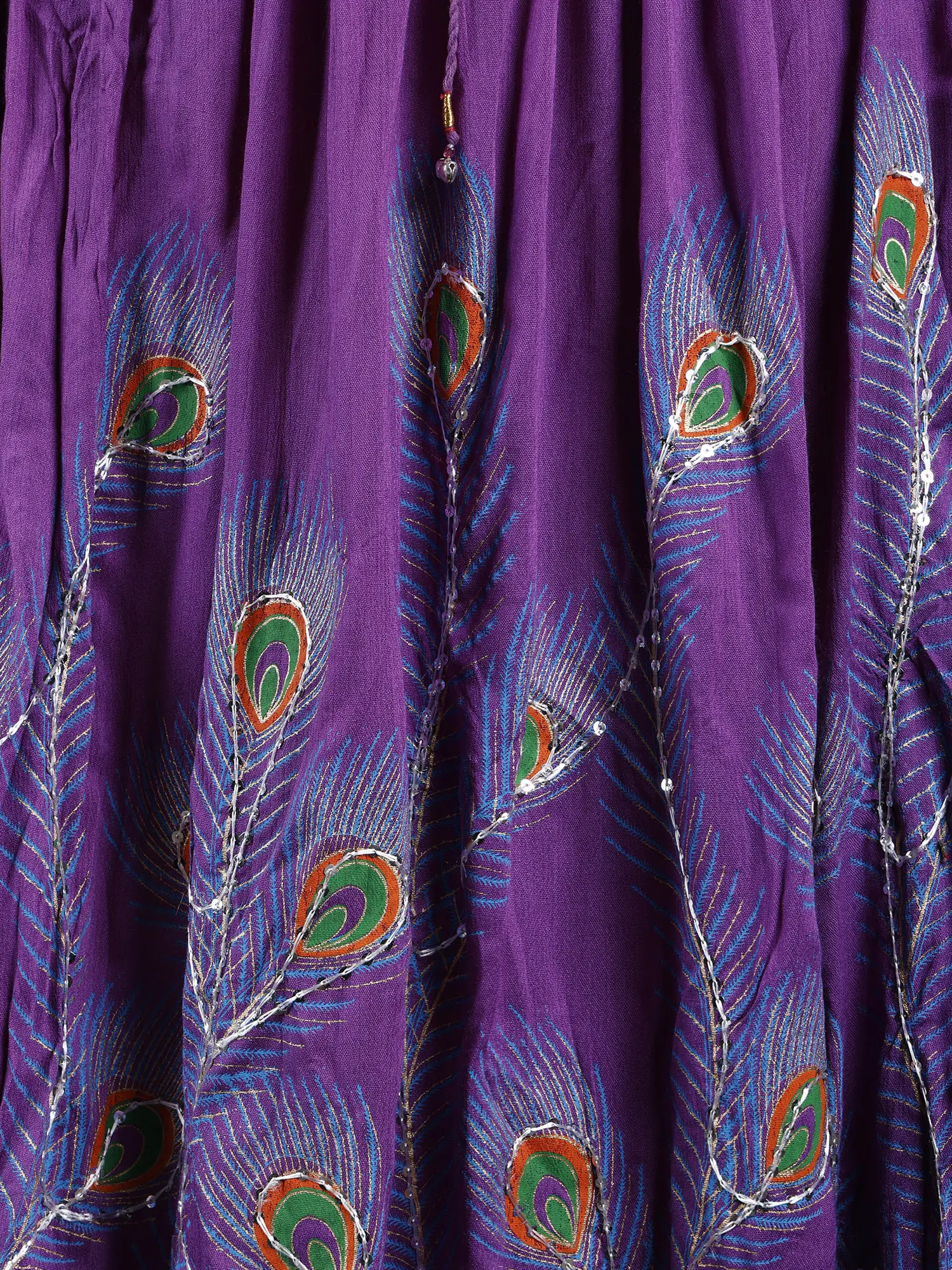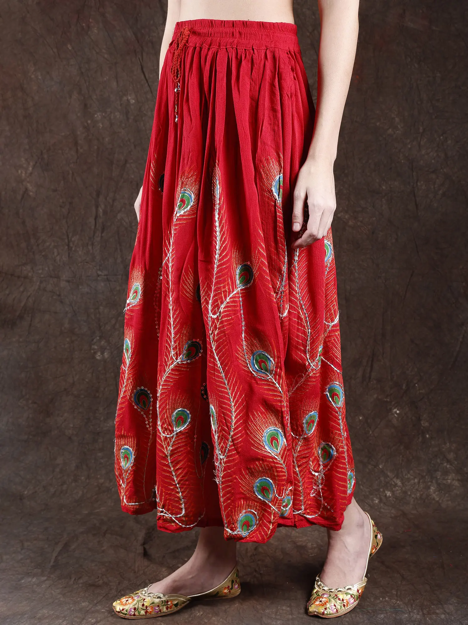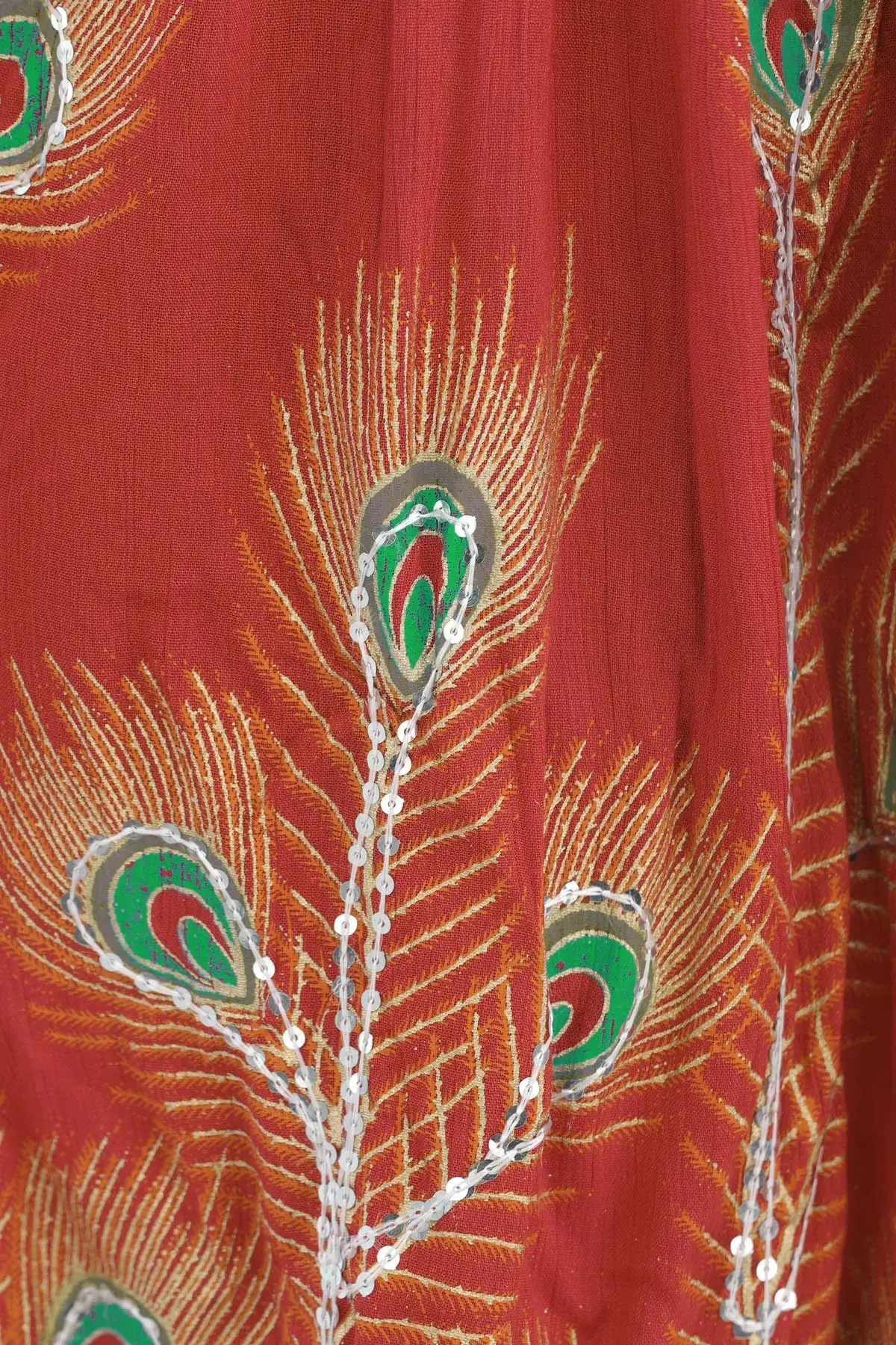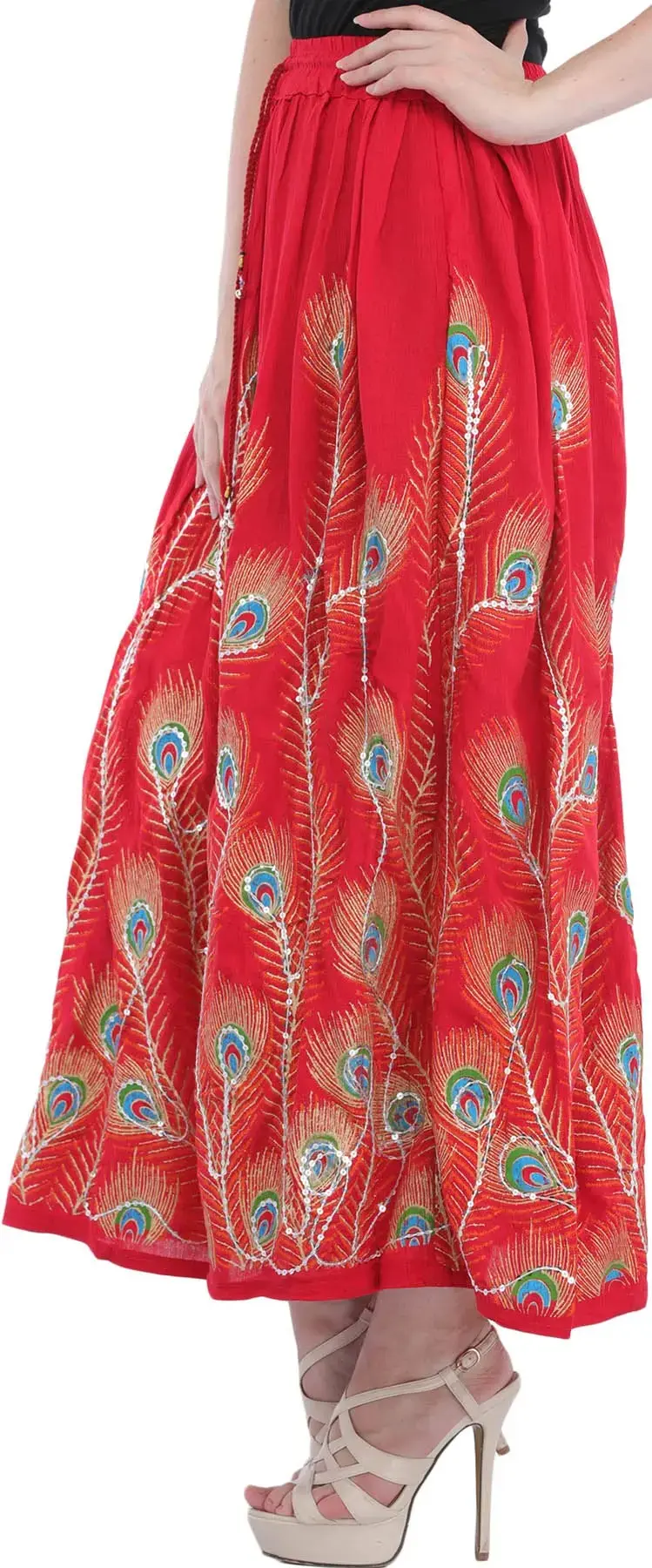 Elevate your style with a long skirt adorned with printed peacock feathers and delicately embroidered sequins. The peacock feathers and delicately embroidered sequins. The peacock feather prints add a touch of grace, while the embroidered sequins bring a subtle hint of glamour to the ensemble. Embrace the beauty of peacock feather prints and sequins for a look that captures attention with its unique and enchanting appeal.