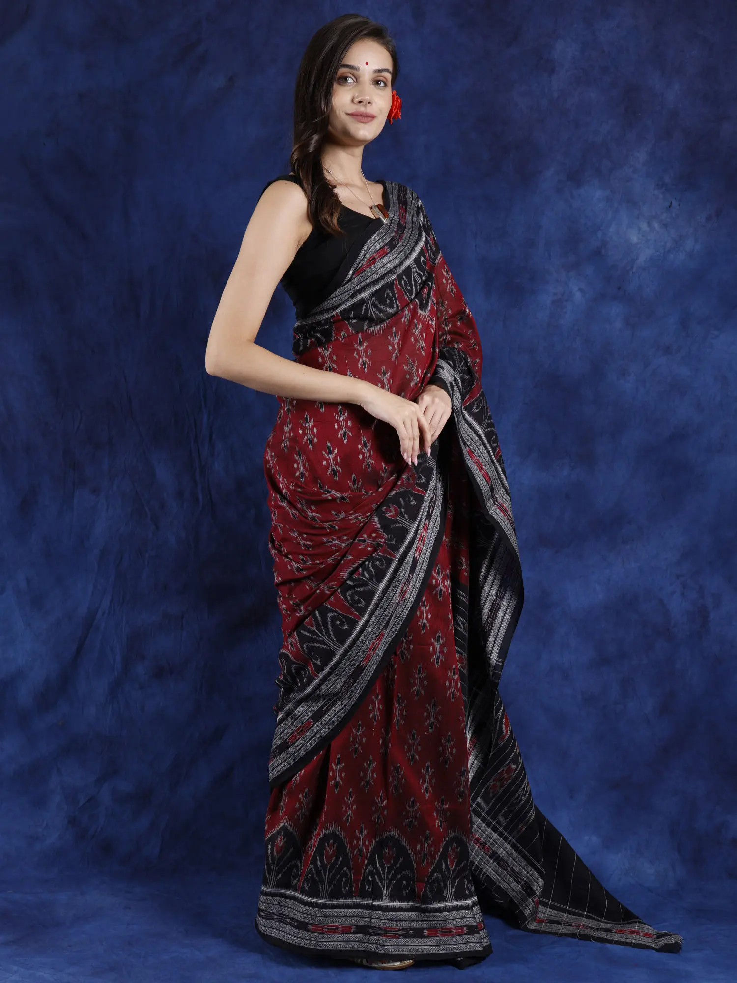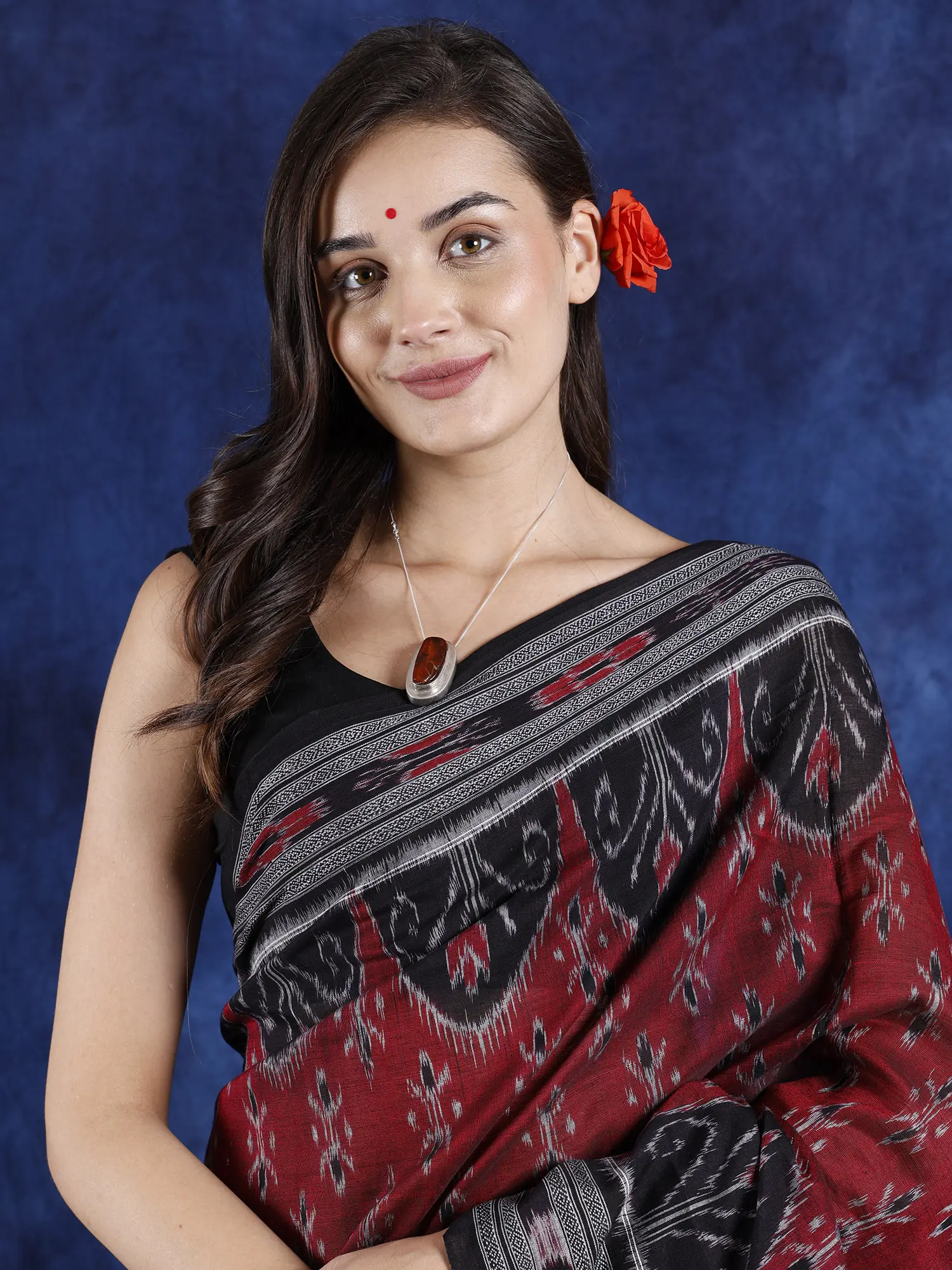 Lovesome Jester Red Pure Cotton Sambalpuri Saree with Black Onyx Tribal Ikat Border