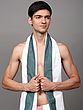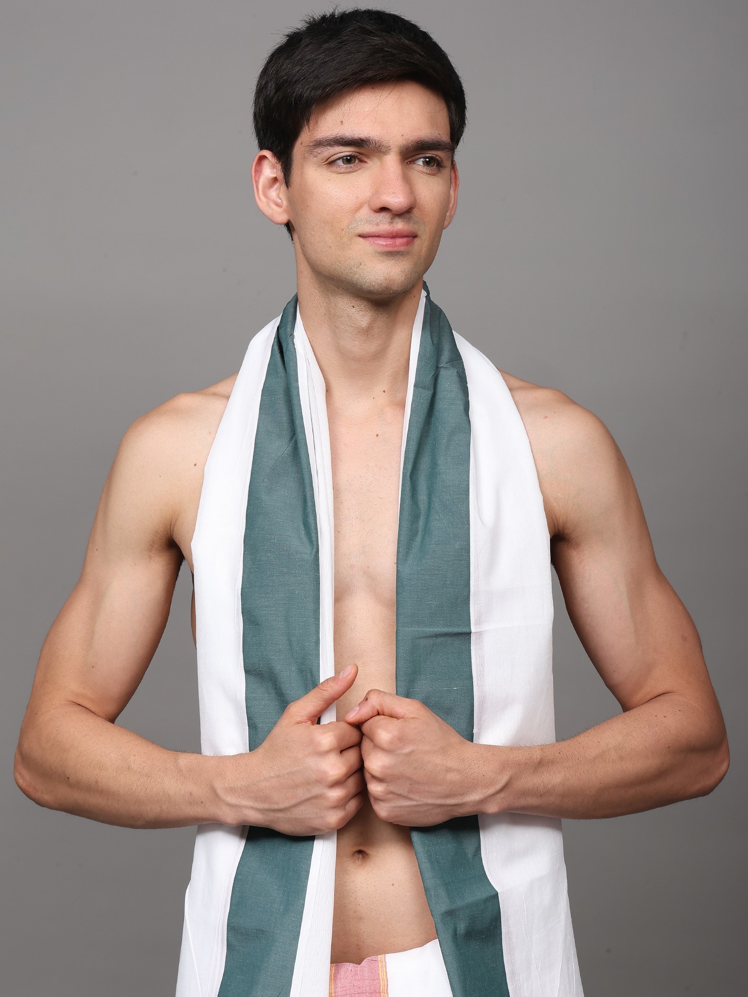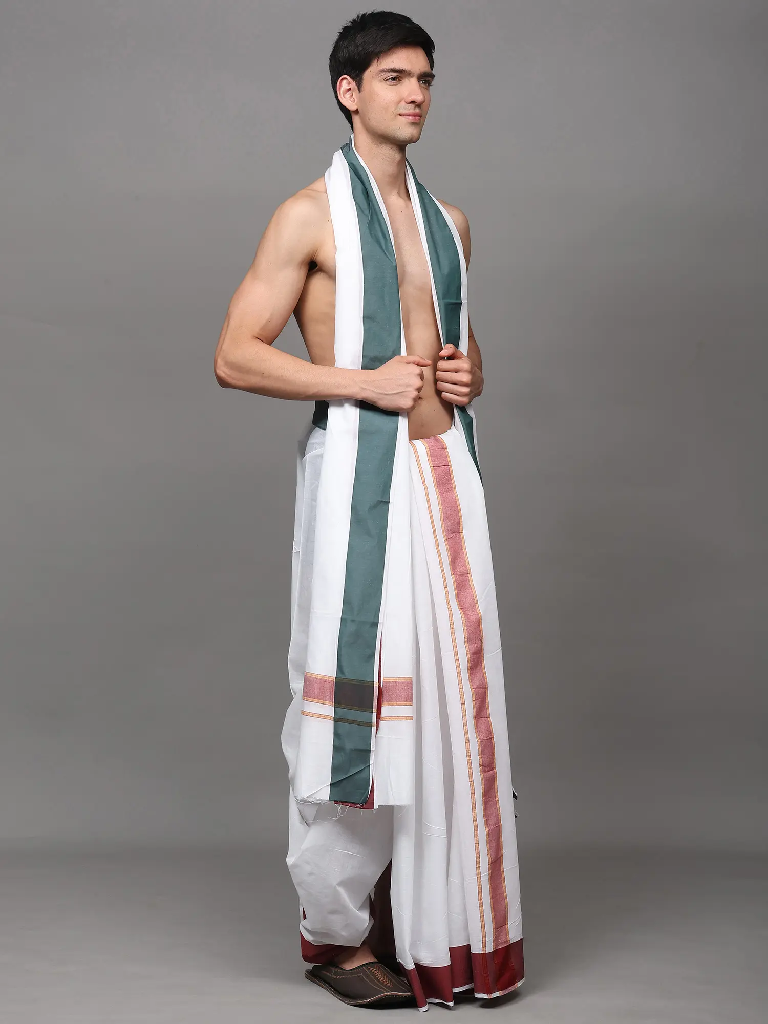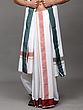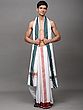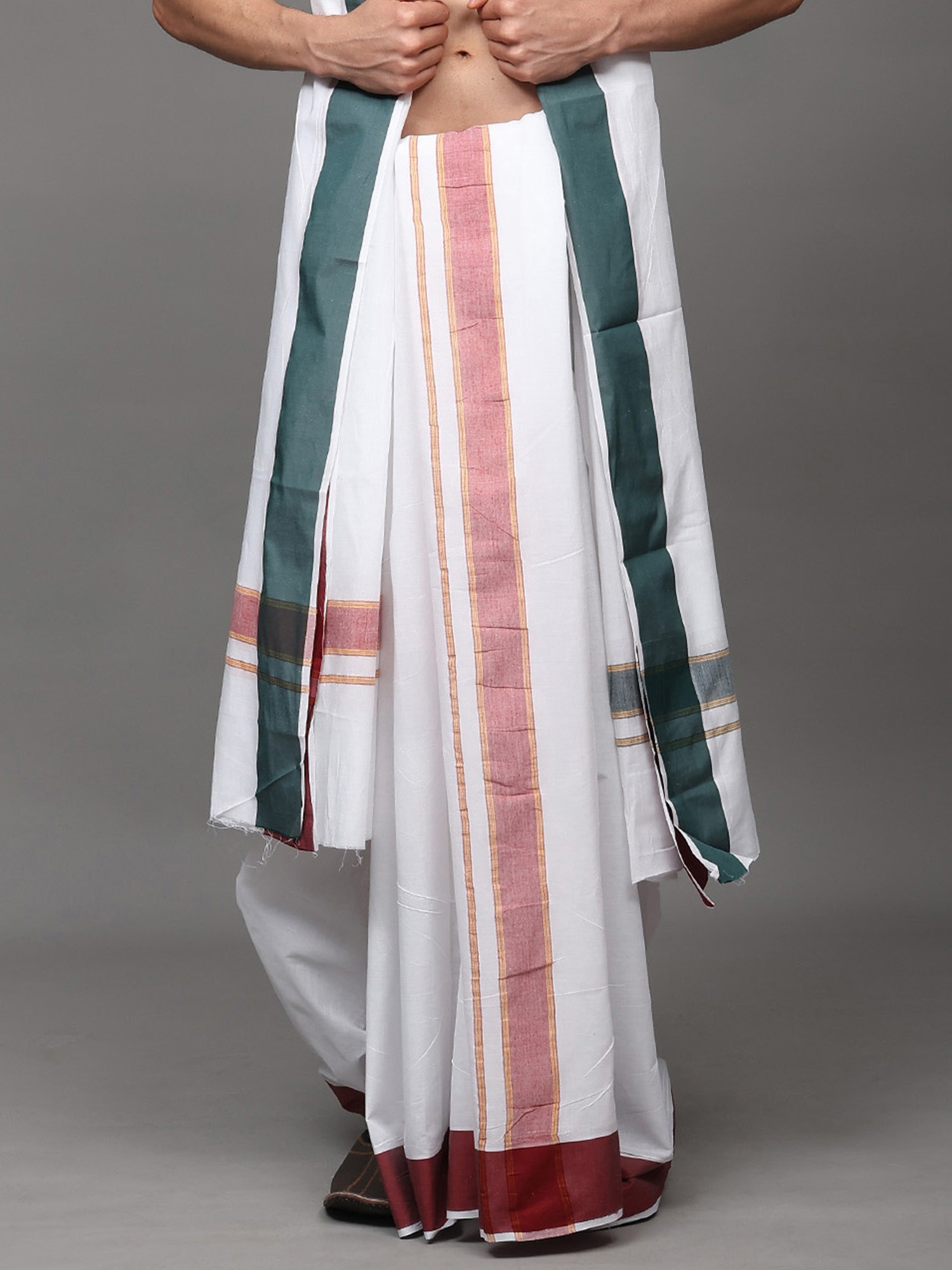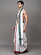 Off-White Plain Drape Dhoti and Angavastram Set with Striped Border