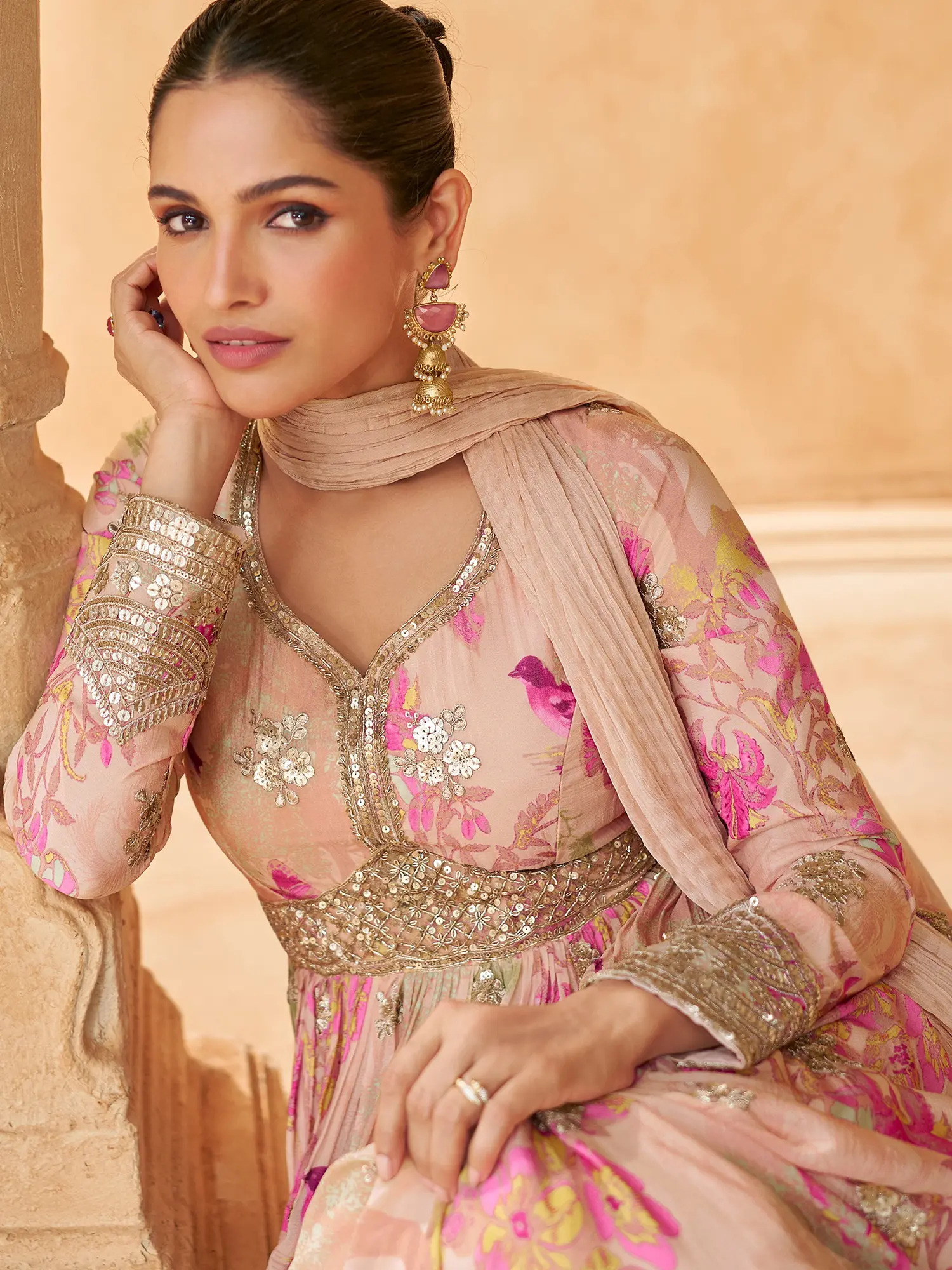 The soft, muted base of the gown is a canvas for a vibrant, meticulously rendered floral and avian motif. Delicate sequins are interspersed throughout the embroidery, catching the light with every movement and adding a subtle shimmer. The neckline is gracefully shaped, leading into full sleeves that are also adorned with exquisite detailing at the cuffs, drawing the eye upwards. A beautifully embellished belt cinches the waist, accentuating your silhouette and adding a touch of regal grandeur. The accompanying Nazmeen dupatta, in a complementary shade, is edged with a delicate border, mirroring the opulence of the gown.