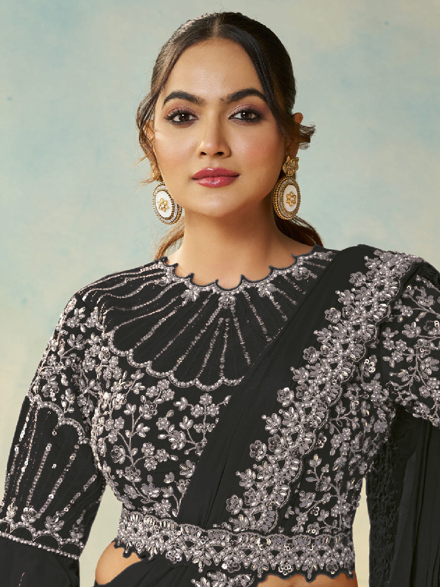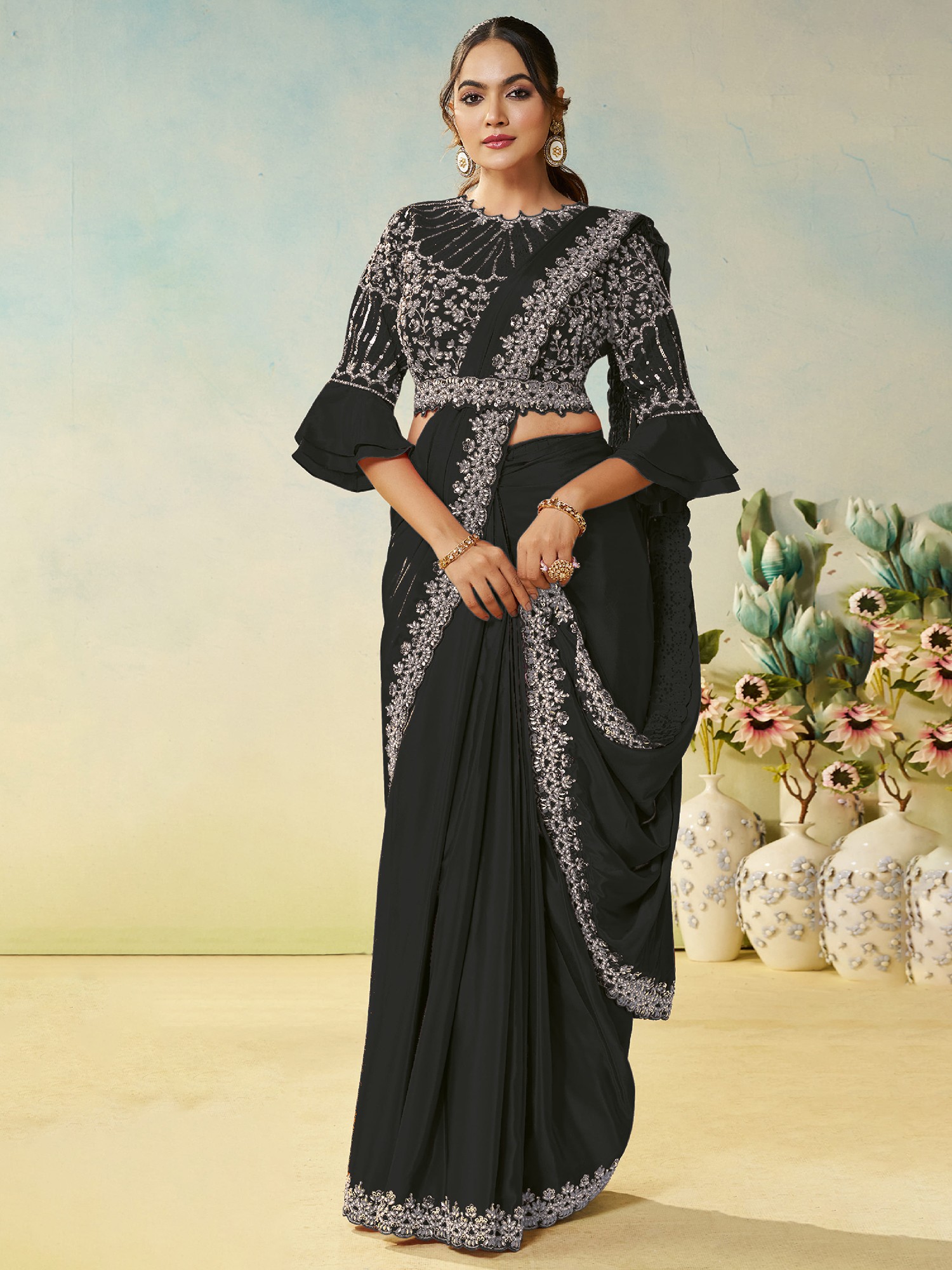 Exquisite Satin Silk Saree With Elegant Embroidery And Silver Stone Handwork With Stitched Organza Blouse