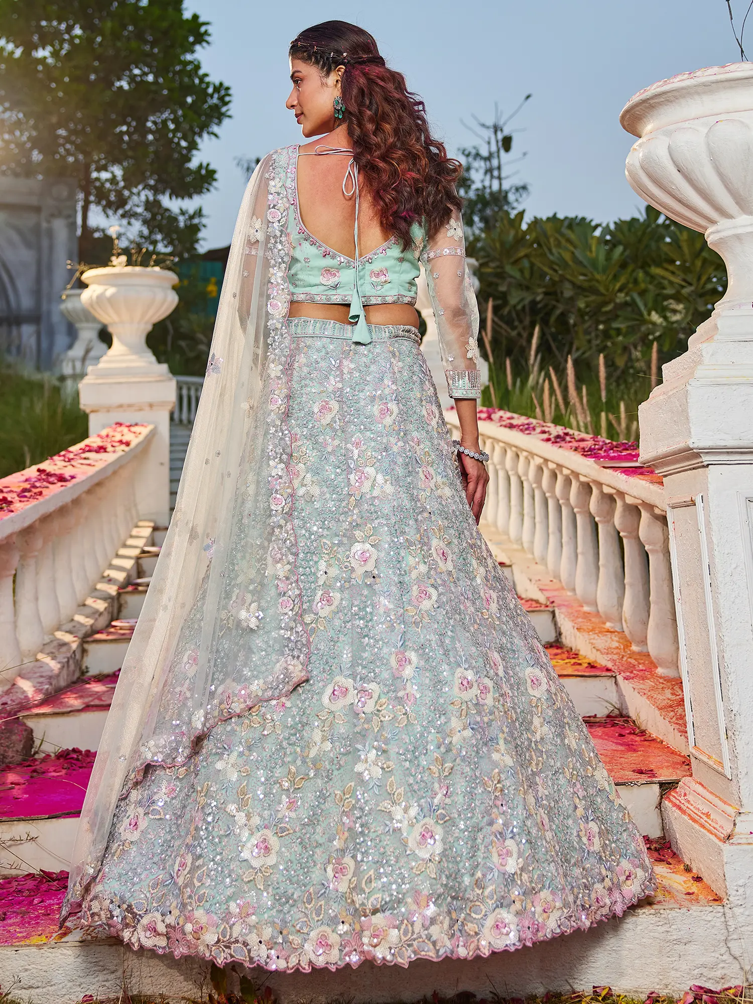 The delicate aqua hue serves as a canvas for a breathtaking floral symphony, where blush pinks and soft whites bloom amidst a scattering of iridescent sequins. The flowing skirt cascades with opulent volume, while the intricately embroidered choli offers a flattering silhouette. The accompanying dupatta, sheer and adorned with complementary detailing, adds the perfect final flourish. This creation is available in size #34 (XS), designed to enhance your natural beauty.