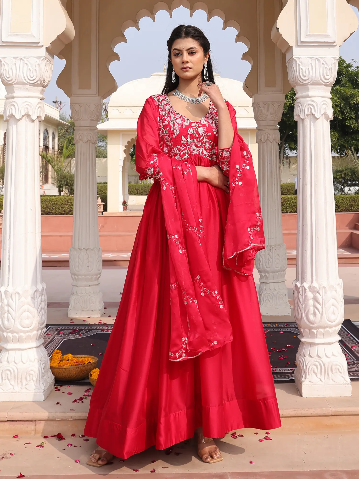 Rangoli Silk Anarkali Suit With Dupatta And Crepe Bottom Highlighted By Graceful Ribbon Work Embroidery