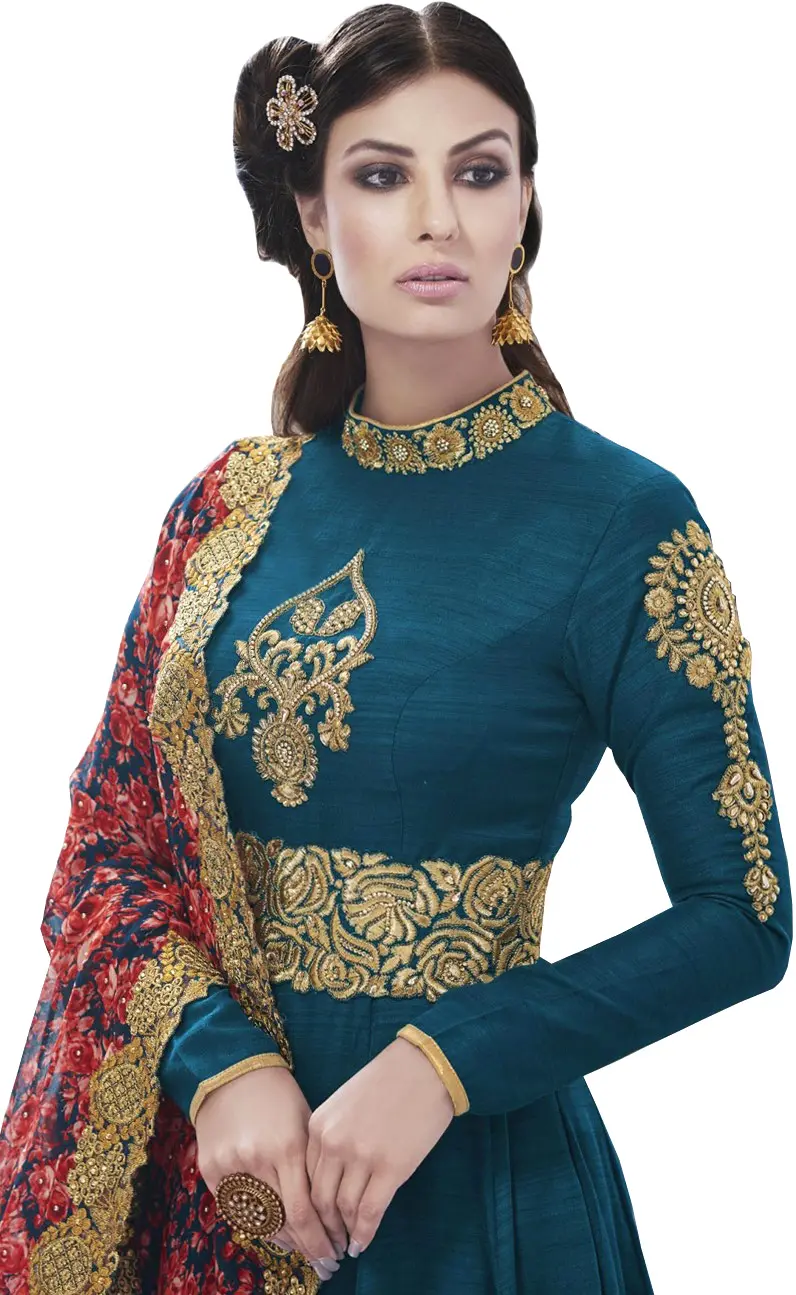 Blue-Fog Maxi Gown from Srinagar with Printed Flowers and Embellished Beads
