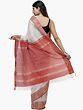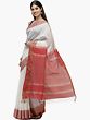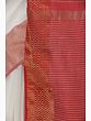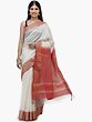 Comfort and elegance in one, a Maheshwari saree is traditionally loved for the ease of draping and graceful appeal it offers. This lovely handloom Maheshwari saree has a pristine white field, embellished by a rich woven border which has golden threads creating exquisite chevron design all over, while the pallu has woven stripes running parallelly, making this a classic drape you can pair with traditional jewelry to feel an understated regalia.