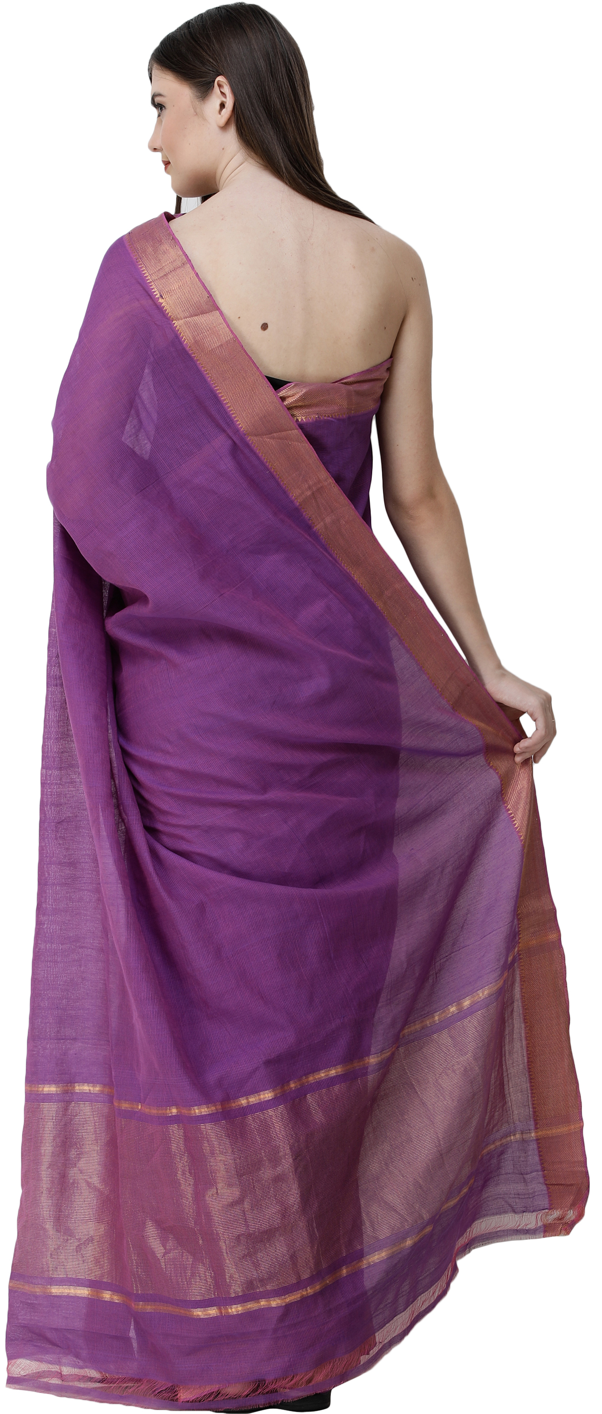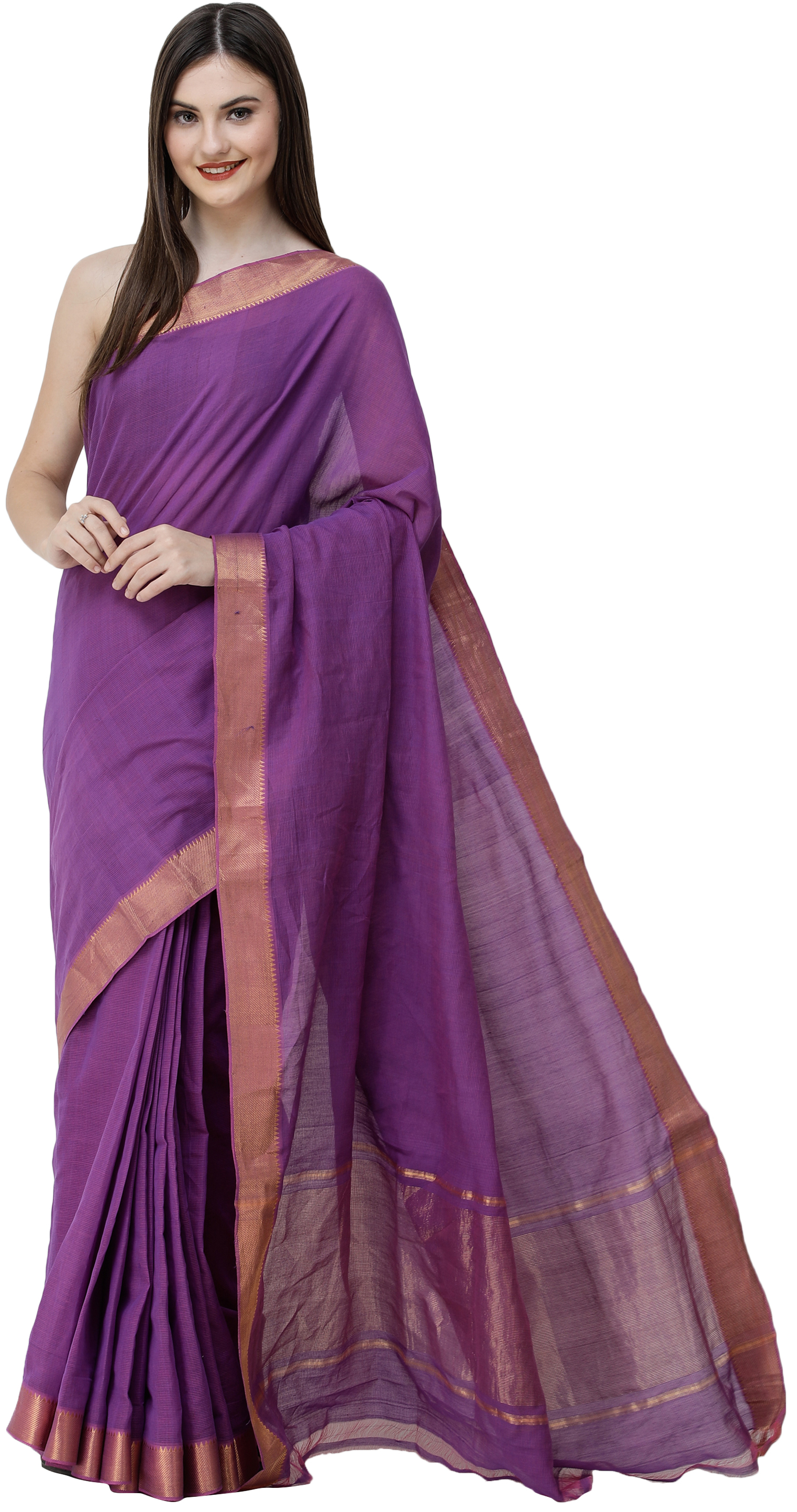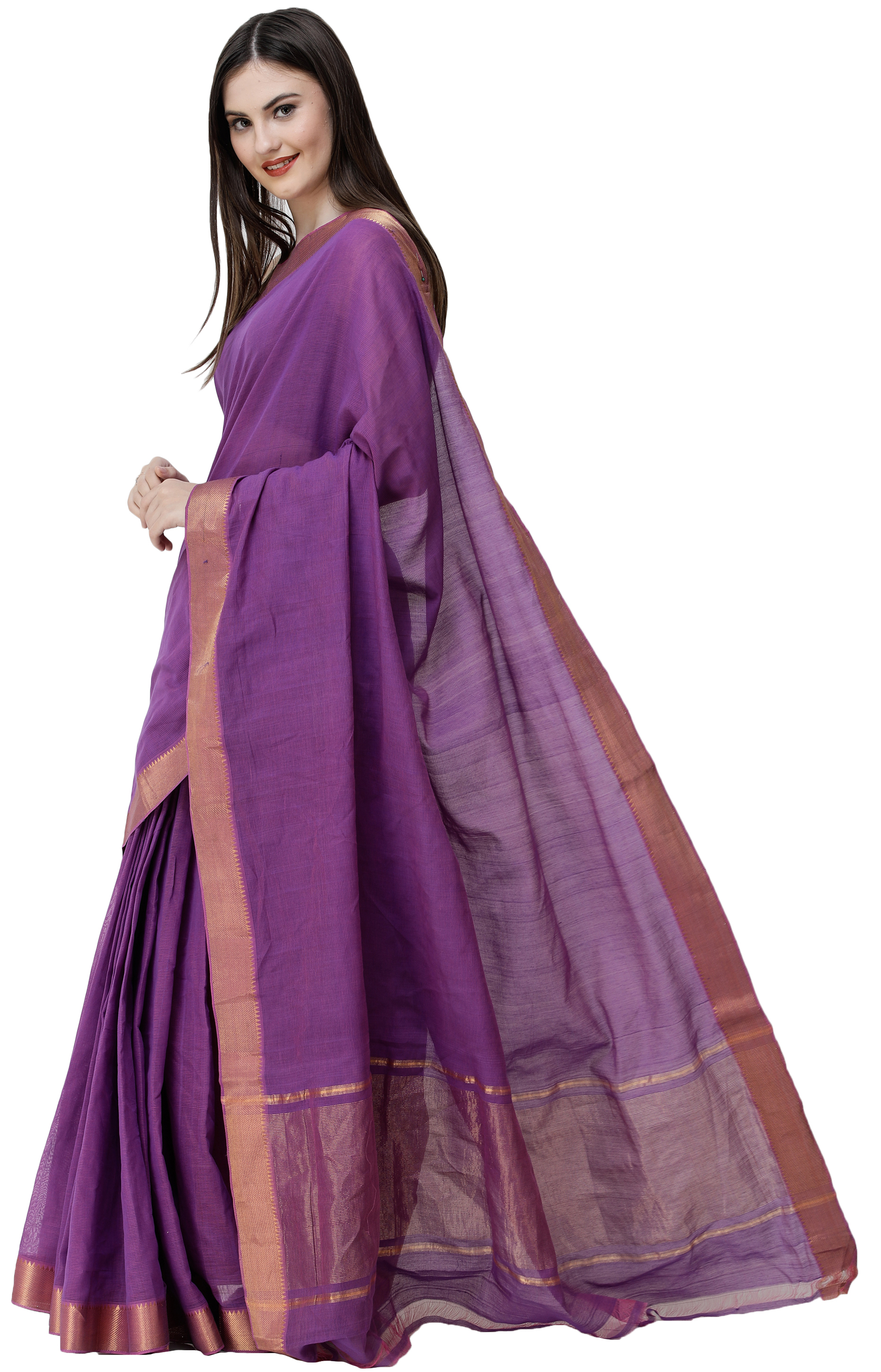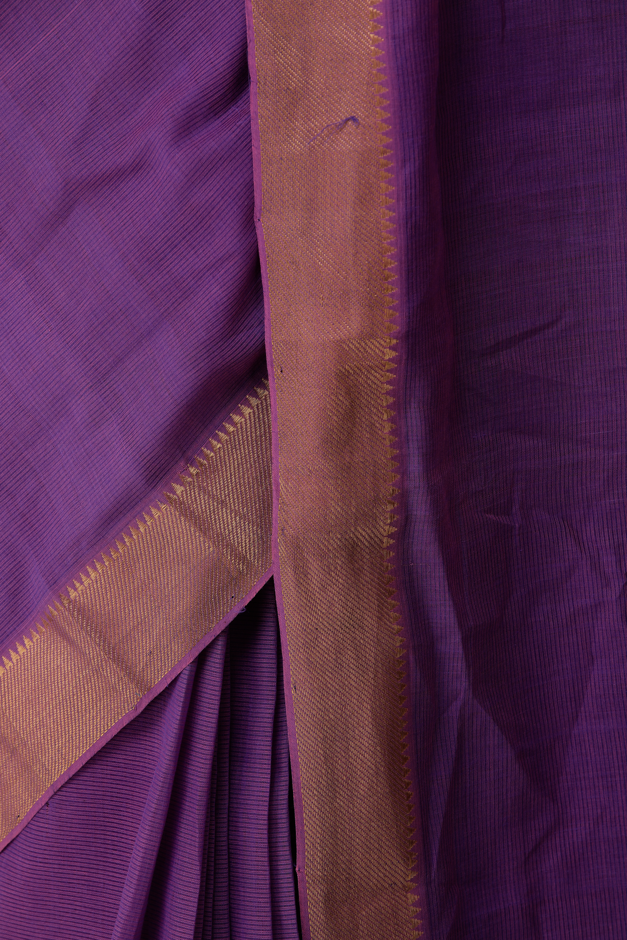 The Mangalgiri Sari from Andhra Pradesh is a testament to Indian regalia. Crafted from lightweight cotton, it boasts a Zari-woven temple border and pallu, adding a touch of grandeur to its traditional charm. The hints of gold on the border and the lovely pallu enhance its elegance, making it a cherished choice for lovers of timeless Indian attire. This sari is a fusion of cultural heritage and contemporary grace, allowing you to embrace the rich tradition of Mangalgiri craftsmanship while exuding a sense of sophistication and beauty in every drape. It's a true embodiment of India's sartorial legacy.