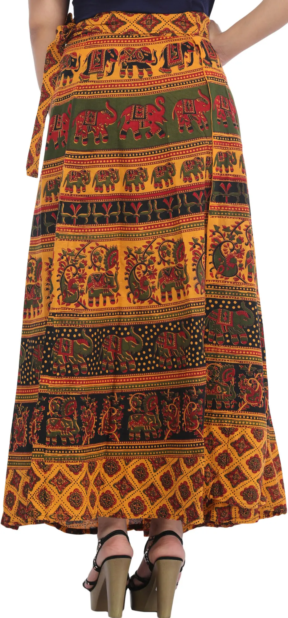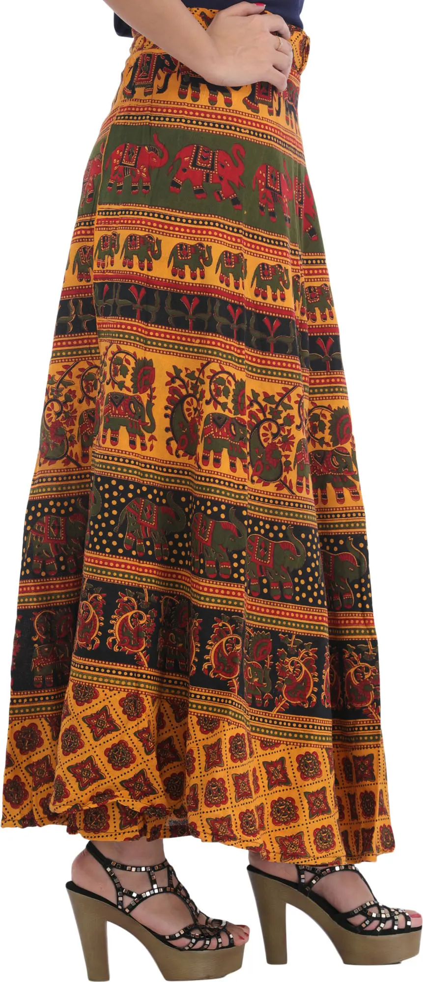 Marigold Wrap-Around Long Skirt from Pilkhuwa with Printed Elephants