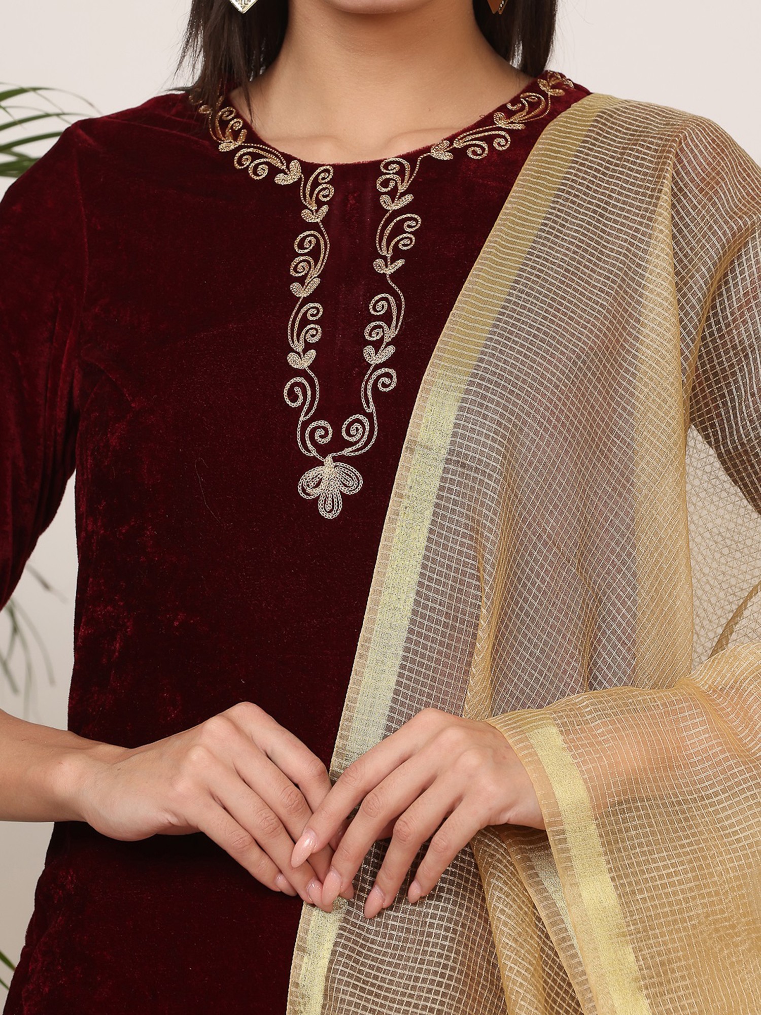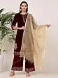 Step into a world of refined elegance with this exquisite Maroon Velvet Kurta Palazzo Set, designed to make you the cynosure of all eyes at any festive gathering. Crafted from sumptuously soft velvet, this ensemble drapes beautifully, offering both comfort and a luxurious feel against your skin. The rich maroon hue evokes a sense of opulence and festivity, making it the perfect choice for celebrations, parties, and special occasions.