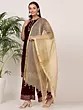 To complete this stunning ensemble, a flowing Chanderi silk dupatta is included. This ethereal dupatta, in a soft golden shade, features a fine, textured weave that adds a subtle elegance. Its lightweight nature allows it to drape gracefully, enhancing the overall silhouette without overwhelming the outfit. The contrasting texture and sheen of the Chanderi silk beautifully balance the plush velvet of the kurta and palazzo, creating a harmonious and striking combination.