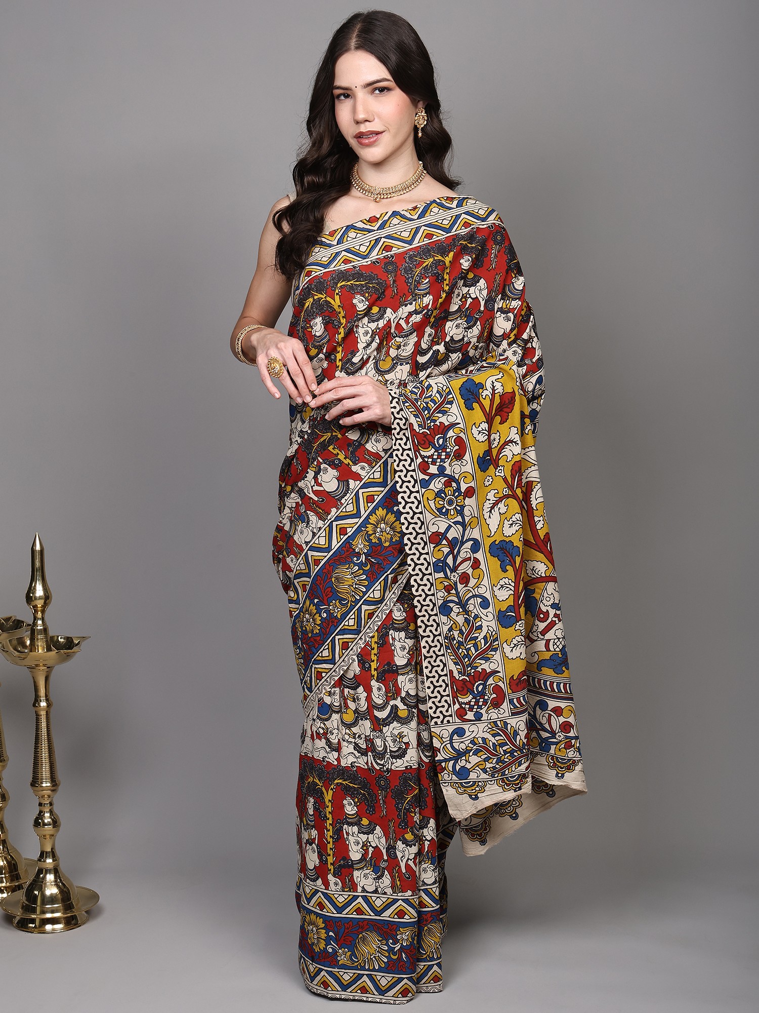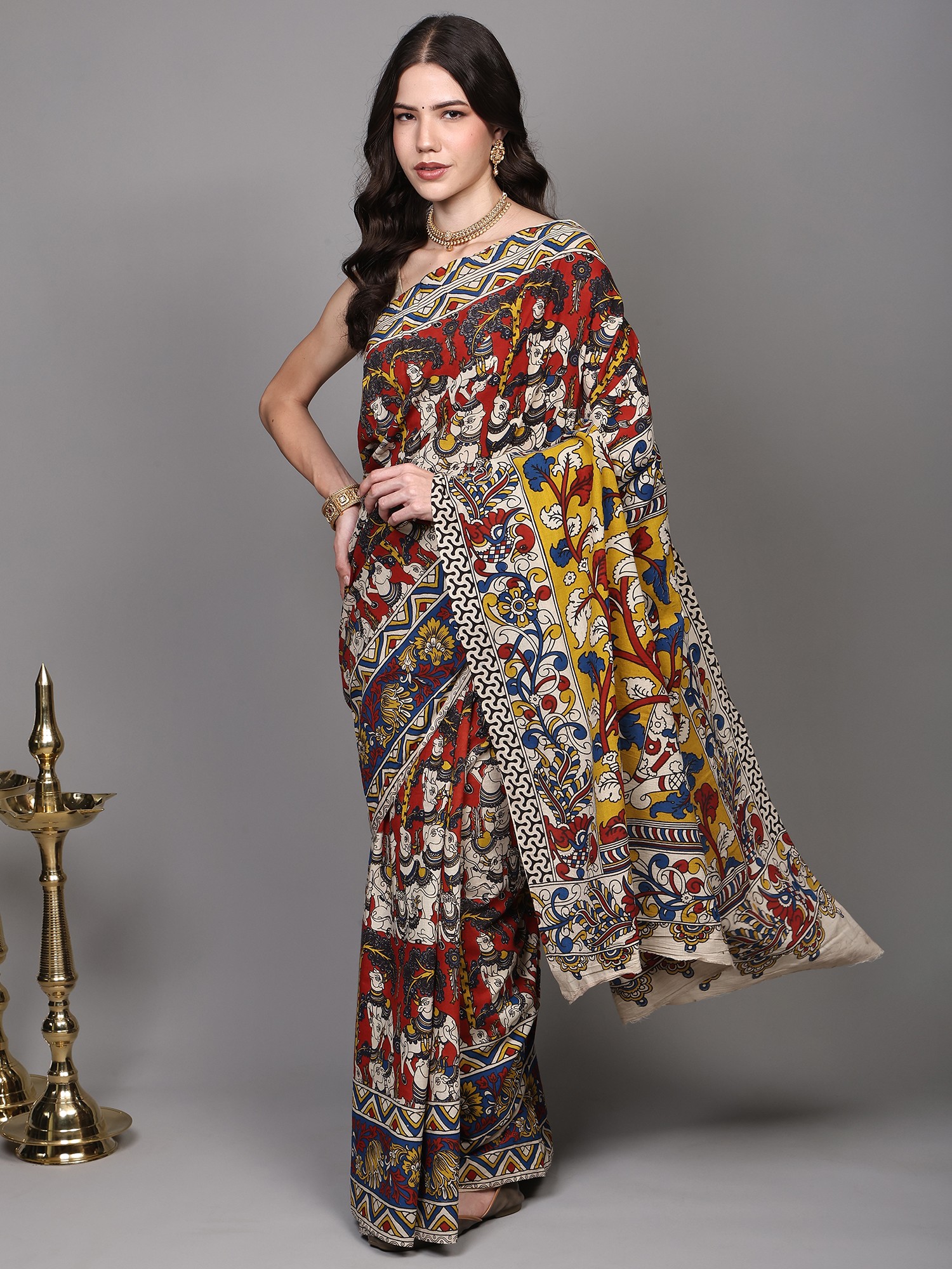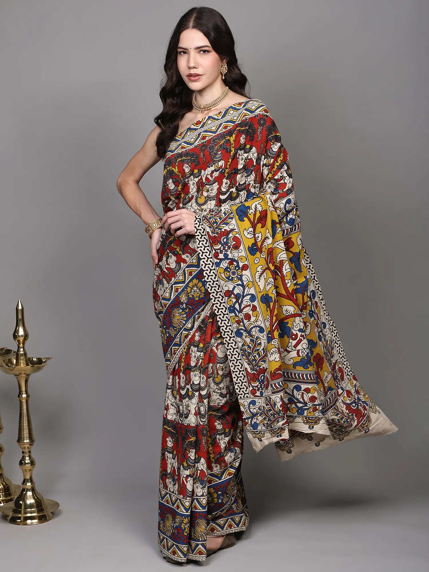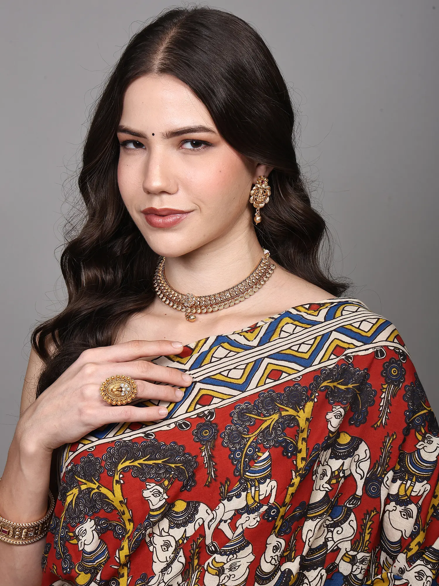 Mars-Red Kalamkari Saree with Printed Phool Bail All-Over from Telangana