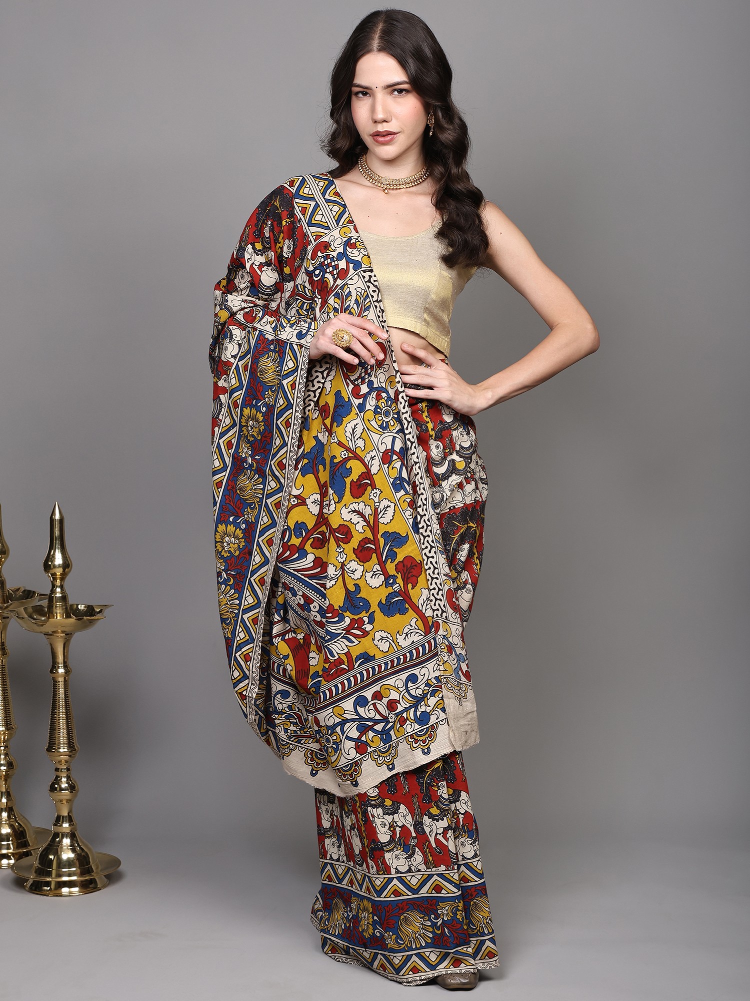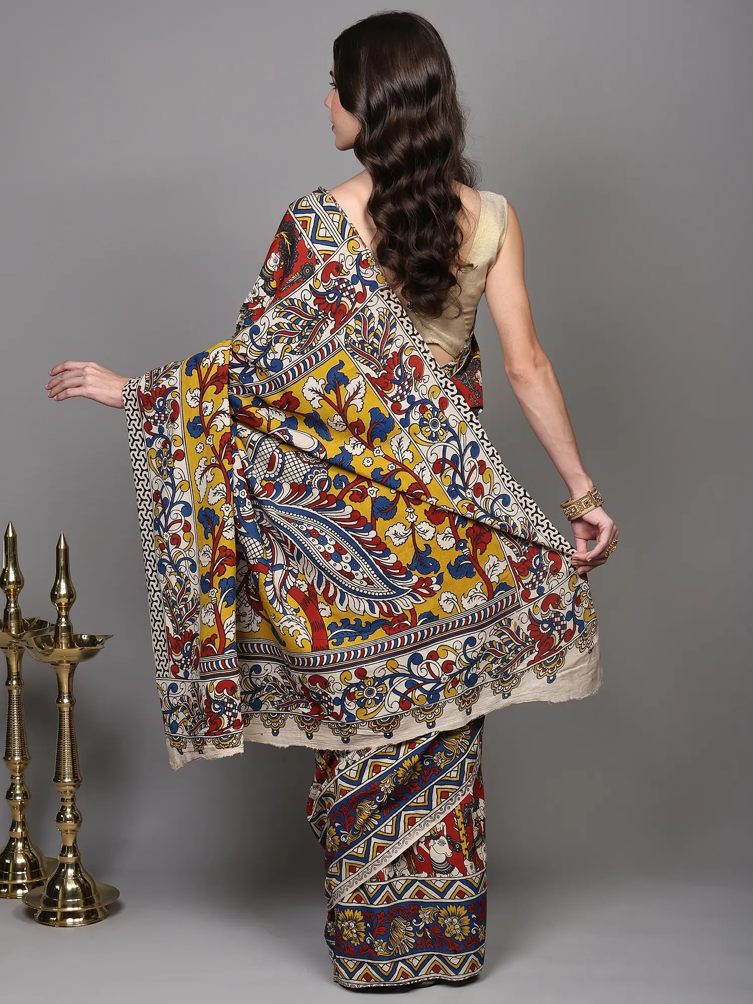 Kalamkari Saree with Printed Jungle Scene and Nandi Ox Border from Telangana