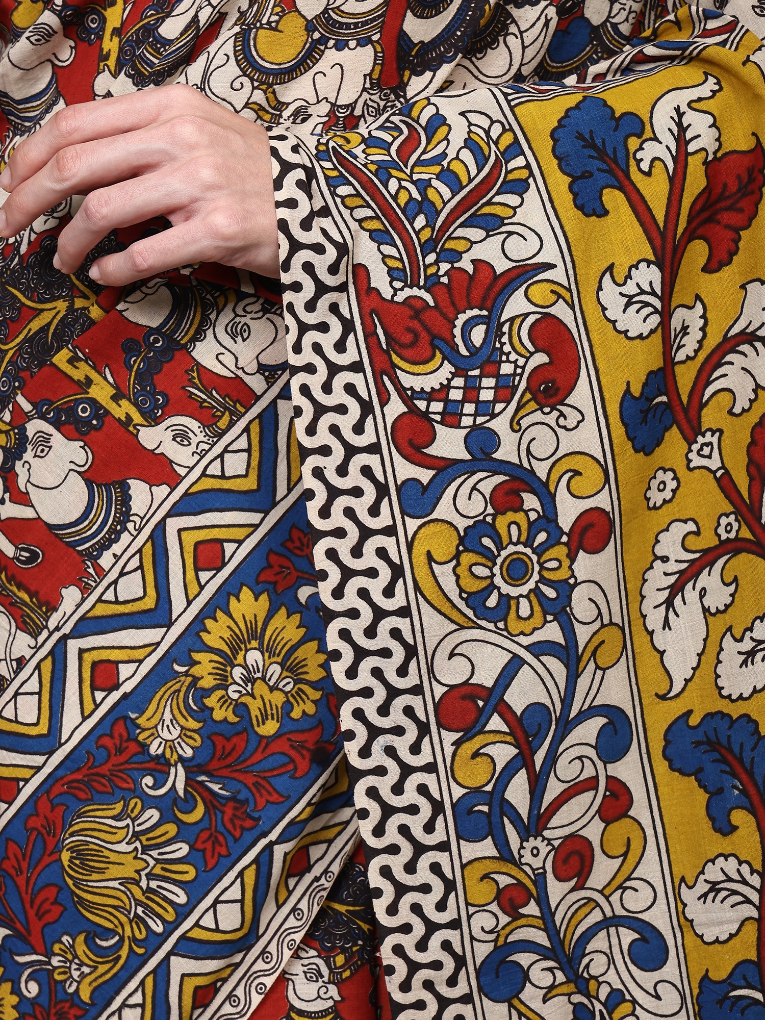 Kalamkari Saree from Telangana with Printed Warli Folk Art Motifs and Peacock-Elephant on Anchal