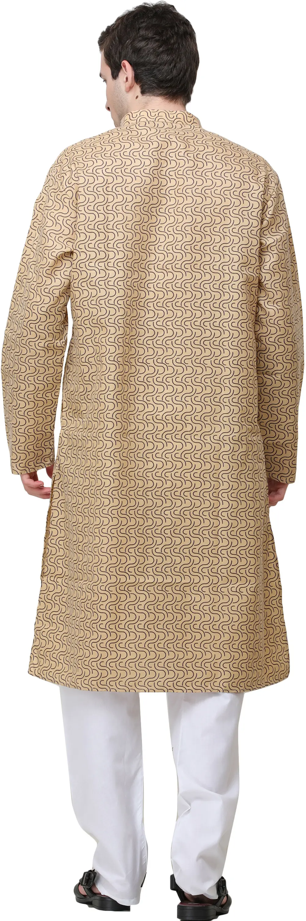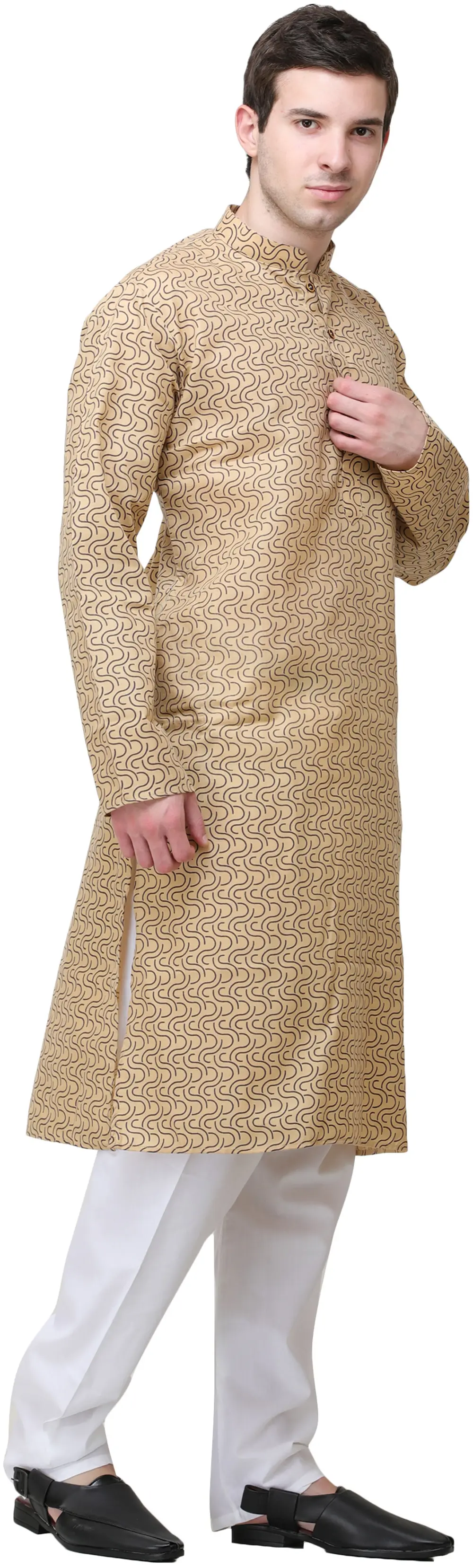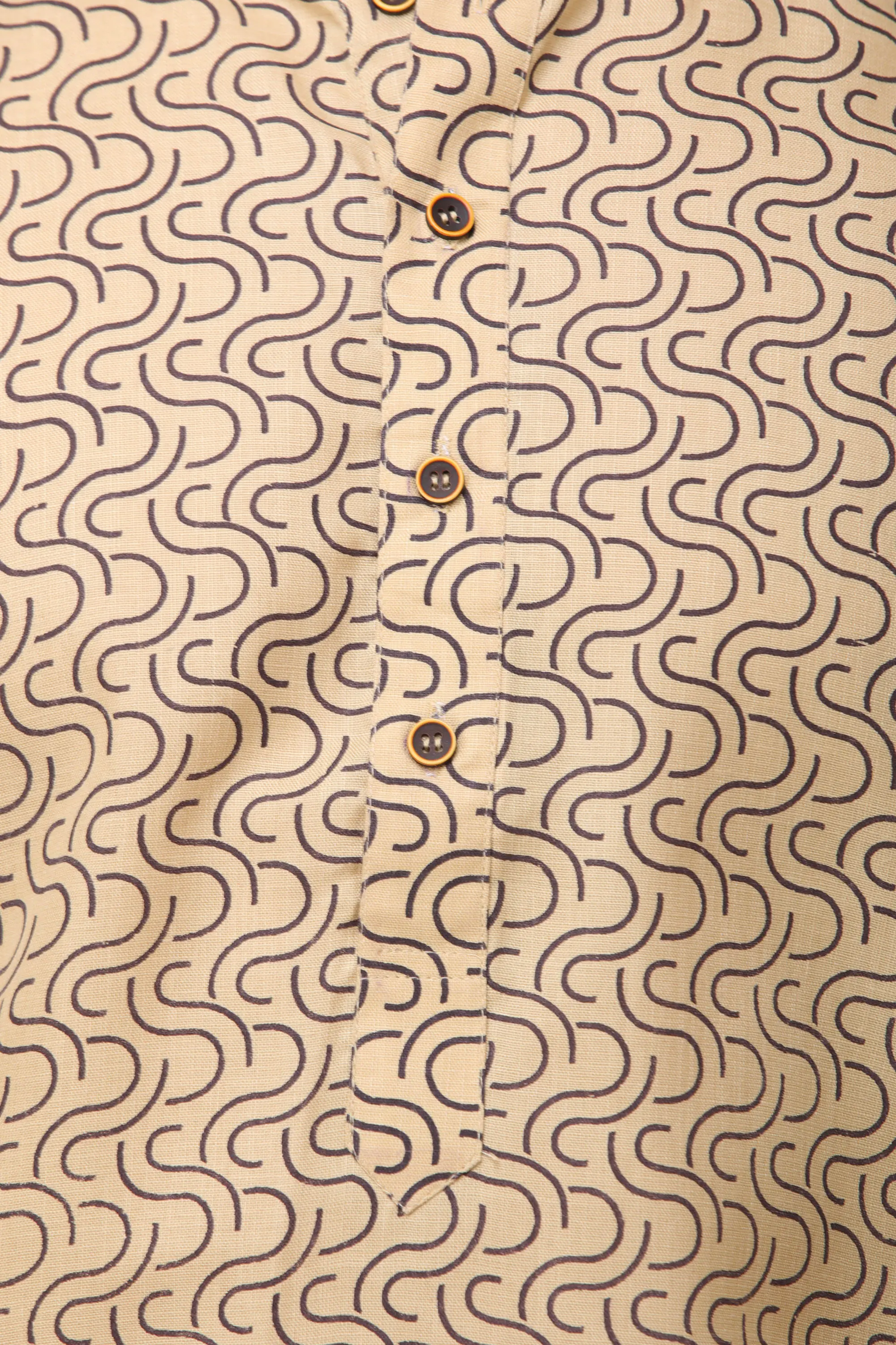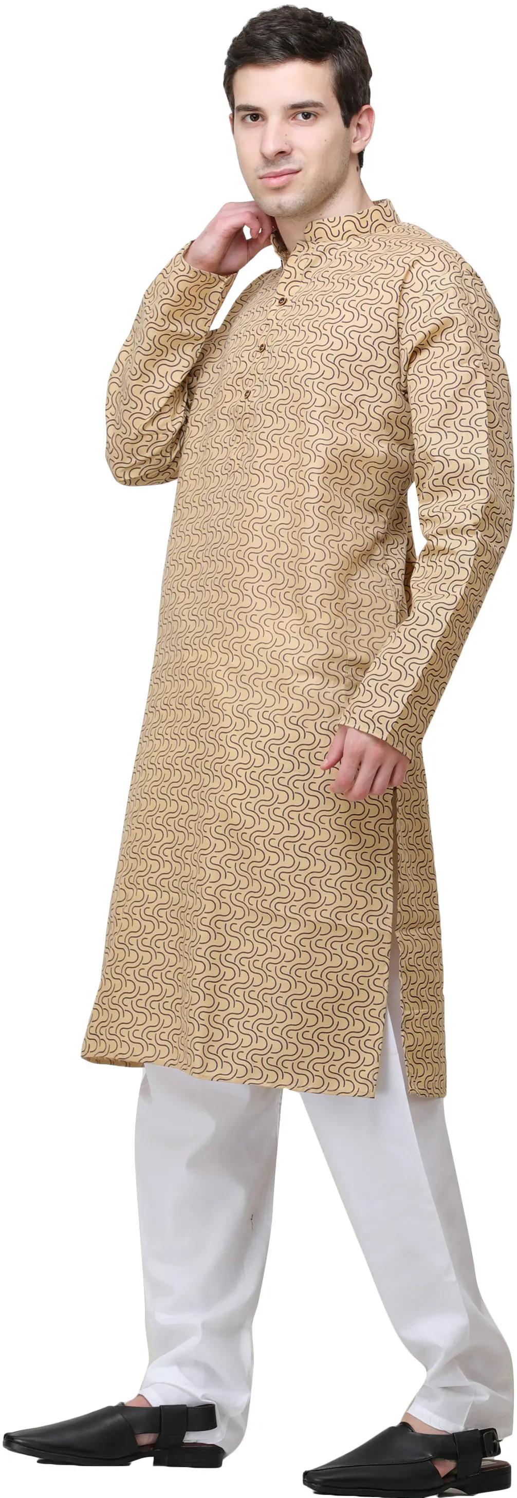 The marzipan hue of the kurta serves as a sophisticated canvas for a subtle yet striking printed wave pattern. These intricately designed, repeating waves add a touch of visual interest and a modern aesthetic, setting this piece apart from ordinary casual wear. The pattern is understated enough to maintain a sense of sophistication, while still offering a distinctive flair that complements the overall design. The rich, earthy tone of the kurta is versatile and pairs beautifully with the crisp white pajama bottoms, creating a balanced and pleasing color palette.