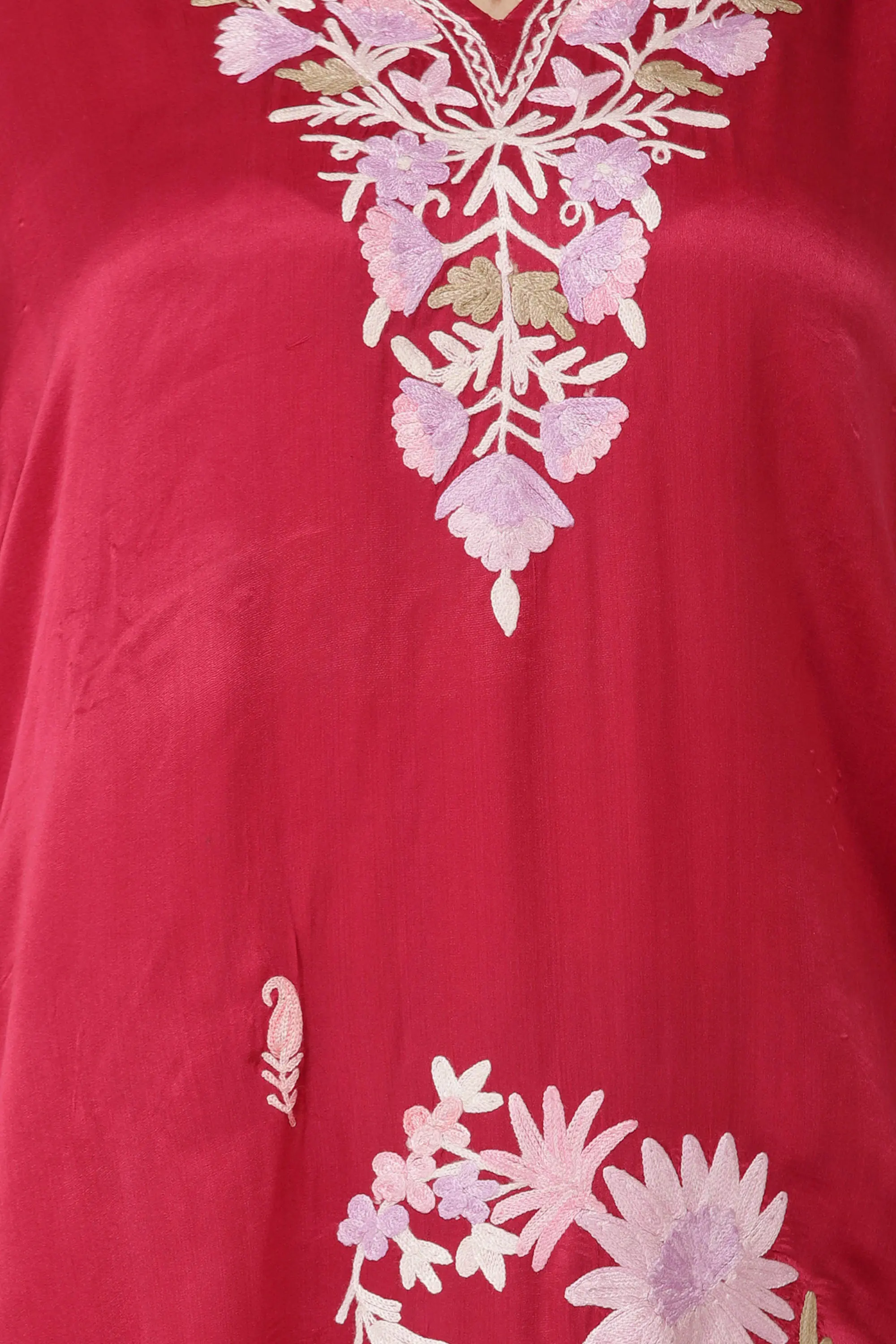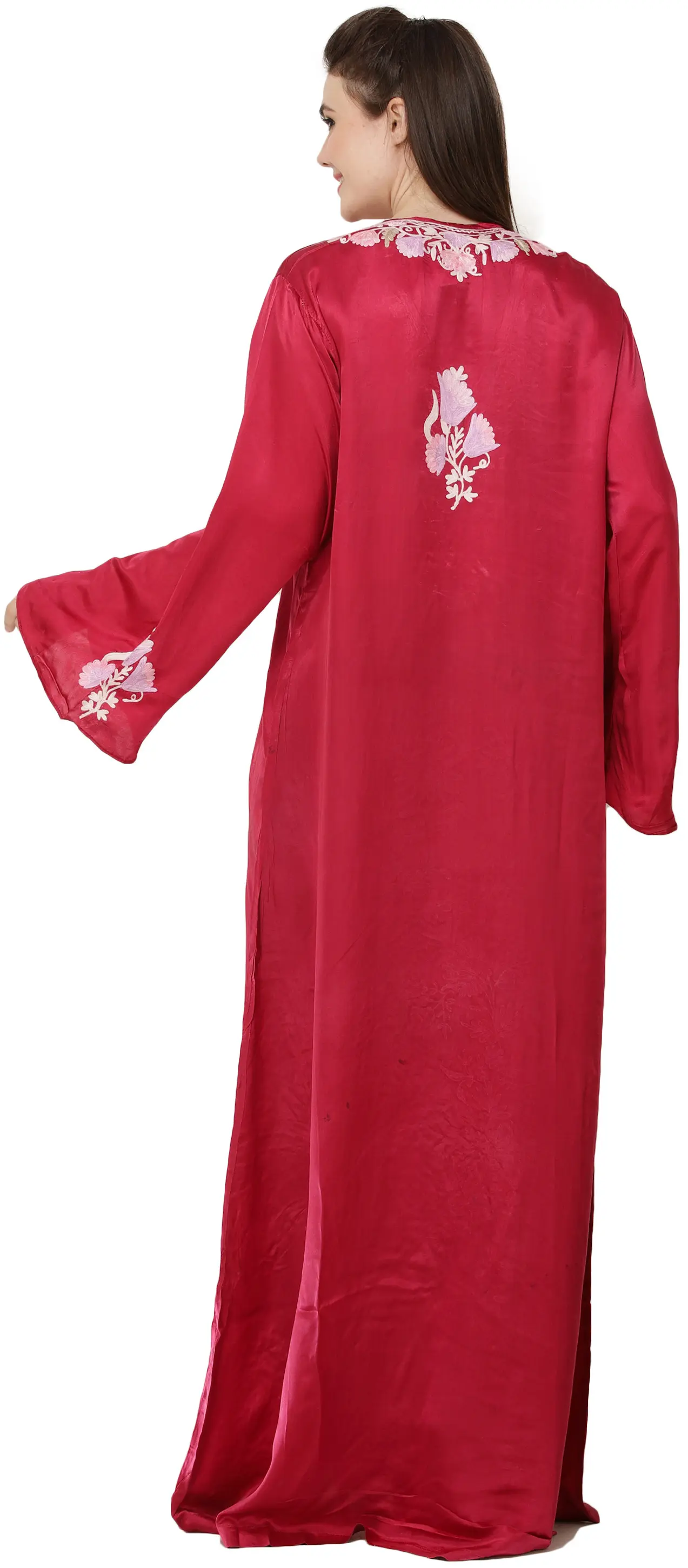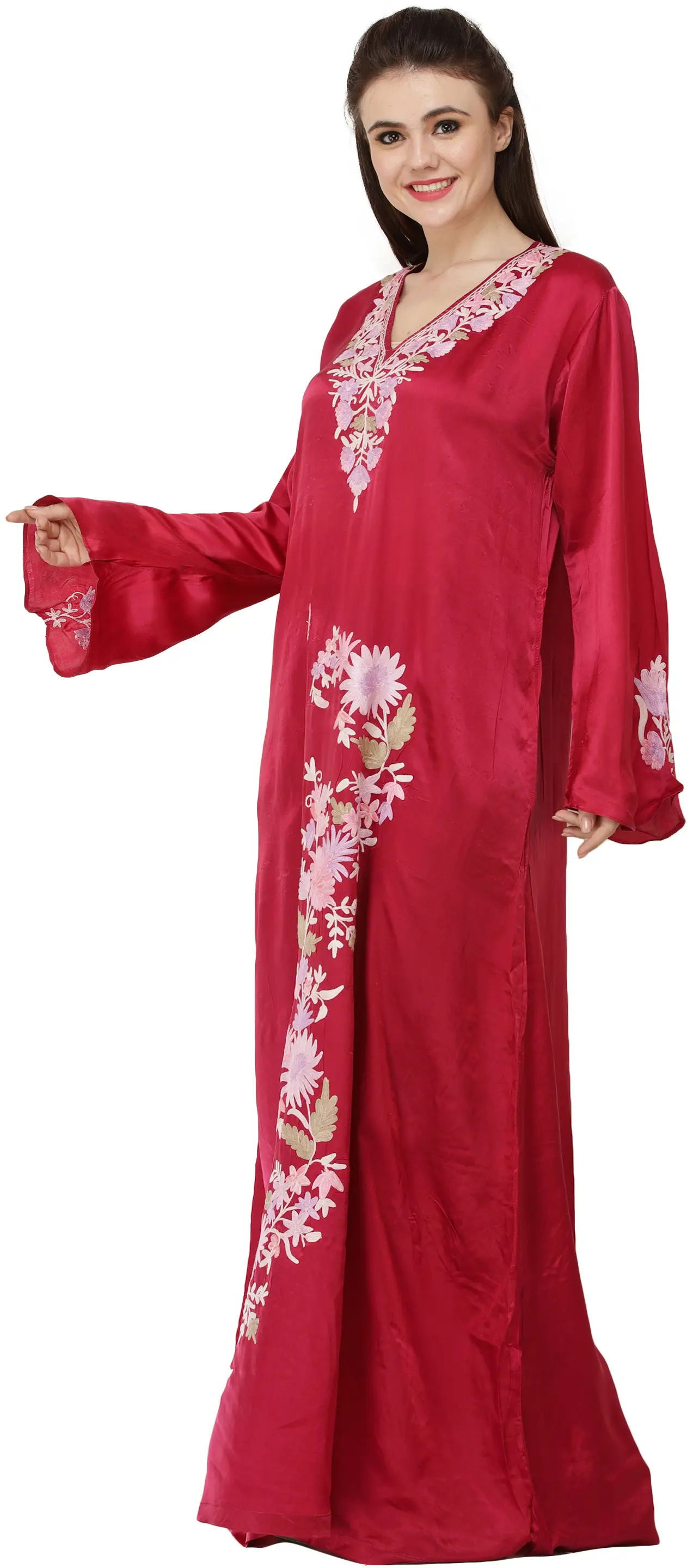 Indulge in the luxurious drape and exquisite craftsmanship of this stunning long gown. Crafted from pure satin silk, this garment offers a smooth, lustrous finish that glides beautifully against the skin, promising both comfort and an air of refined sophistication. The rich, deep mauverose hue serves as a perfect canvas for the intricate Aari embroidery that adorns it, creating a piece that is as captivating as it is comfortable.