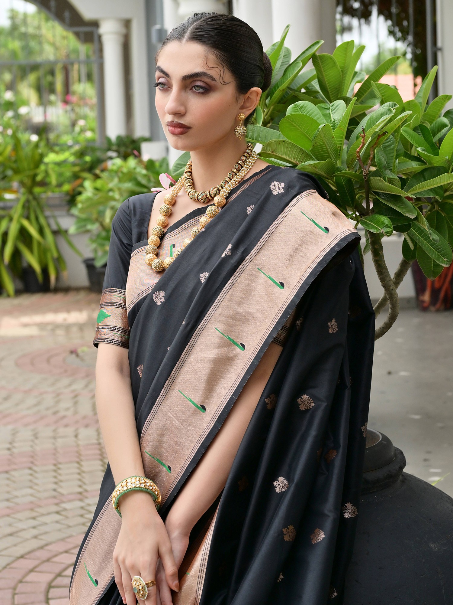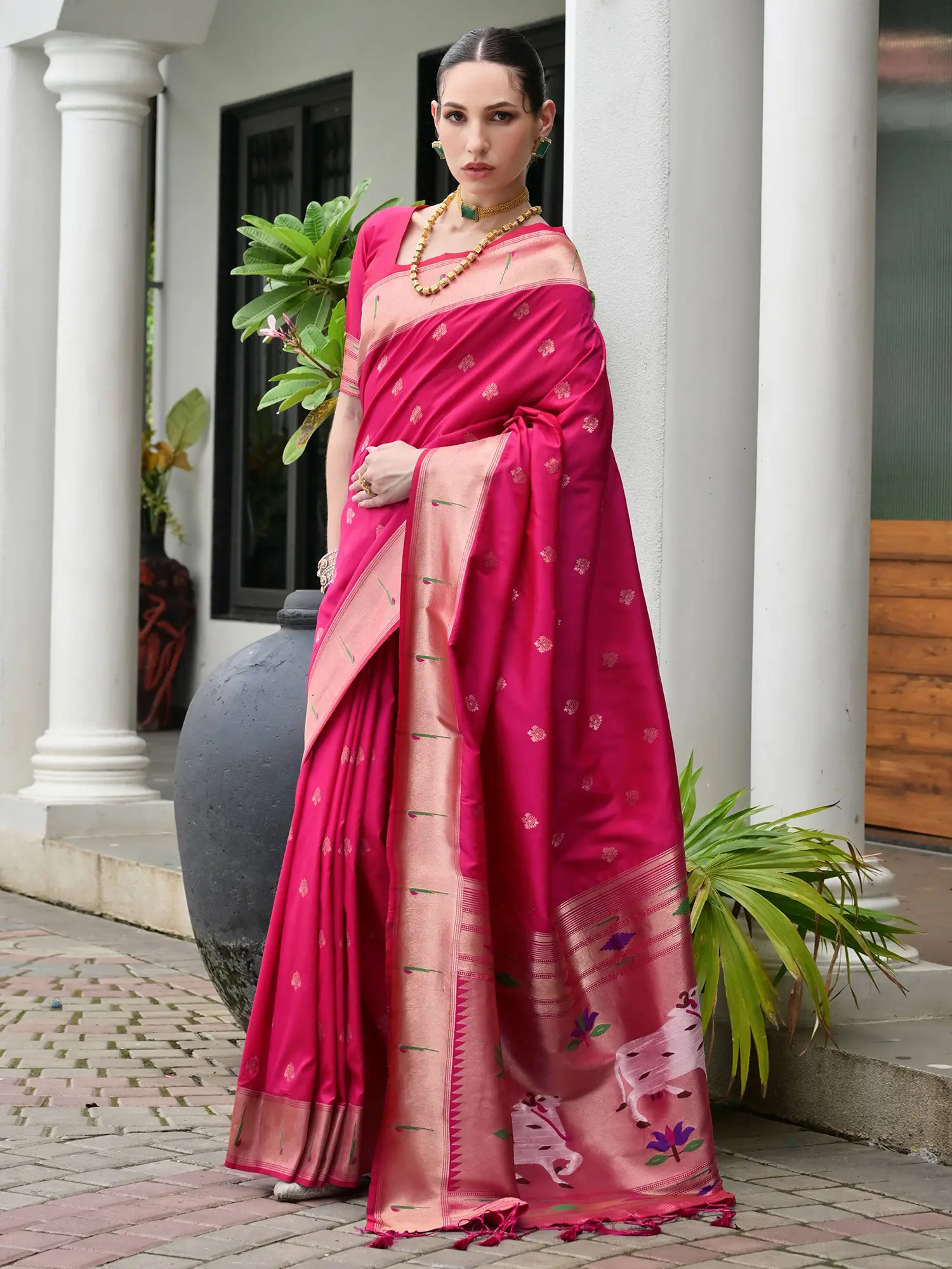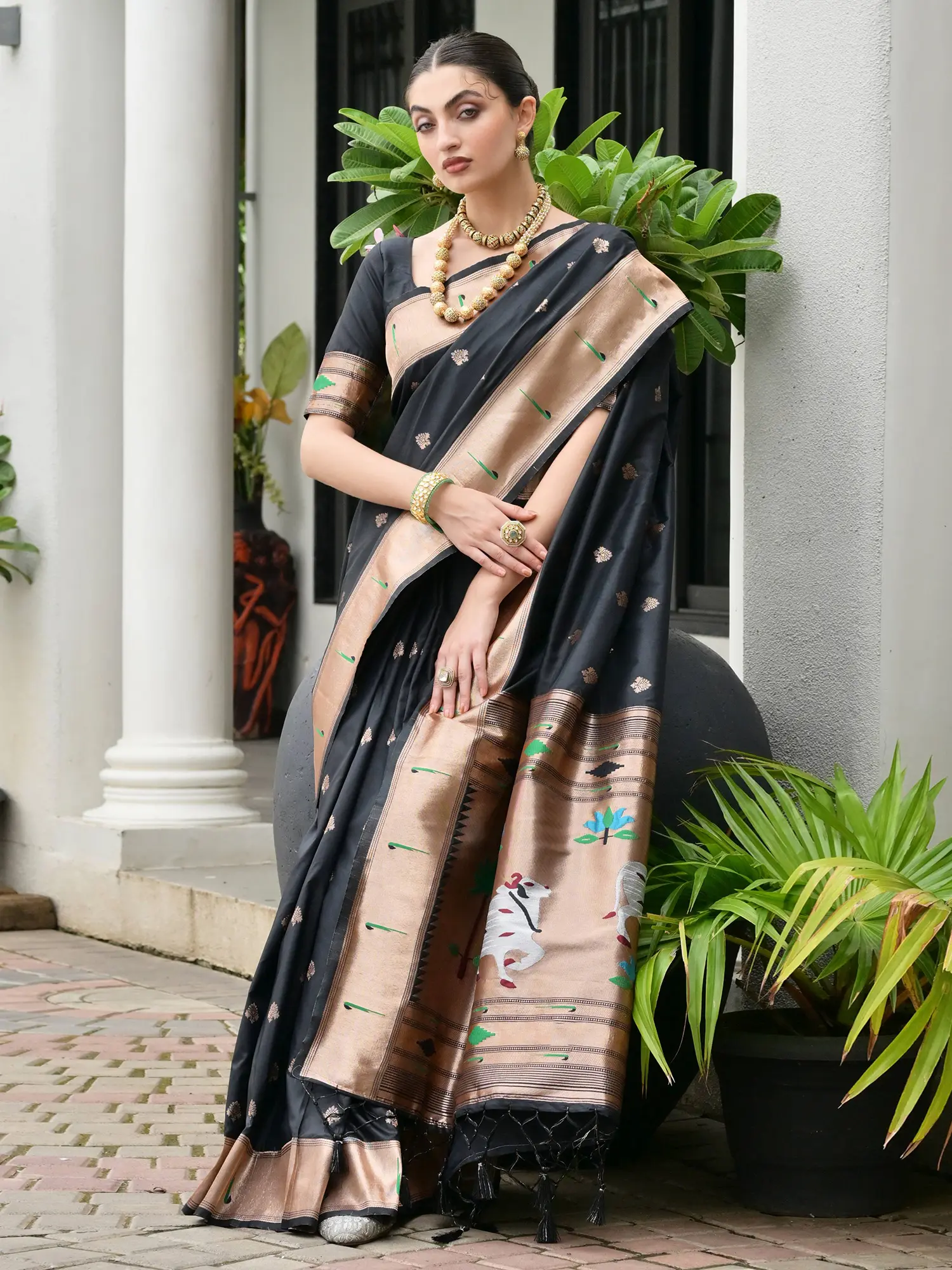 Dual Shade Pure Silk Saree with Golden Zari Woven Peacock-Elephant Motif Broad Border and Bold Aamra Motif on Pallu