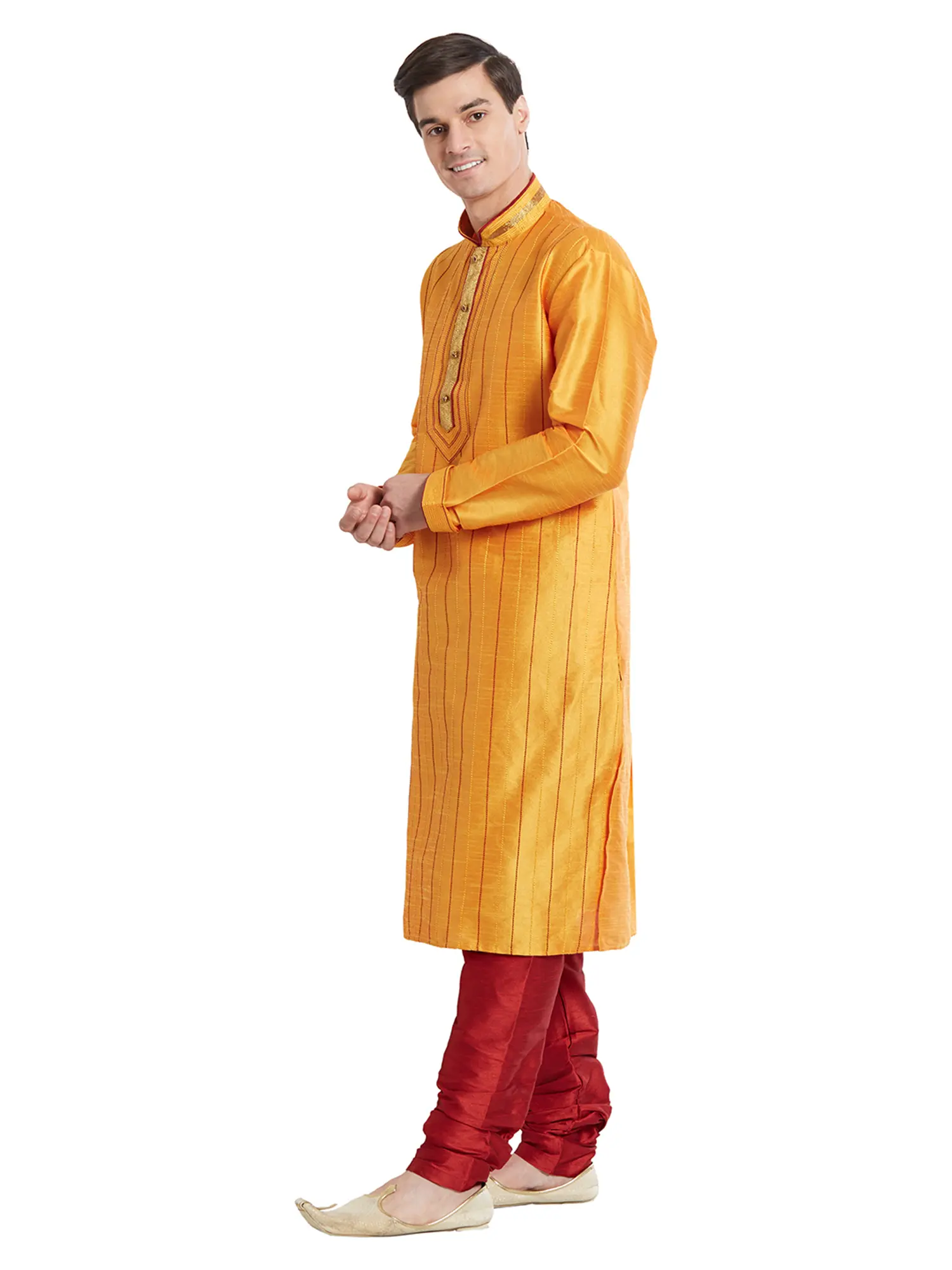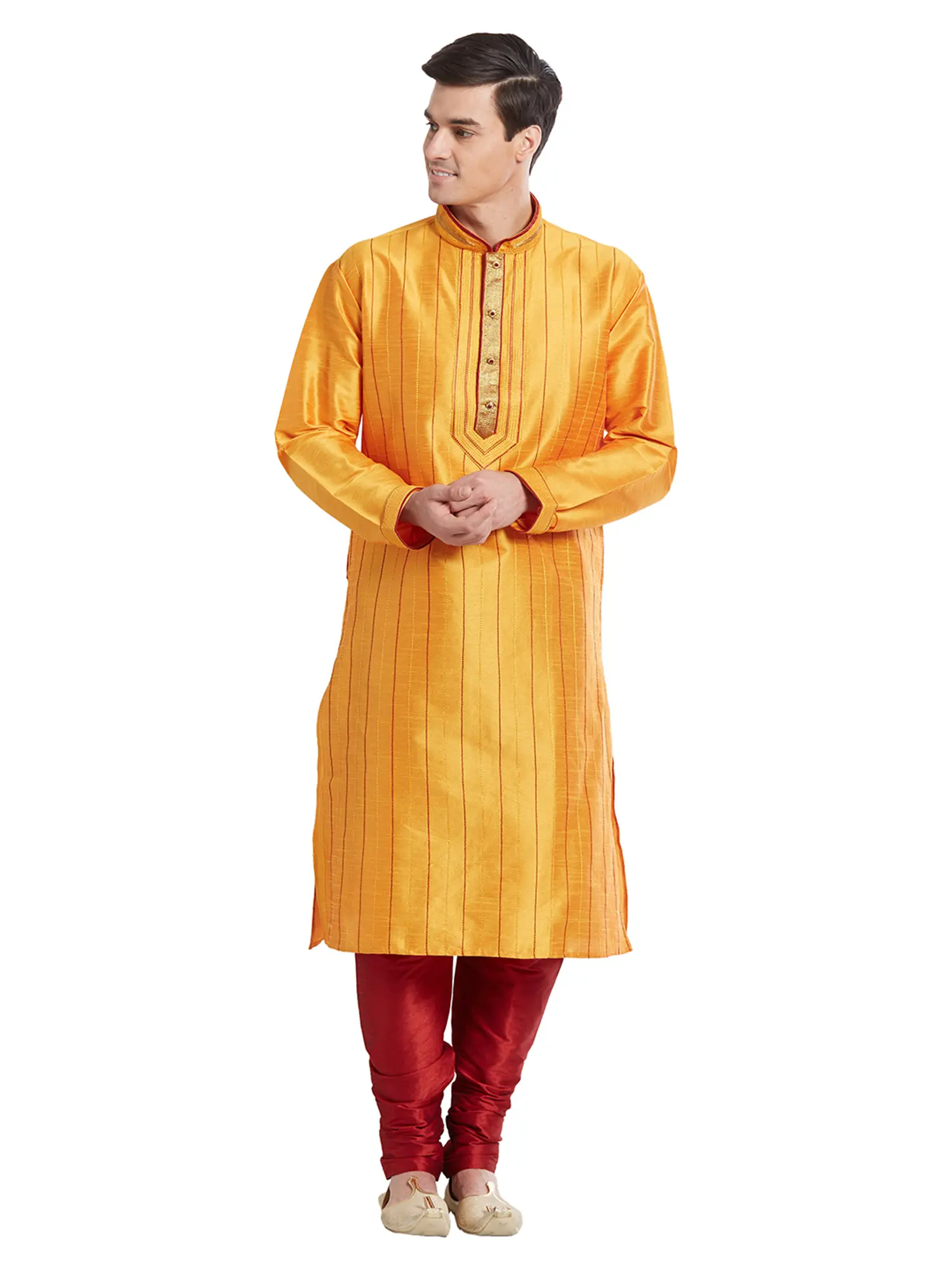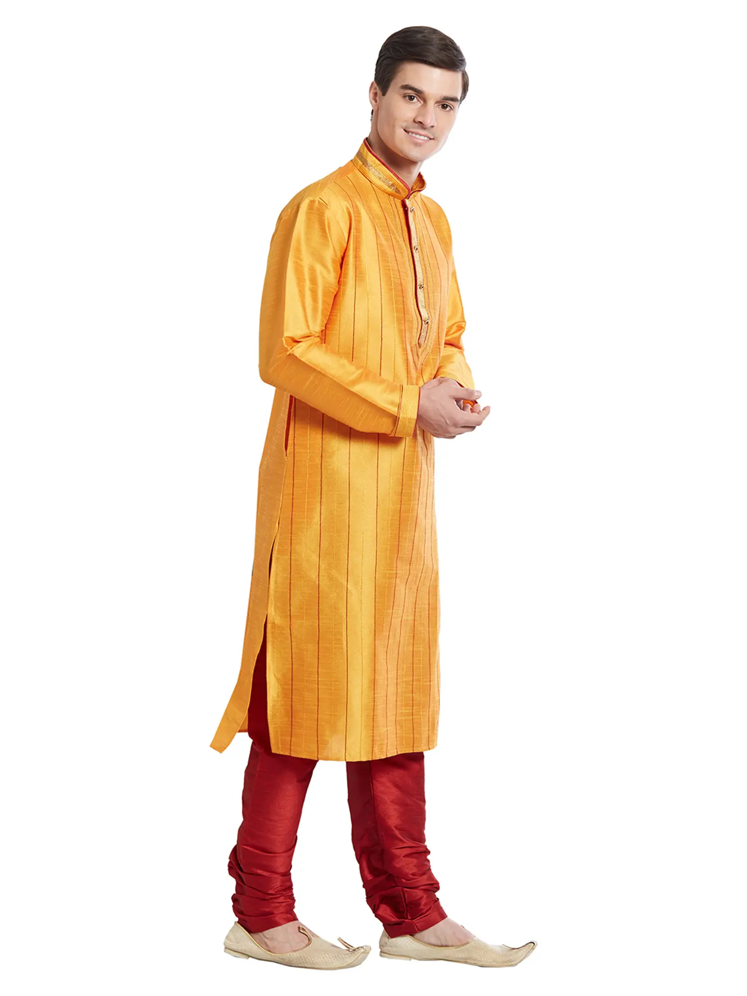 The rich, vibrant hue of the kurta is accentuated by delicate vertical stripes, a sophisticated pattern that adds depth and visual interest. A finely embroidered placket with subtle embellishments draws the eye, showcasing refined taste. The accompanying trousers offer a complementary hue, completing a look that is both harmonious and striking.
