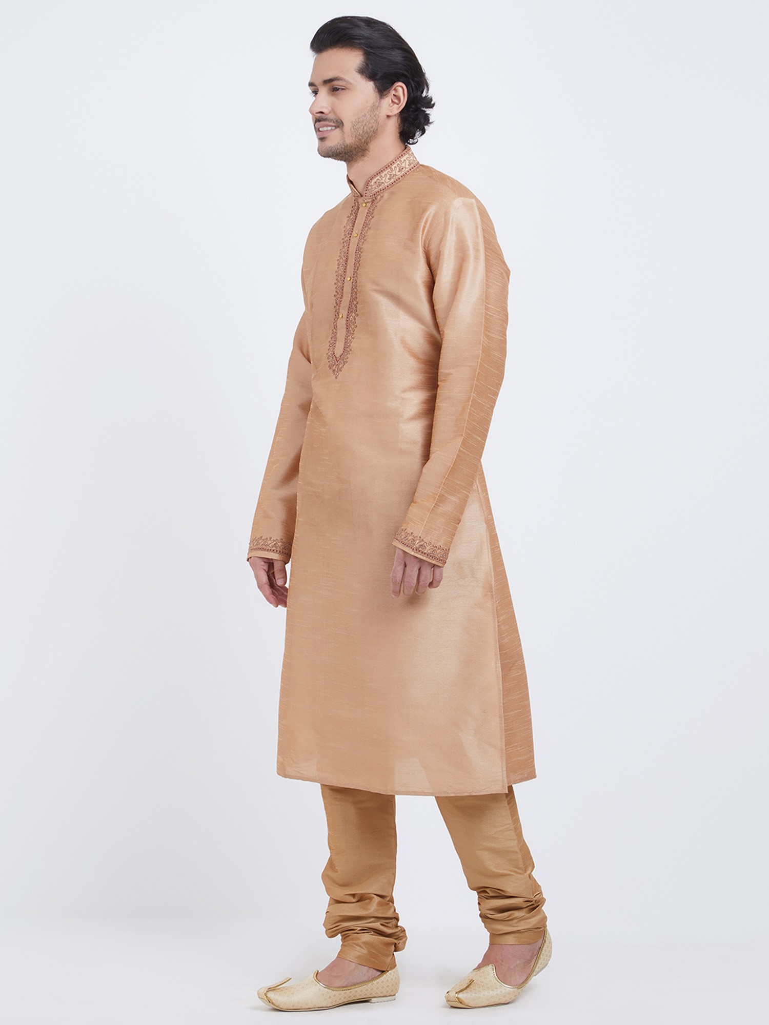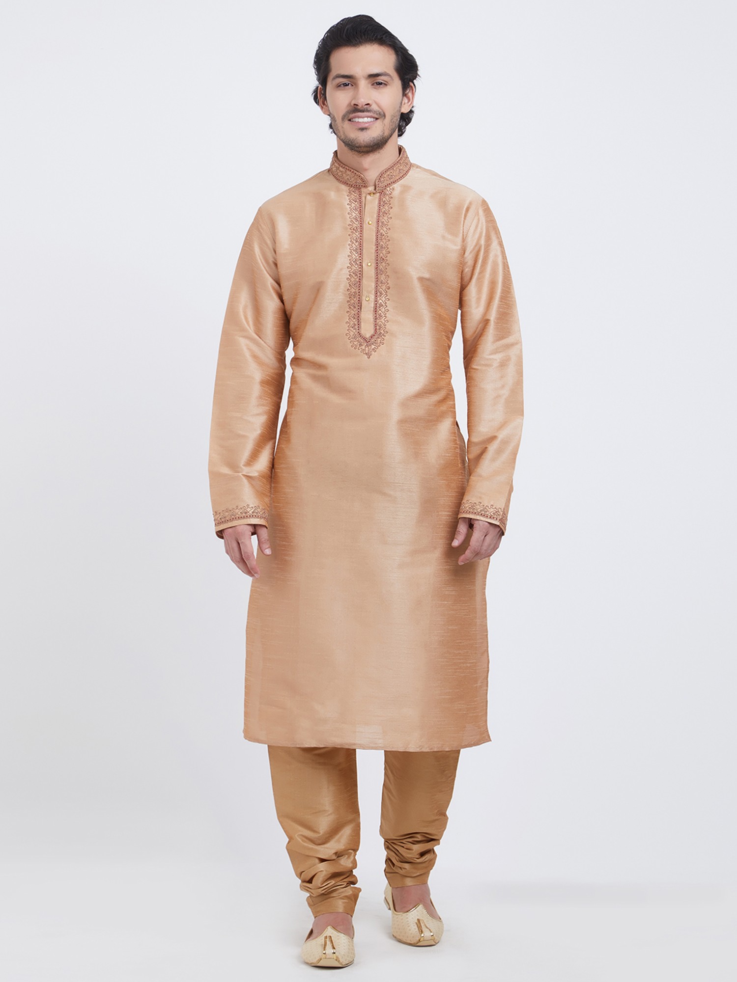 Features a lustrous art silk kurta with intricate embroidery on the neckline and cuffs.