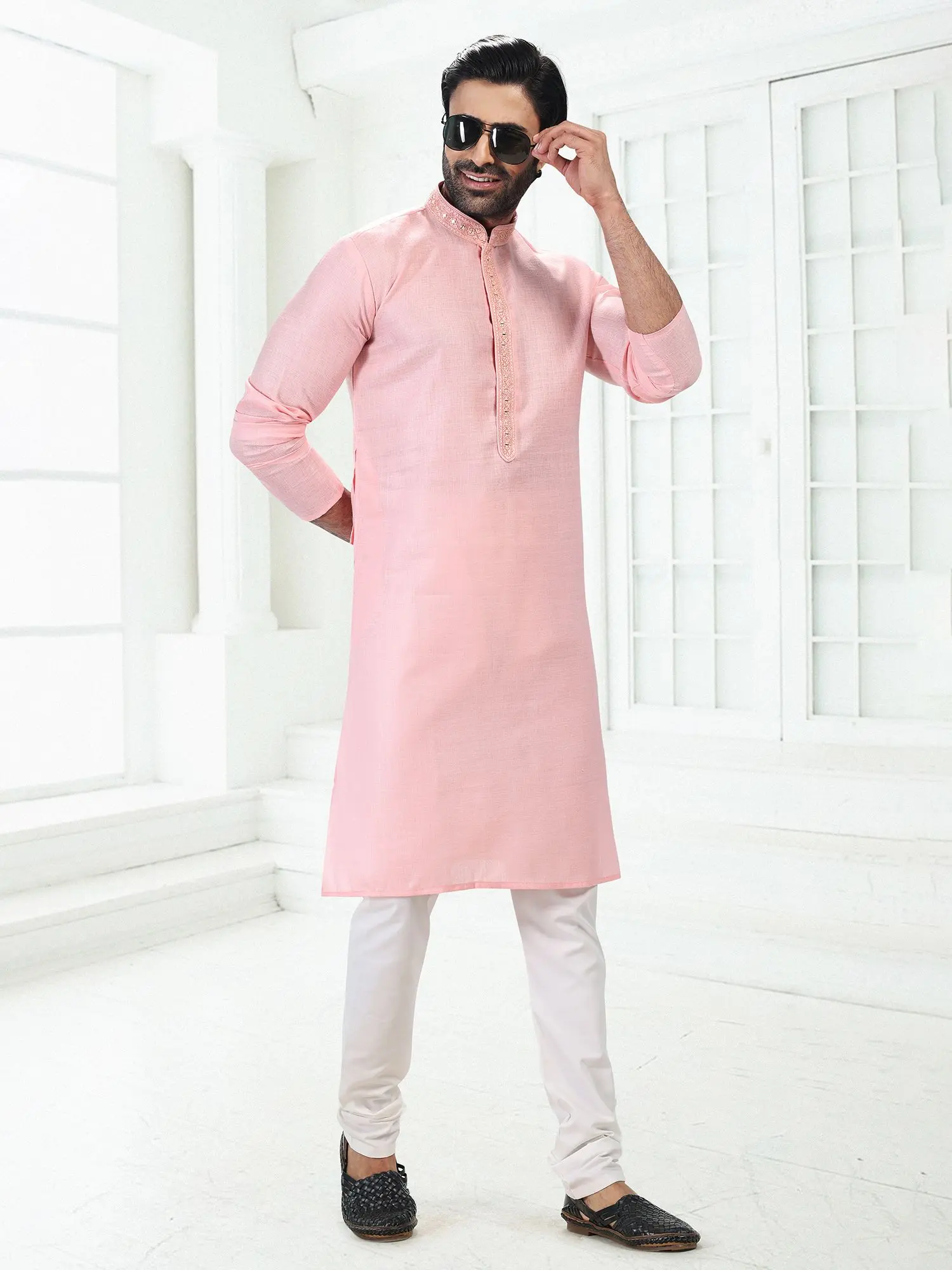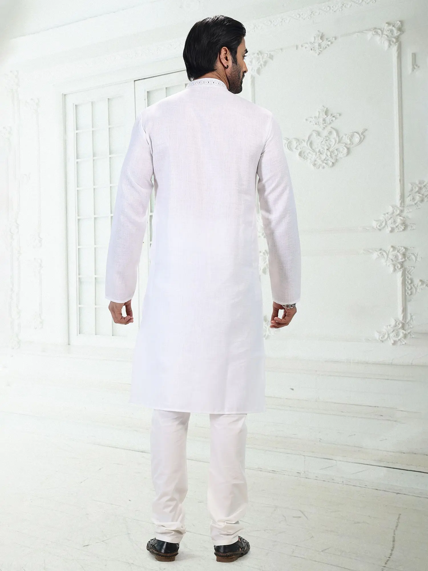 Plain Wedding Kurta Pajama with Embroidery on Neck