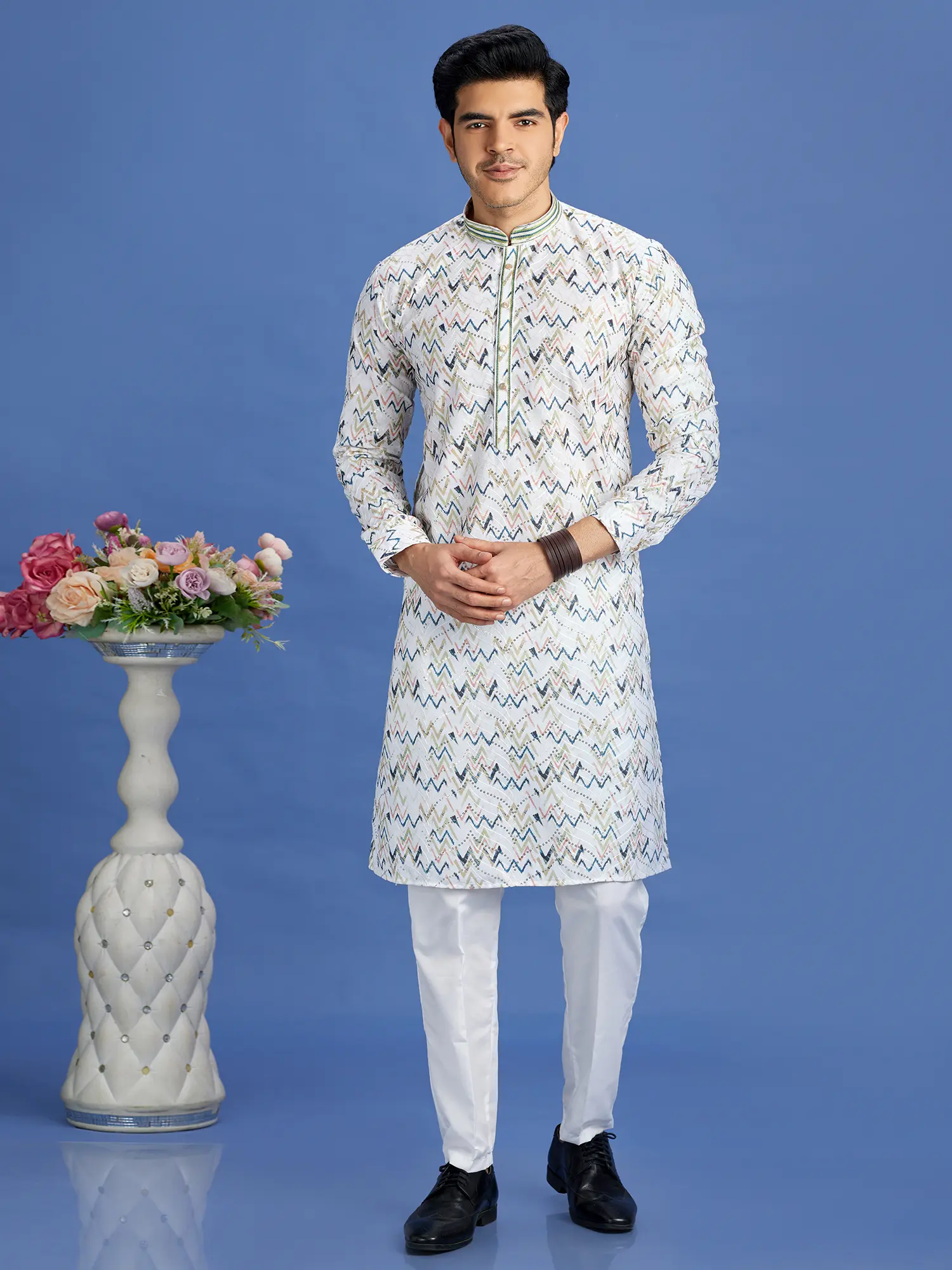 The true highlight of this set is its captivating digital print. A dynamic zig-zag pattern, rendered in a refreshing palette of cool blues, crisp whites, and subtle grays, adorns the kurta. This contemporary graphic design adds a bold yet sophisticated statement to the traditional attire. The print is meticulously applied, ensuring sharp lines and vibrant colors that remain true wash after wash.