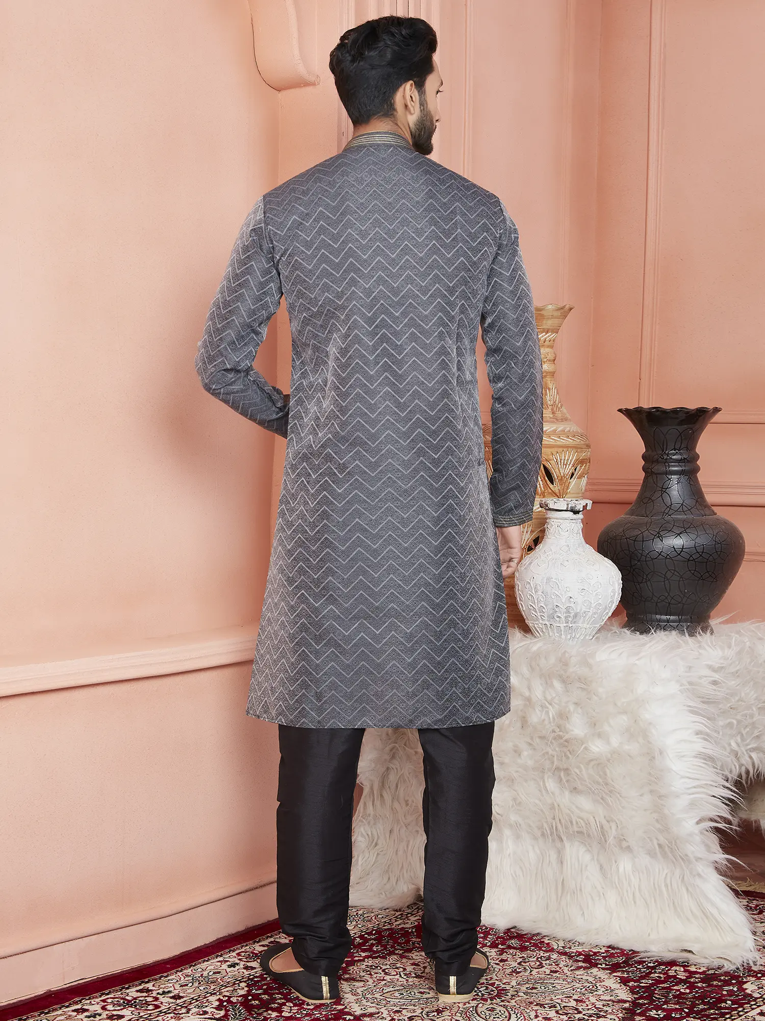 The kurta is fashioned from a luxurious Jacquard Silk Brocade, a fabric known for its rich texture and subtle sheen. The jacquard weave creates a mesmerizing zig-zag pattern that catches the light beautifully, adding depth and visual interest to the garment. This unique pattern elevates the kurta from a simple garment to a piece of wearable art. Adding to the design is the tasteful piping around the neckline and the placket.