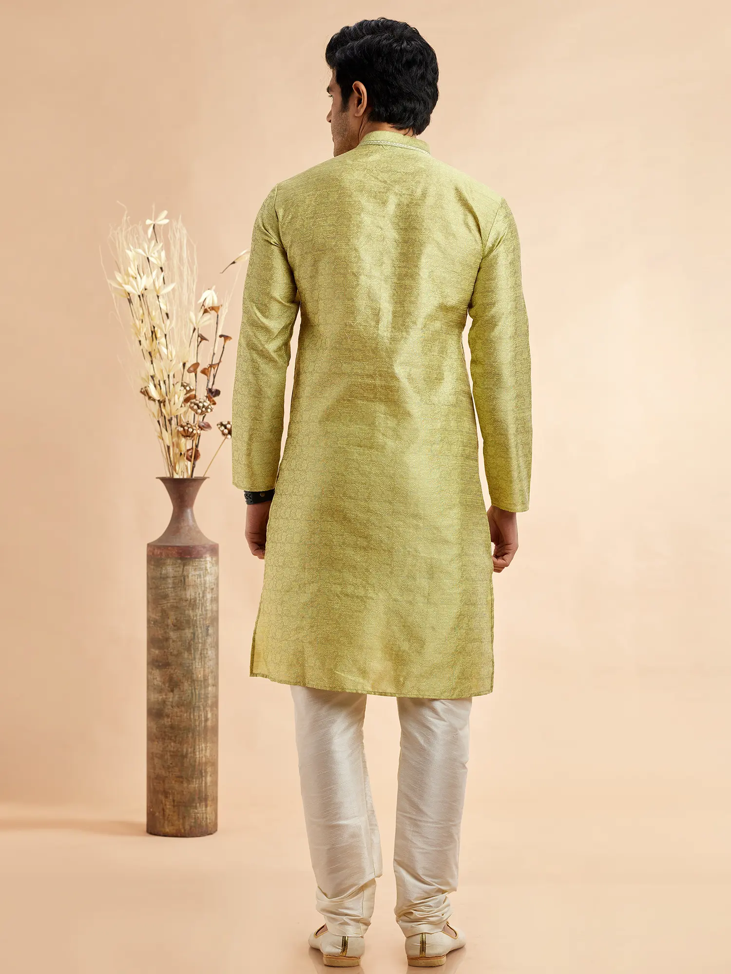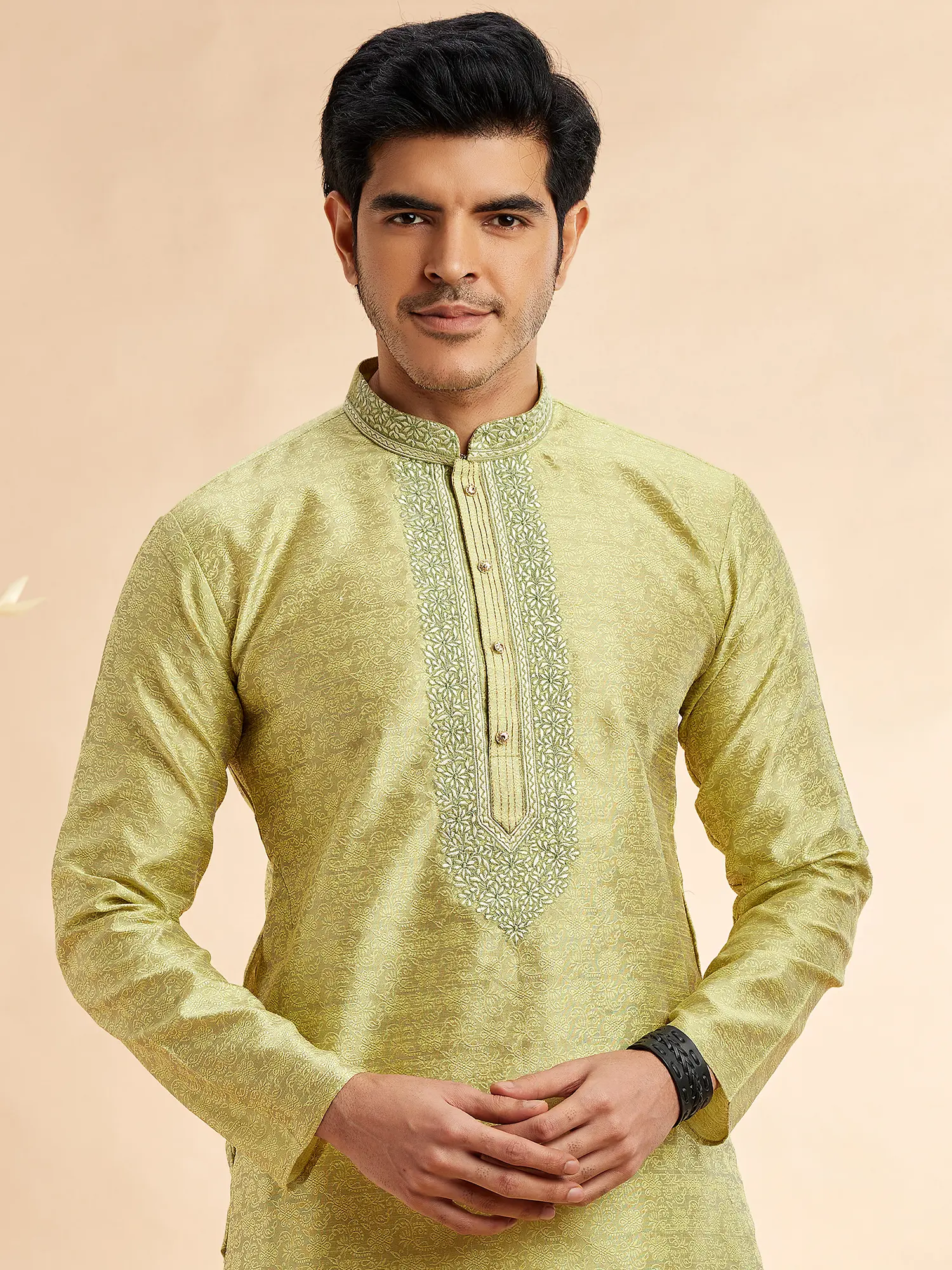 Wedding Kurta Pajama Set with Embroidered Collar and Jacquard Woven Paan Leaves