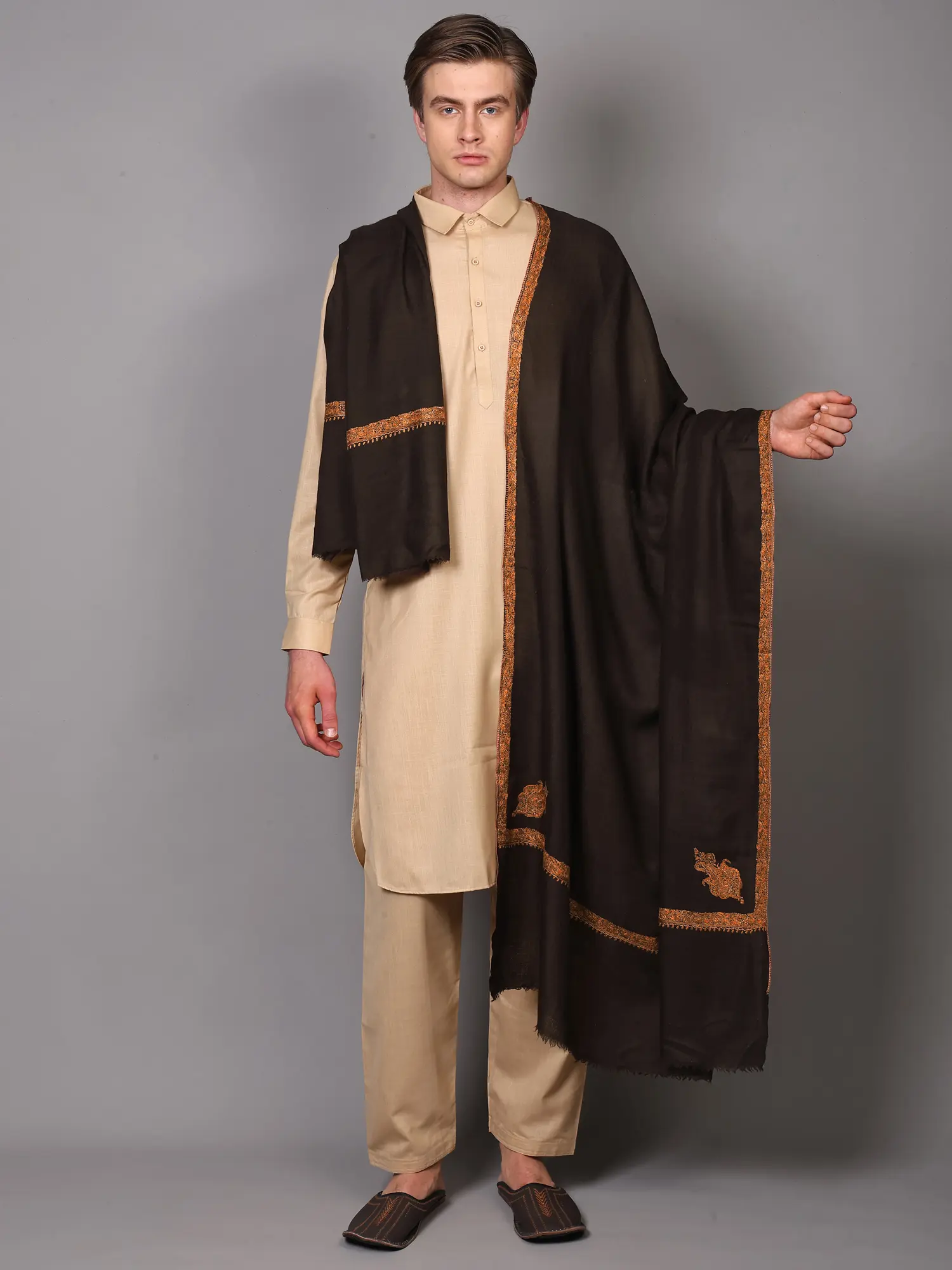 This magnificent shawl is designed to complement a variety of traditional and contemporary ensembles. Drape it over a kurta pajama for a formal occasion or add a touch of refined warmth to a more casual outfit. Its generous size allows for versatile styling, whether you prefer a classic wrap or a more relaxed drape. The deep, rich color makes it a perfect companion for evening events, cooler weather gatherings, or simply to add a touch of distinguished luxury to your everyday attire. Experience the blend of traditional artistry and modern wearability that makes this Kashmiri shawl a timeless addition to any wardrobe.