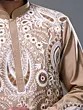 Features intricate white thread embroidery on a rich silk fabric.