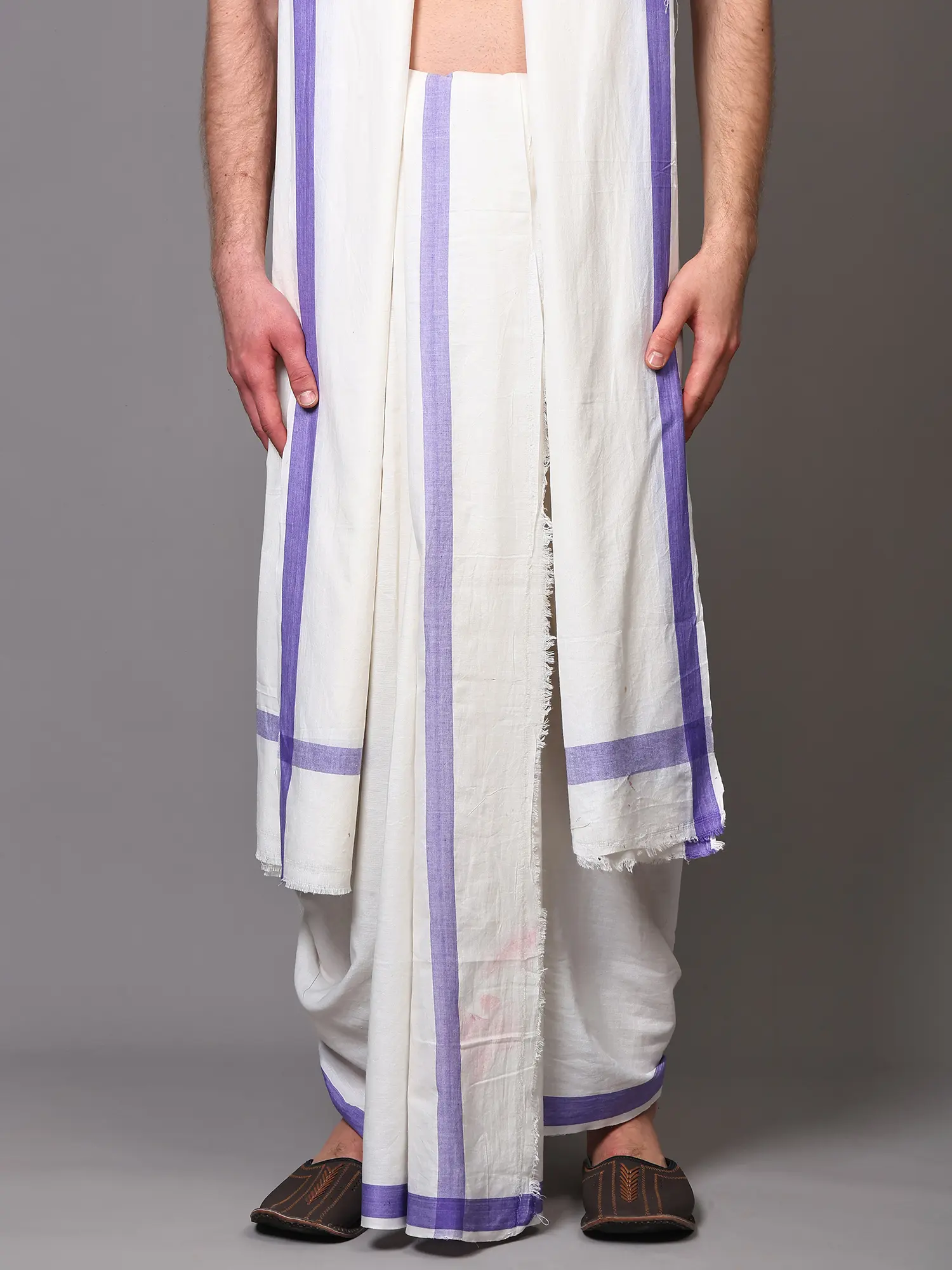 This set is more than just clothing; it's an experience. Whether you are attending religious ceremonies, cultural gatherings, festivals, or simply seeking to infuse your daily wardrobe with a touch of traditional charm, this dhoti and angavastram set is a perfect fit. The pure cotton fabric ensures it remains cool and comfortable even in warmer climates, making it a practical choice for any event. The neutral white of the dhoti and angavastram serves as a blank canvas, easily adaptable to different styling preferences and occasions. The gentle stripes provide a subtle yet distinctive accent that can be admired from afar and appreciated up close.