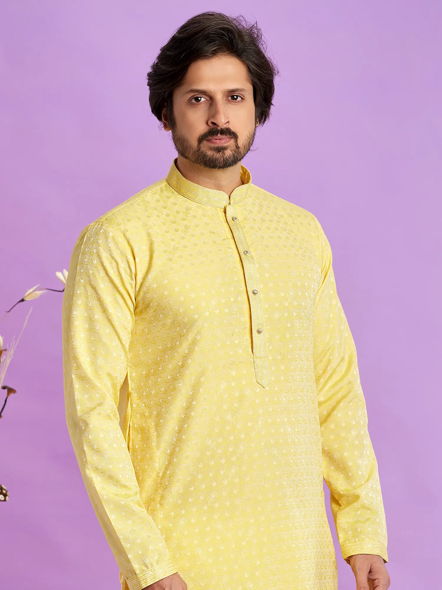 The accompanying pajama is designed for maximum comfort and ease of movement. Its relaxed fit ensures you can wear it for extended periods without any discomfort, making it ideal for long celebrations or leisurely days. The classic white color of the pajama provides a striking contrast to the vibrant yellow of the kurta, creating a balanced and visually appealing look. This kurta pajama set is incredibly versatile. It’s an excellent choice for weddings, festivals like Diwali or Eid, family gatherings, or even as elegant loungewear. You can easily dress it up with traditional accessories such as juttis or mojaris, and a statement watch to complete your festive look. For a slightly more casual vibe, pair it with modern sandals. Its adaptability makes it a valuable addition to any discerning wardrobe. The vibrant yet soothing yellow hue of the kurta is reminiscent of sunshine and joy, making it a perfect choice for celebrations and events where a cheerful disposition is desired. The Art Soft Silk fabric ensures that the color remains rich and vibrant, wash after wash. Experience the perfect blend of traditional charm and contemporary elegance with this stunning kurta pajama set.