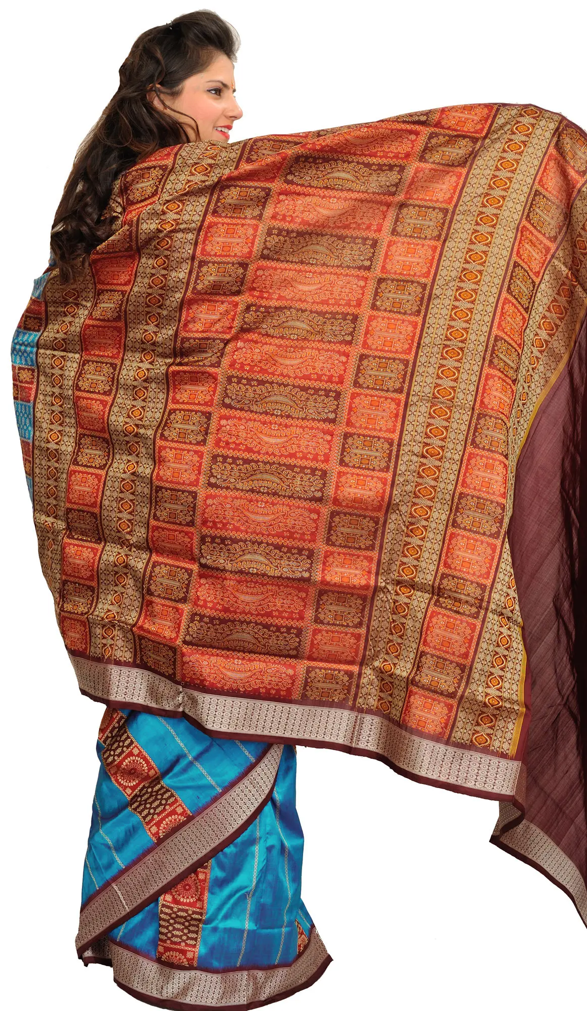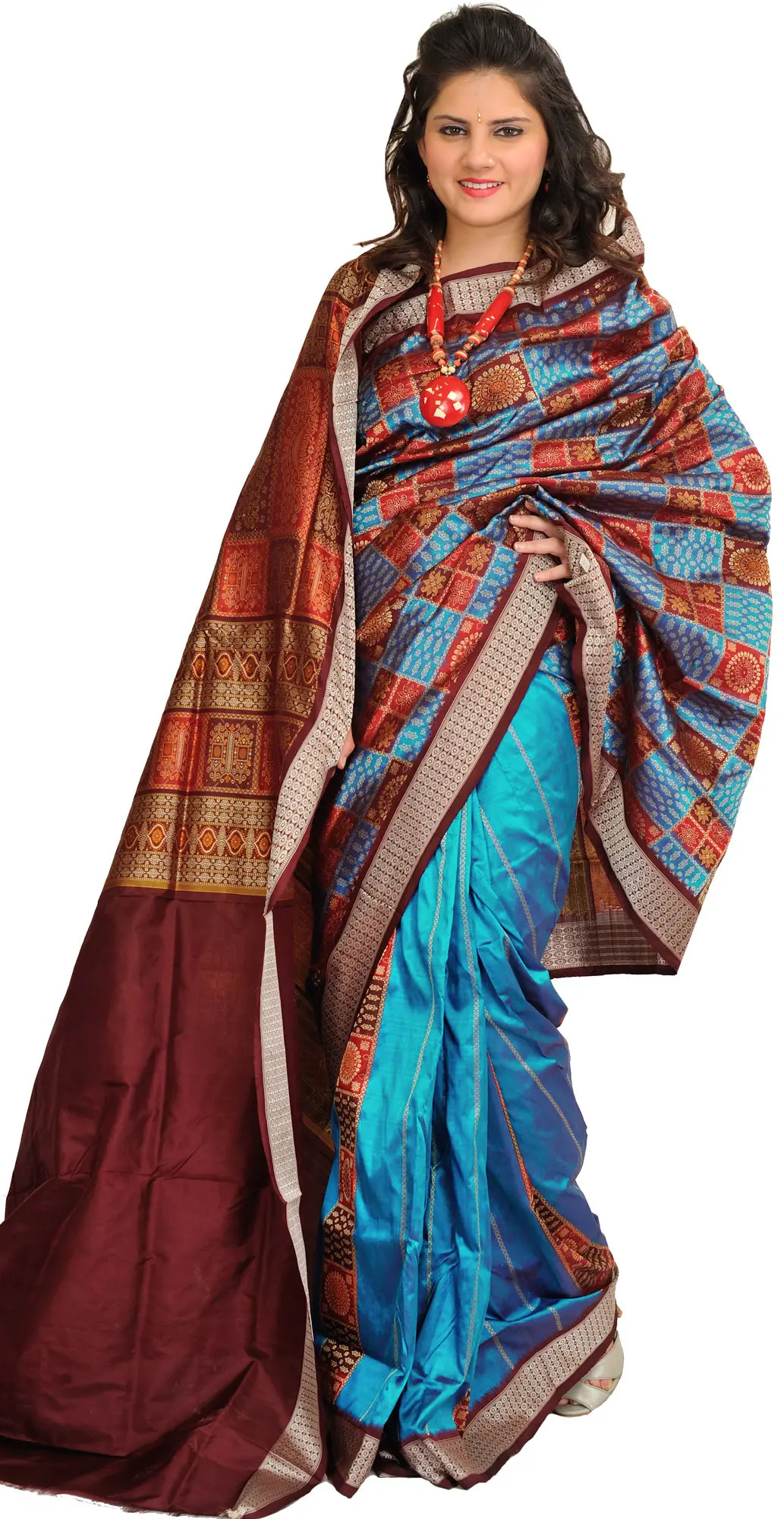 A luxurious drape from the Eastern state of Odisha, the Bomkai saree carries the tale of intricate techniques in its enchanting patterns. This blue and maroon Bomkai saree has the regalia of silk, embellished with classical ornate patterns that give Bomkai its cherished appeal. Floral patterns and tiny motifs fill the entire field of the saree, with the patterns growing thicker on the pallu. Made by putting colored silk threads together in the technique of Ikat weaving, Bomkai is a timeless drape that can be passed from one generation to the other, as a piece of Indian tradition that never goes out of style.