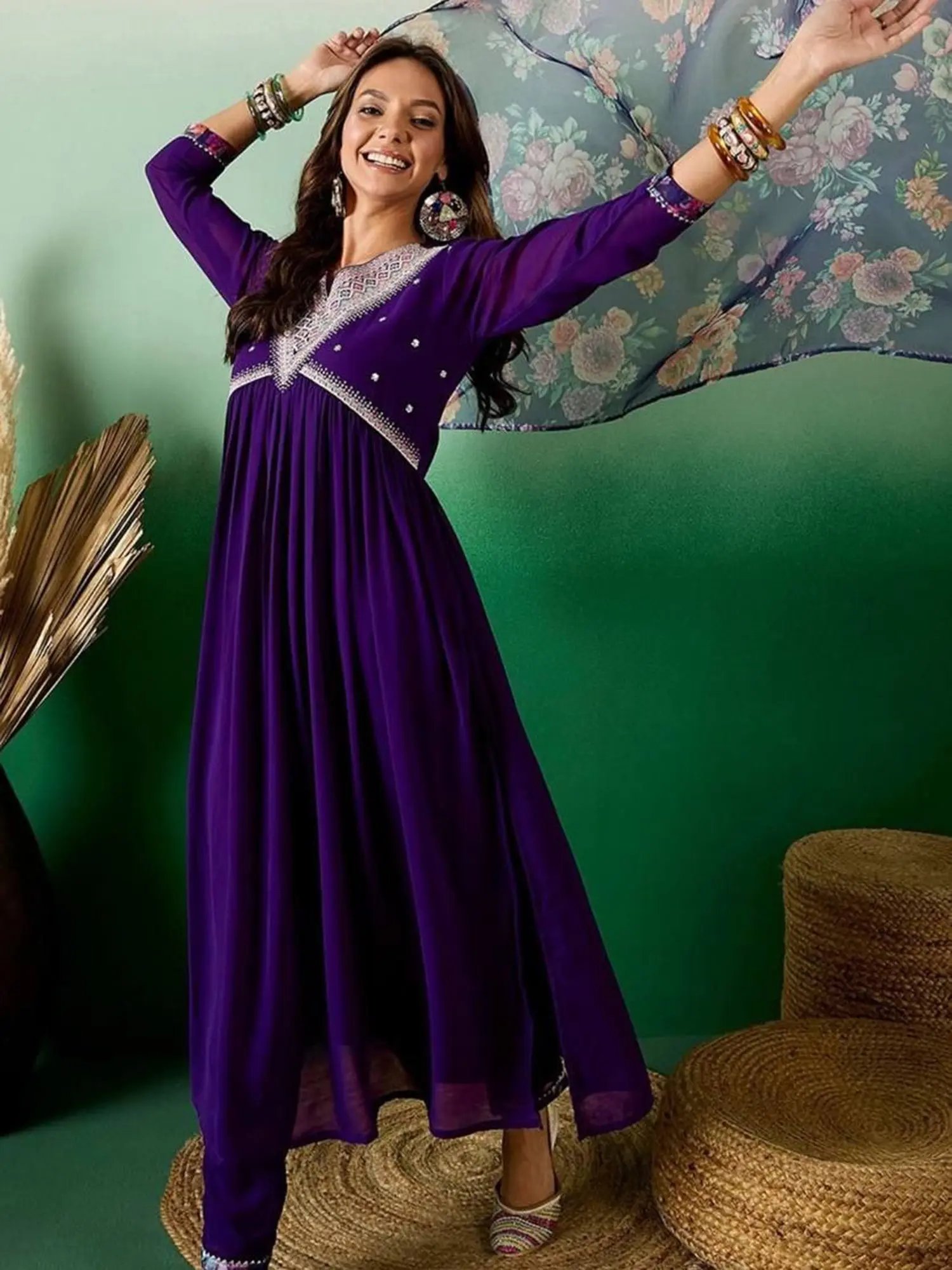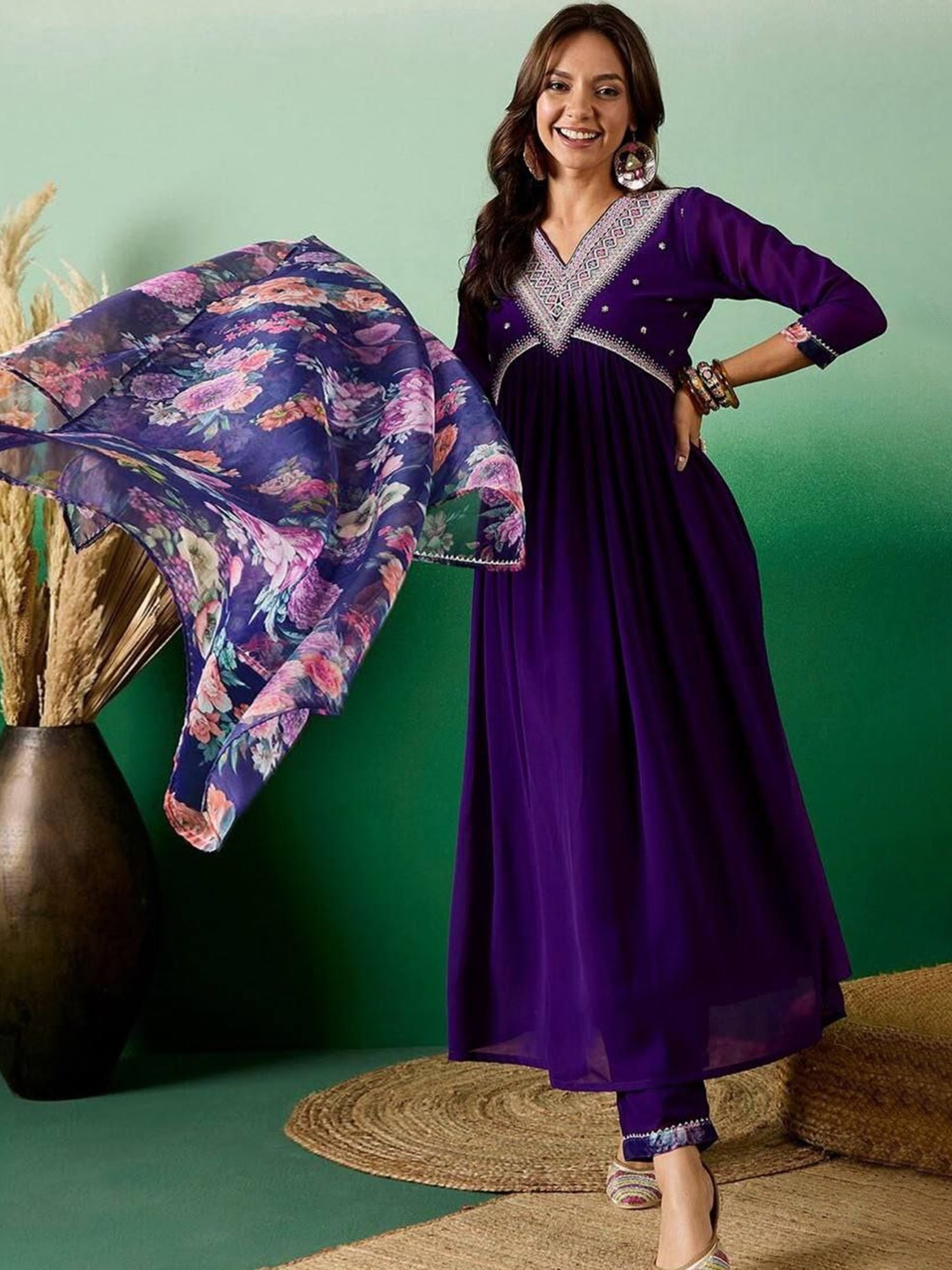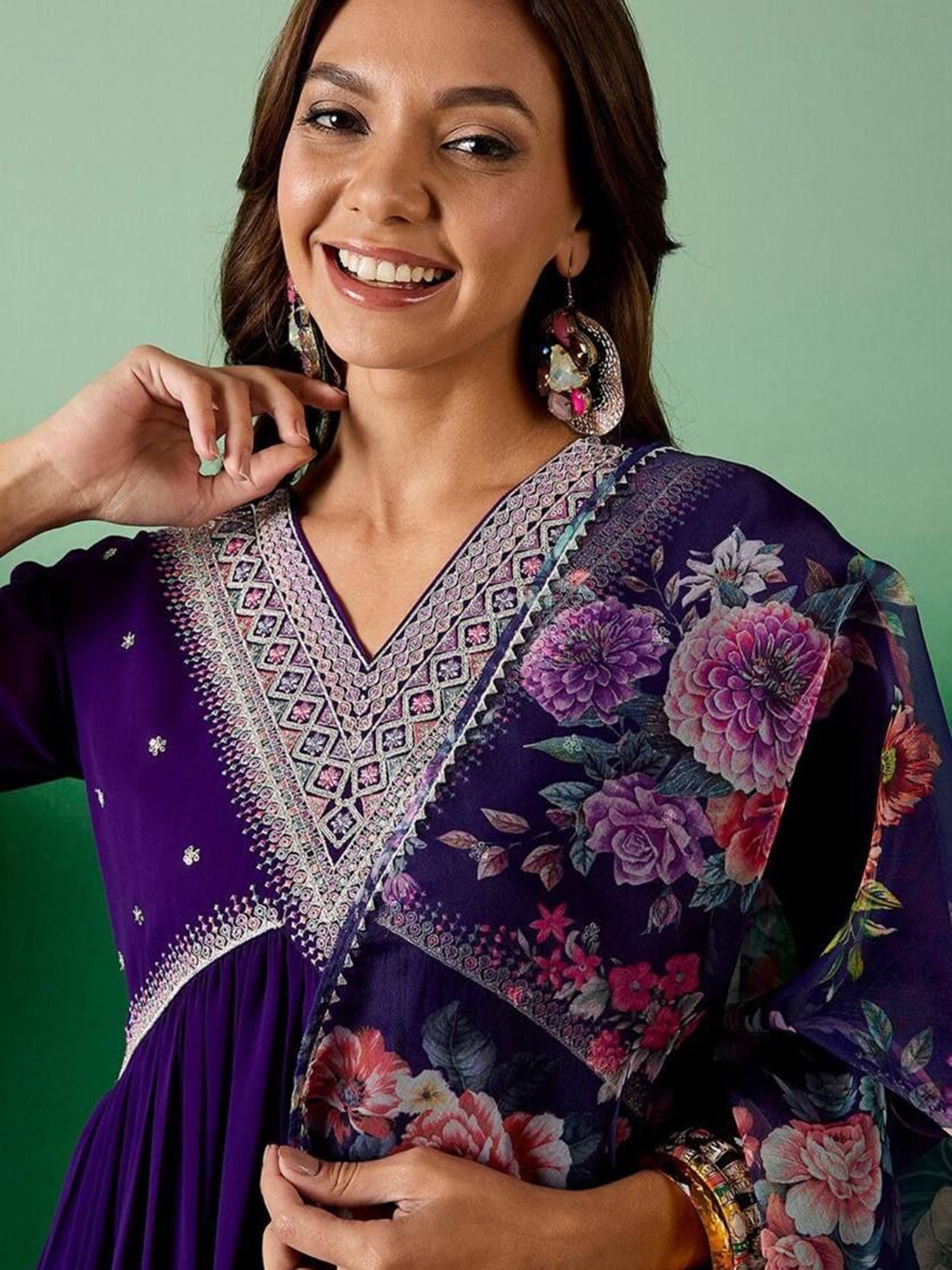 Stunning Viscose Chanderi Embroidery Work Kurta Set With Floral Print Dupatta