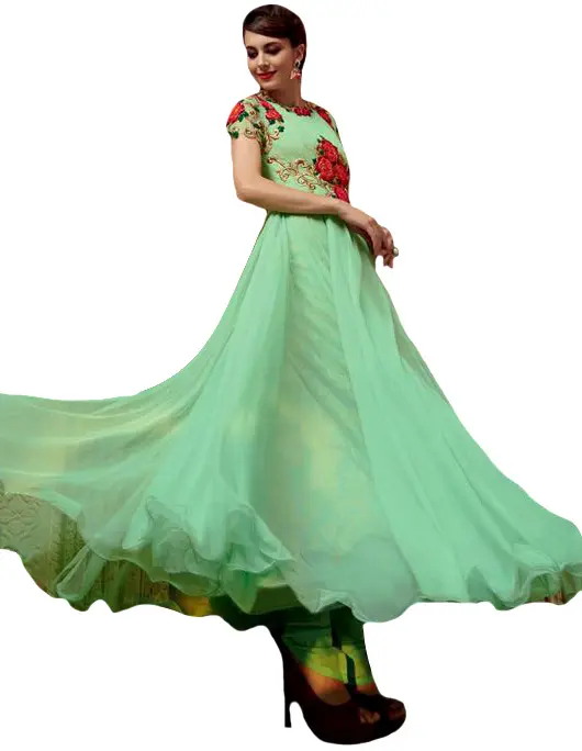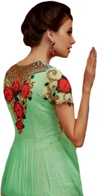 Carry the beauty and charm of blossoms in your style, with this Mint-green designer gown. The delicate and flowy net fabric used in this attire gives it a beautiful and dreamy appeal. Exquisite peach, red, green, and golden threads create rich floral embroidery on the neckline, torso, sleeves, and back of the gown. A perfect union of soft shade and intricate threadwork, this is a dress to twirl in on special occasions.