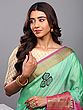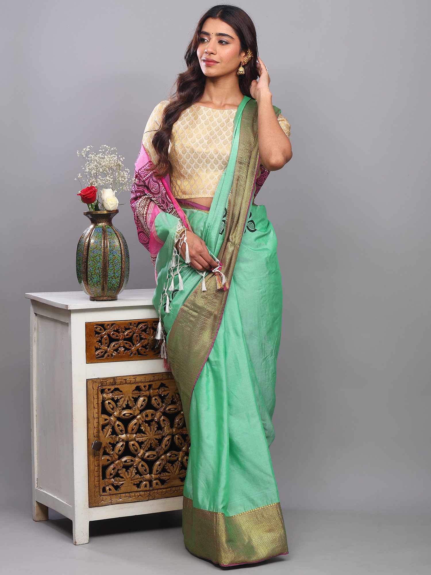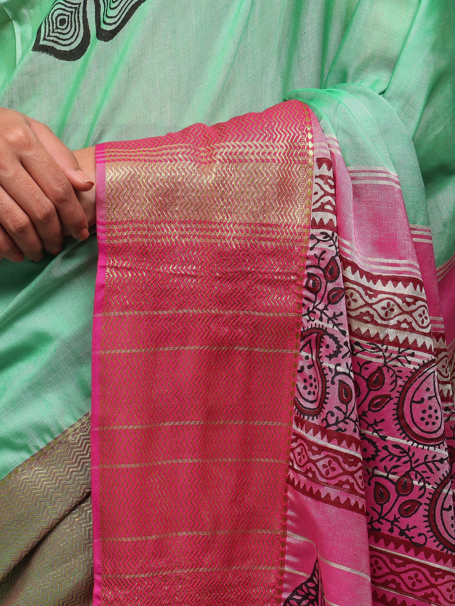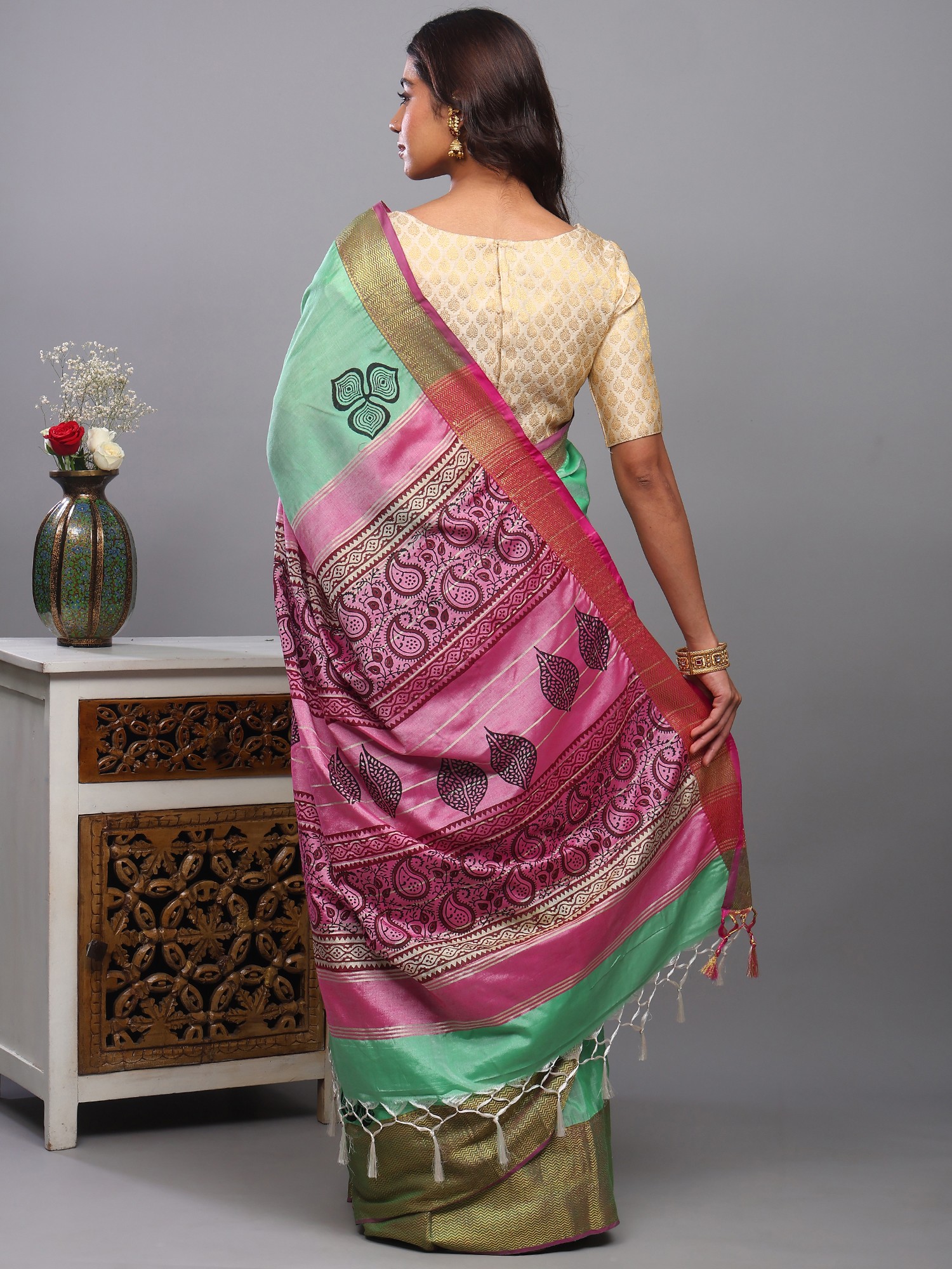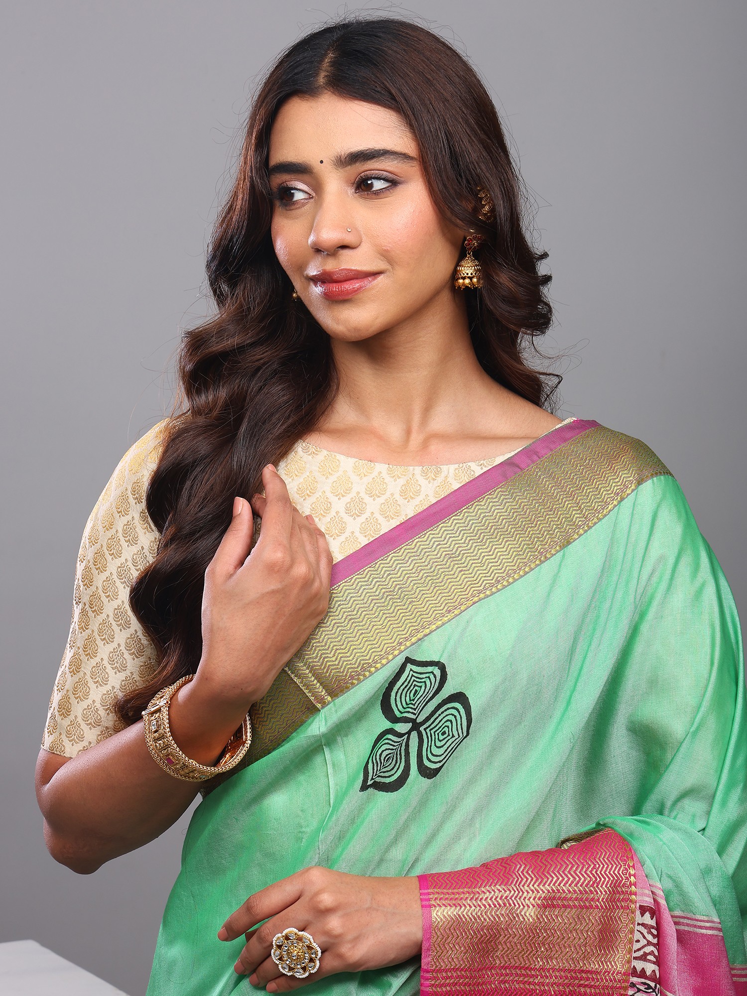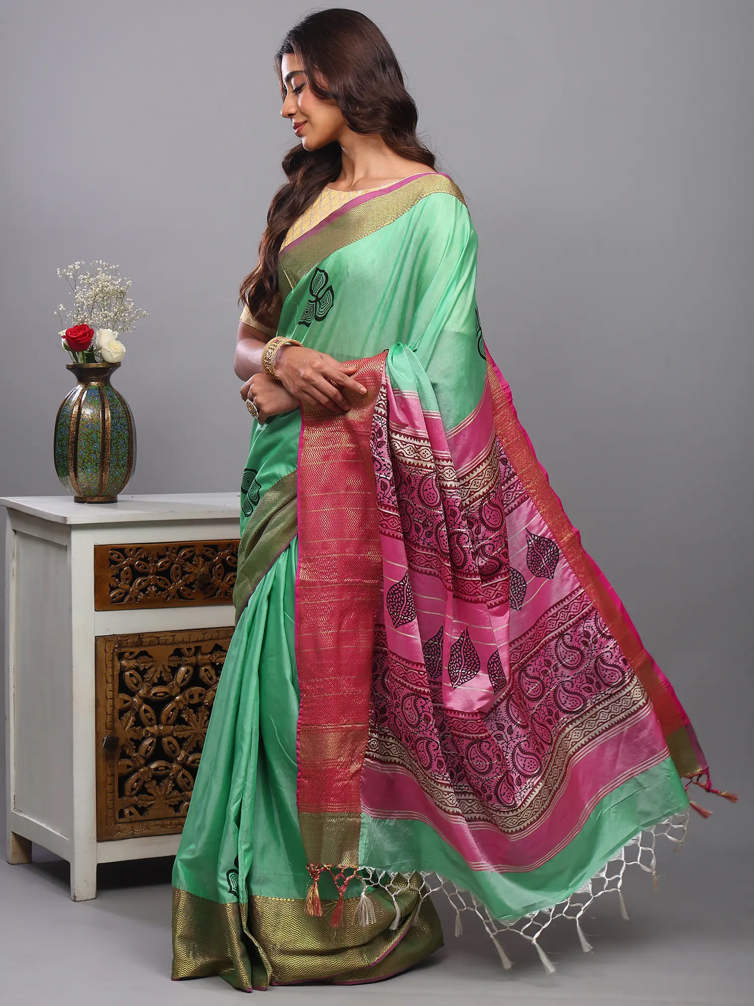 Green-Lily Floral Printed Saree with Tasseled Pallu and Wide Border