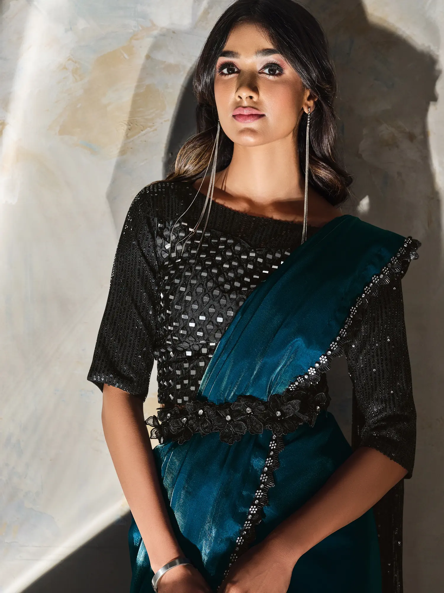 This saree boasts a unique and eye-catching design. The vibrant teal base is a perfect complement to the dramatic black sequined pallu, which features a beautiful drape with delicate designer tassels at the ends adding a touch of playful elegance. The mirror and sequin work on the pallu offers a stunning visual effect that catches the light with every movement. A matching black sequin embroidered belt cinches the waist, enhancing the saree's silhouette and adding a touch of modern flair to the traditional design. The saree is complete with a half-sleeved black sequin blouse, perfectly coordinating with the overall aesthetic. The intricate detailing showcases true craftsmanship and attention to detail, creating a truly unforgettable piece.