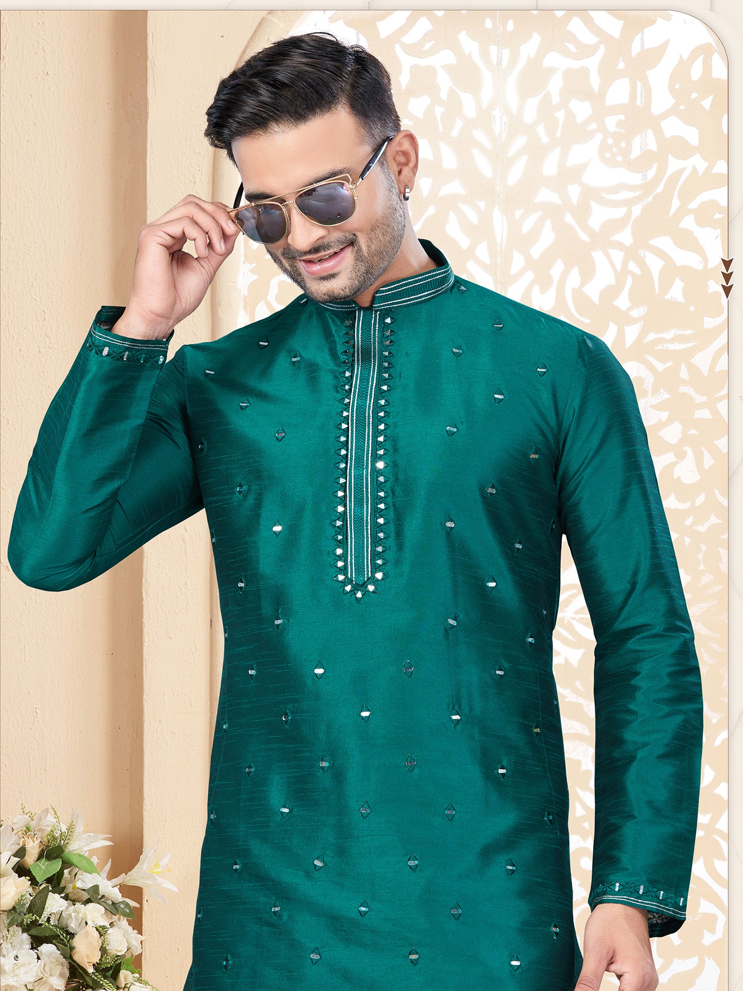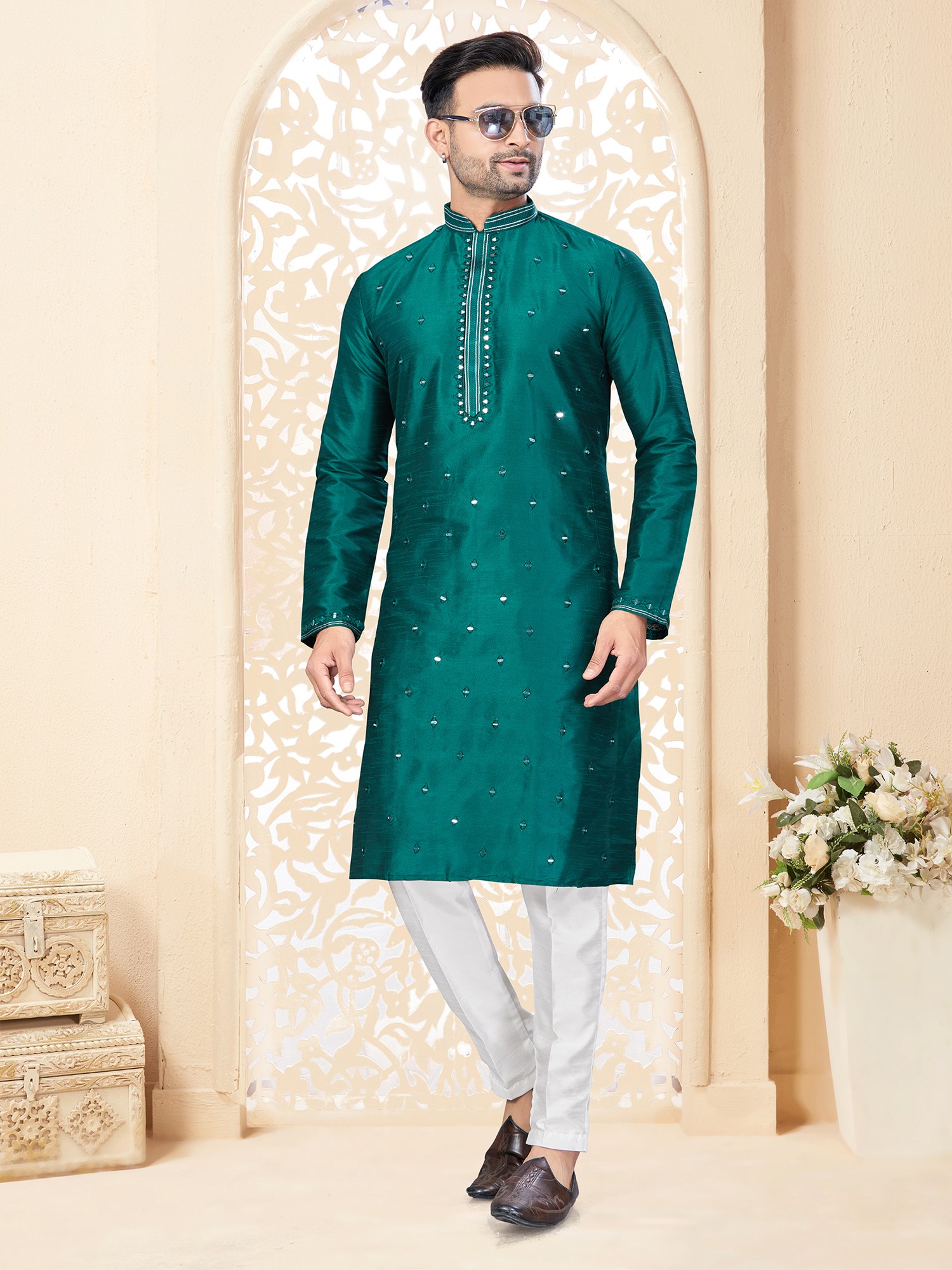 Attractive Mirror Work On Neck Mandarin Collar Art Silk Kurta With Pajama
